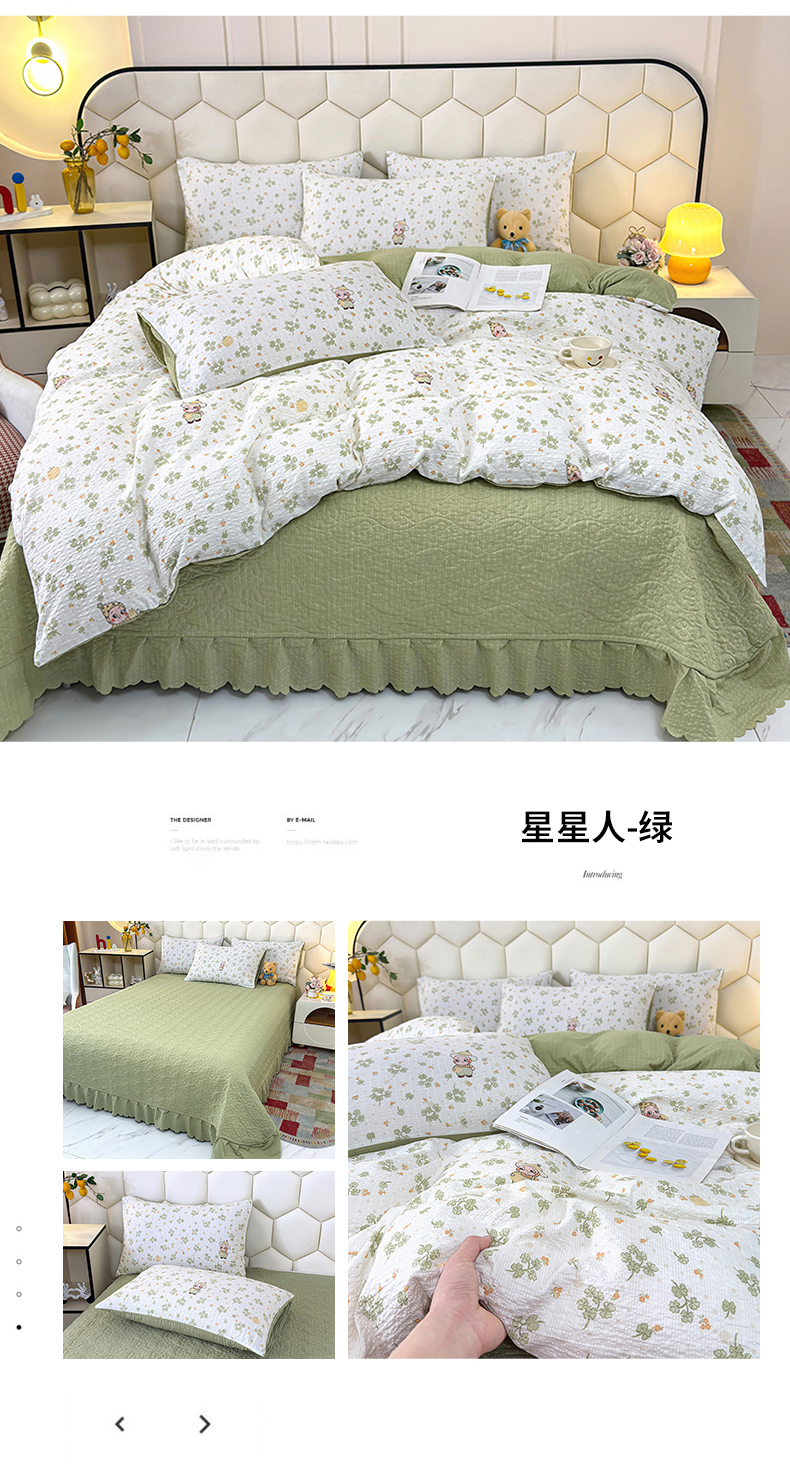 商品名称:栩裕纺织 2026新款云感双层纱床盖四件套 星星人-绿