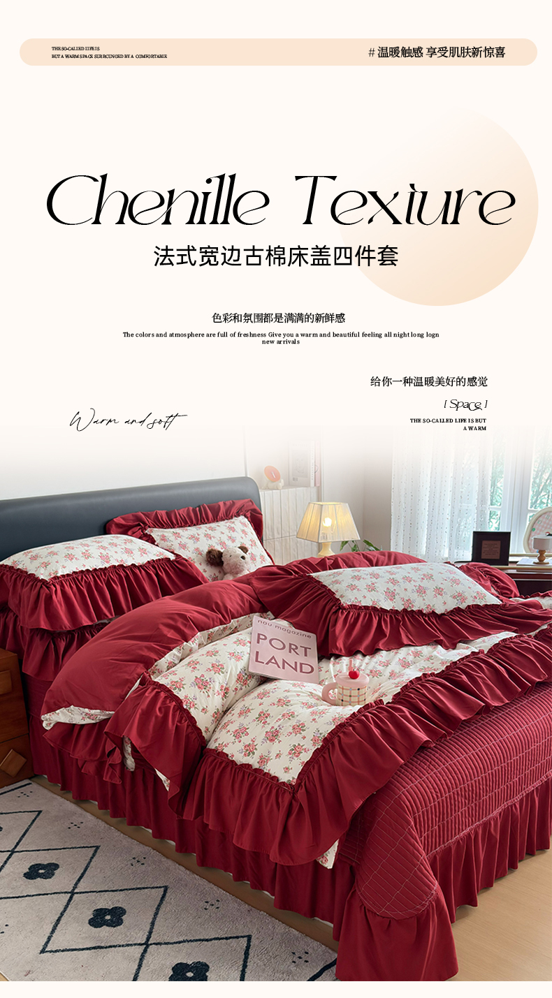 商品名称:梵克保罗 2026新款韩系古法韩国水洗棉云感棉法式浪漫大花边床盖四件套 粉雾波点