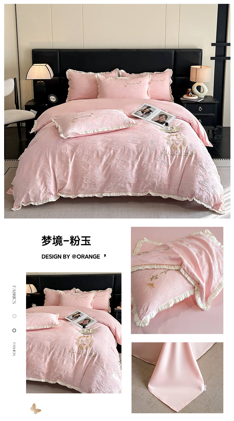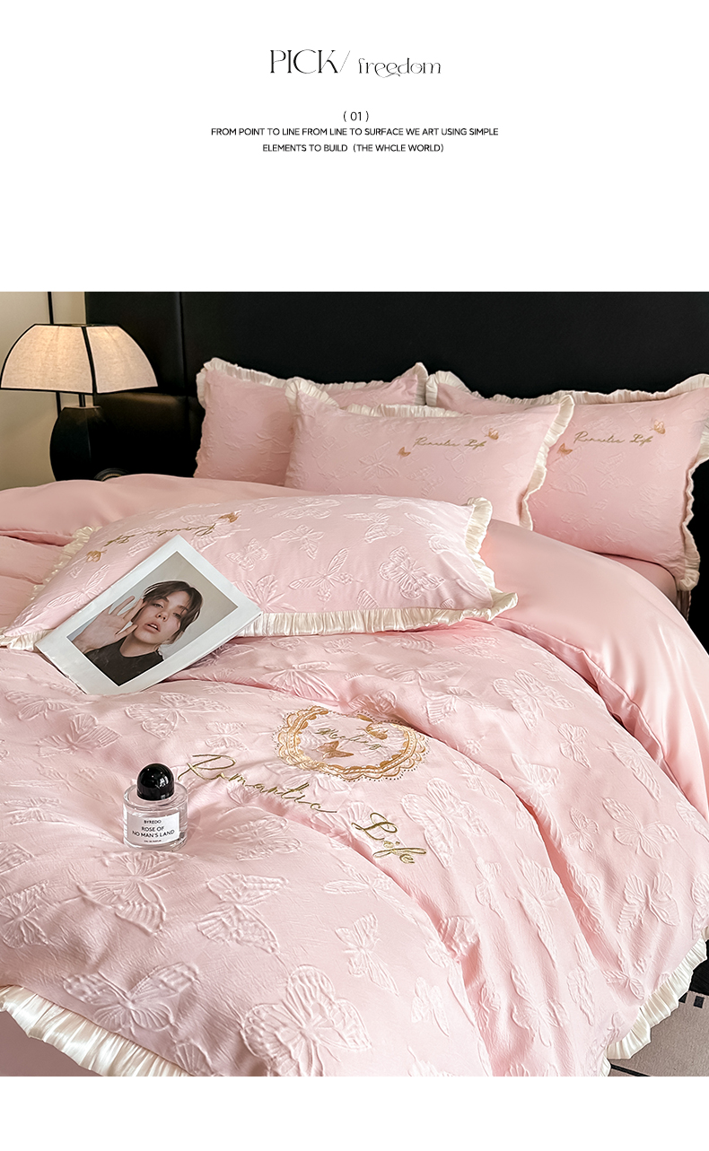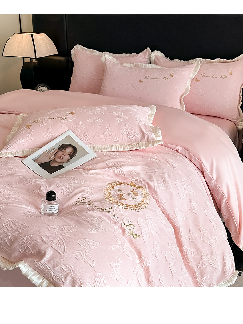 当前位置: 91家纺网 > 商品网购 > 床品套件 > 四件套 > 水洗真丝四件套 > 宇航家纺 2026新款浮雕花边水洗真丝四件套-梦境 梦境-天蓝