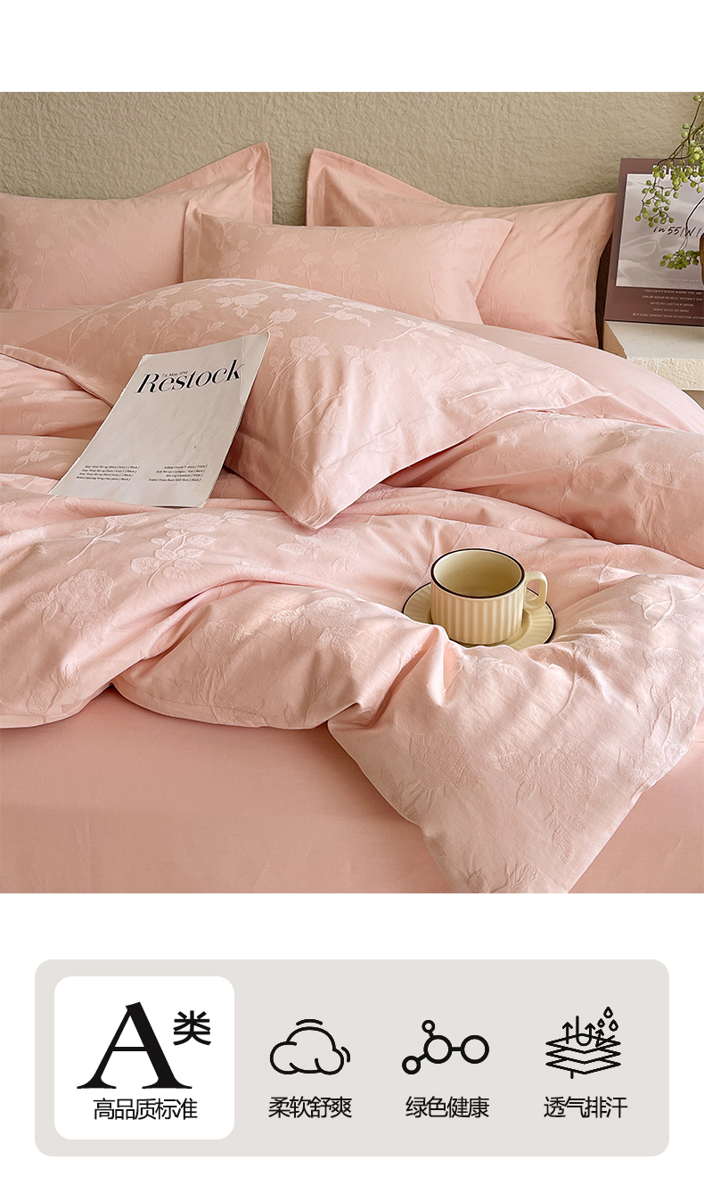 宜家坊 2026新款A类全棉纯棉亮面浮雕提花四件套 岁月留声-唯美粉