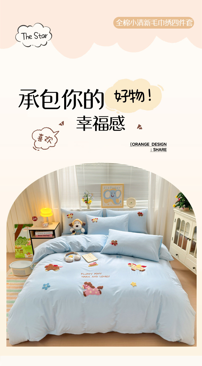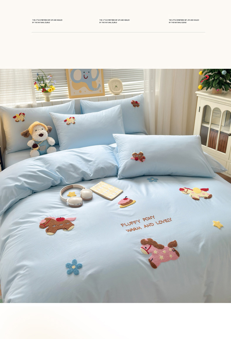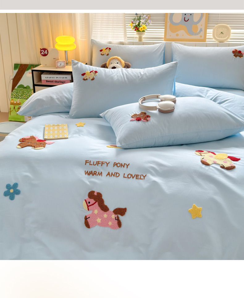 如意朵 2026新款全棉小清新绣花四件套第一批 快乐小马蓝