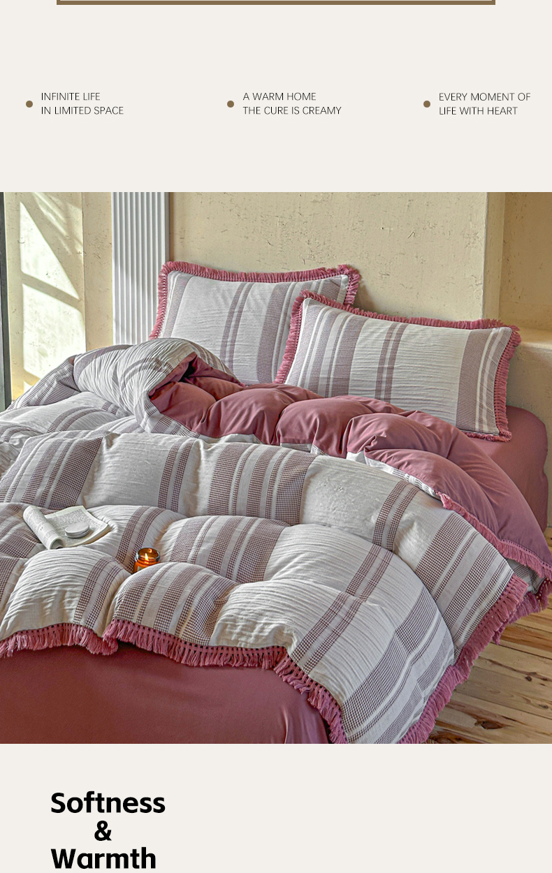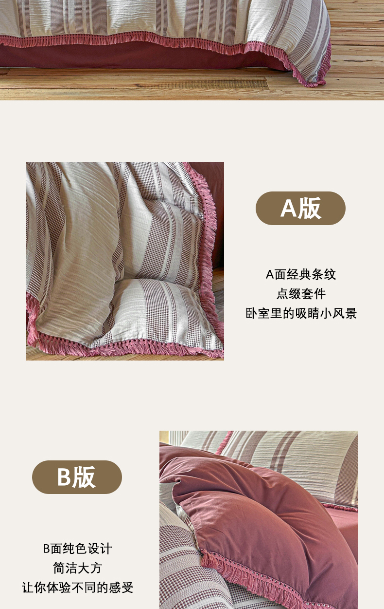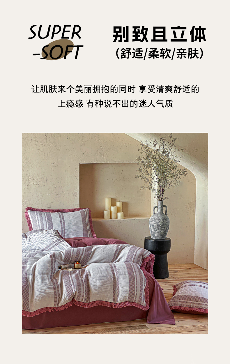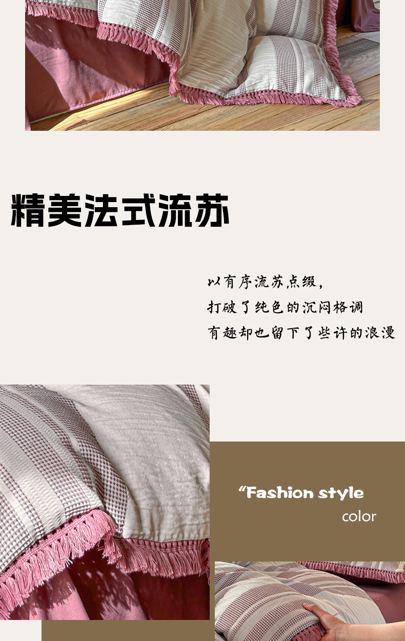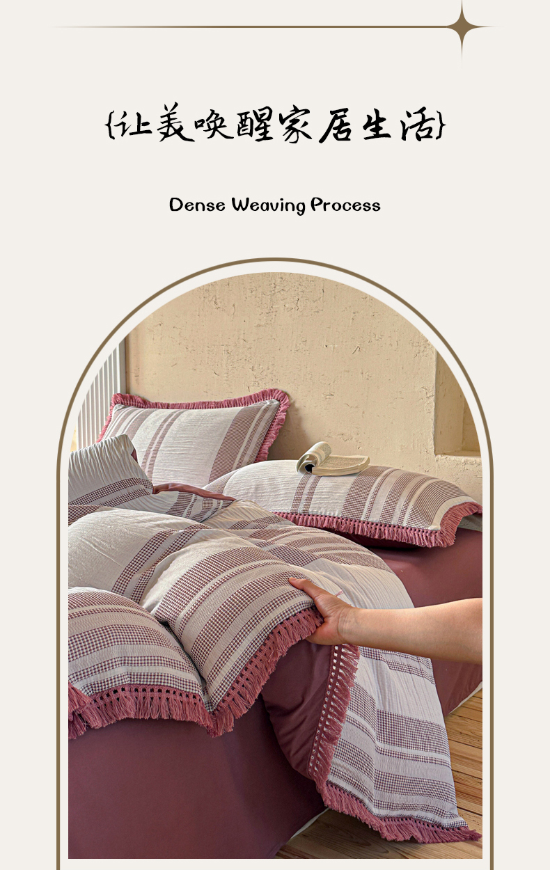 当前位置: 91家纺网 > 商品网购 > 床品套件 > 四件套 > 色织四件套 > 缘生活 2026新款色织提花双层纱华夫格流苏四件套 双工艺流苏-豆沙红