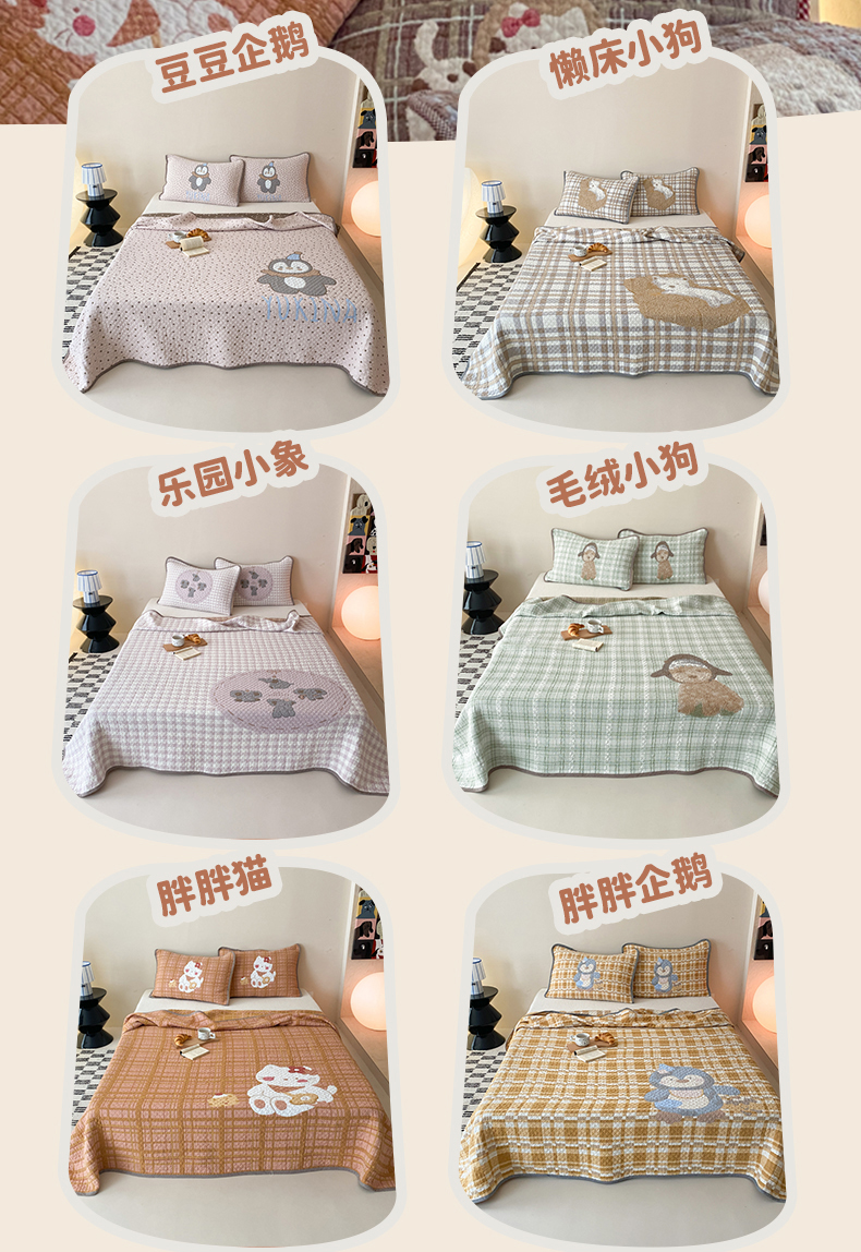(总)麻依 2026新款软萌纱布床盖三件套系列,斑点小猫,博美,豆豆企鹅,懒床小狗,乐园小象,毛绒小狗,胖胖猫,胖胖企鹅,桃心KT,玩耍小咪,香蕉小猫,杂技萌宠,组合