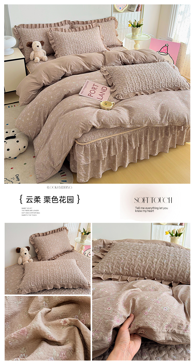 商品名称:铠畅 2026新款泡芙纱皱皱棉床裙款四件套 云柔 栗色花园