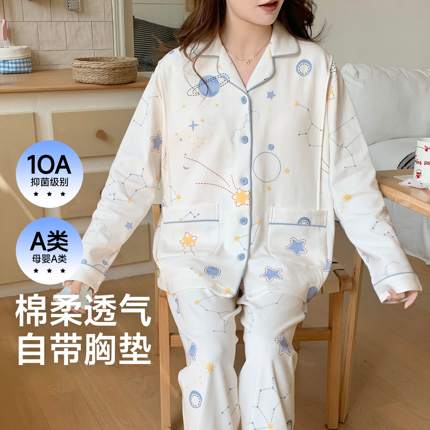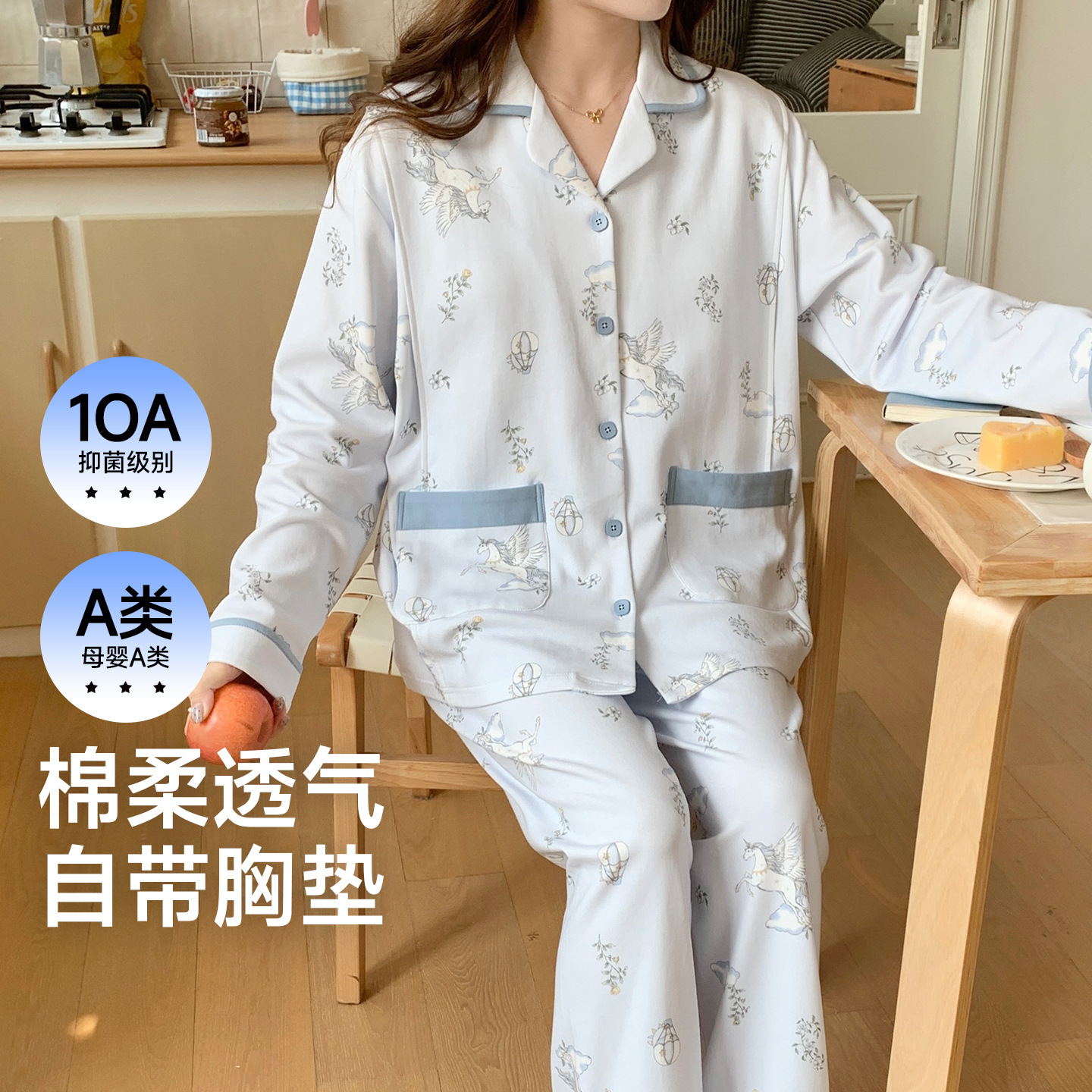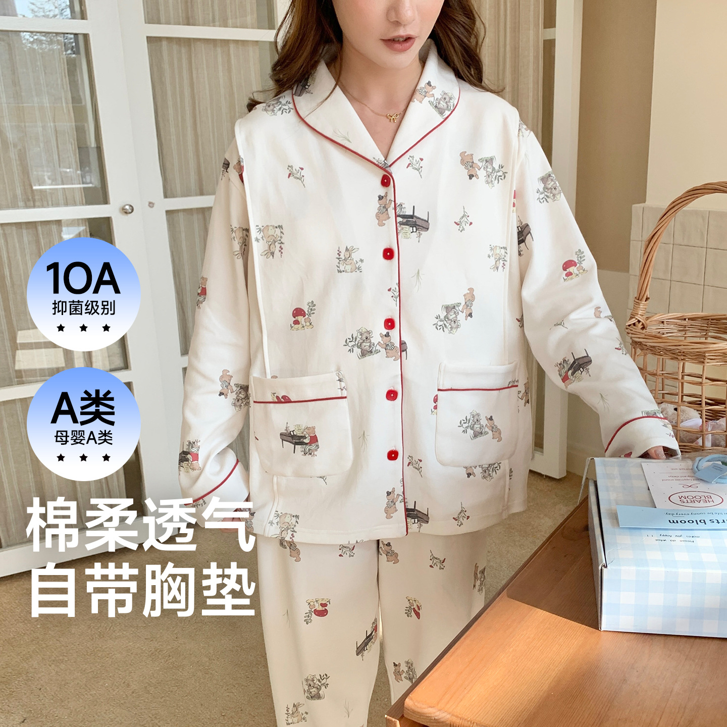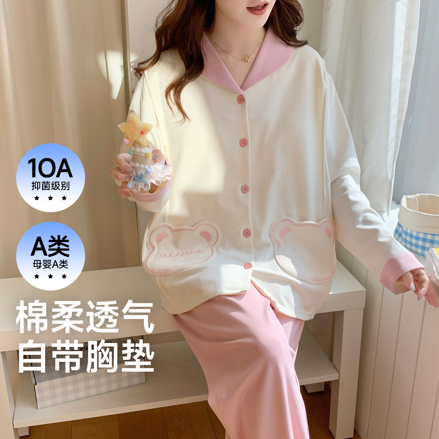 (总)洛兰沙家居馆 细纱拉架纯棉10A抗菌月子服春夏季带胸垫孕期产后哺乳A类孕妇睡衣