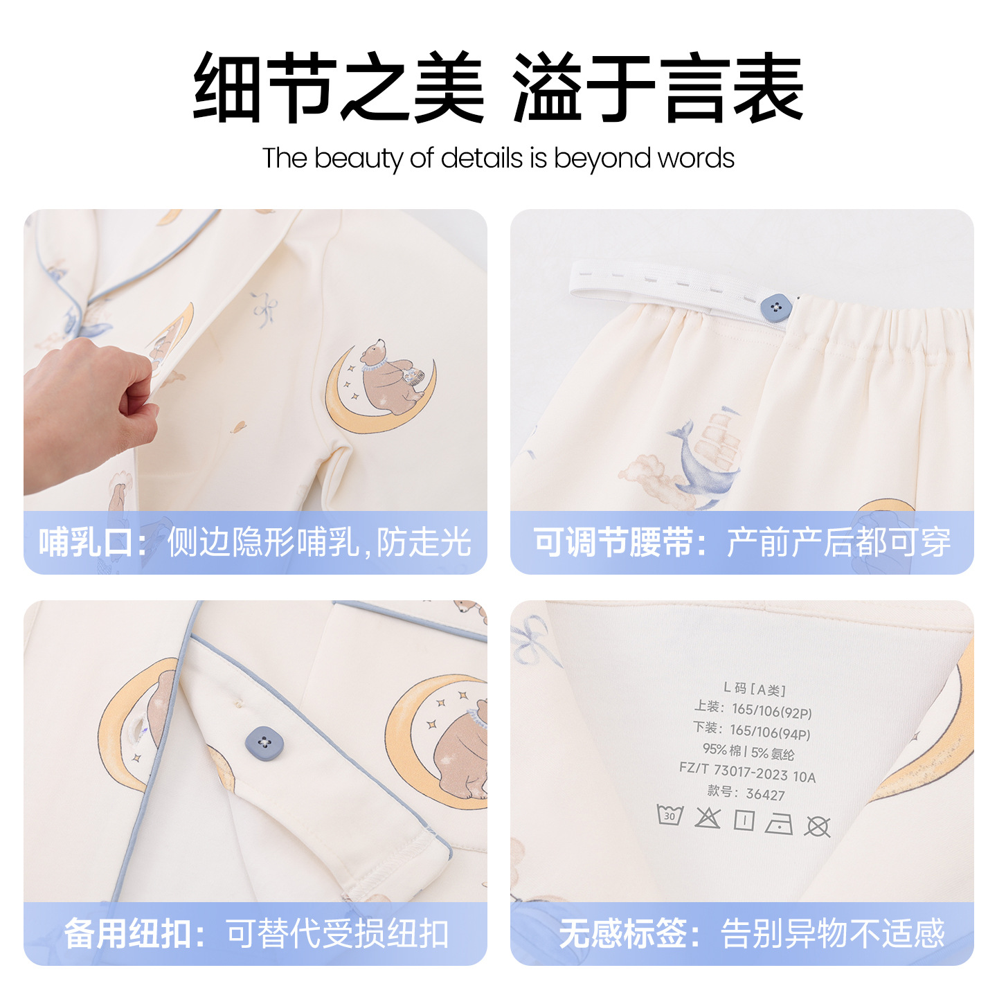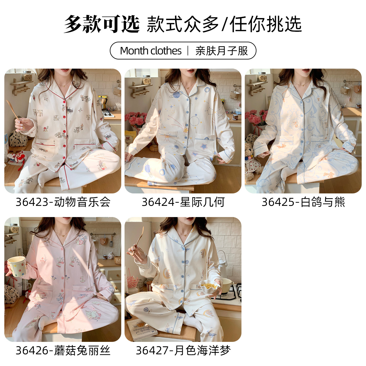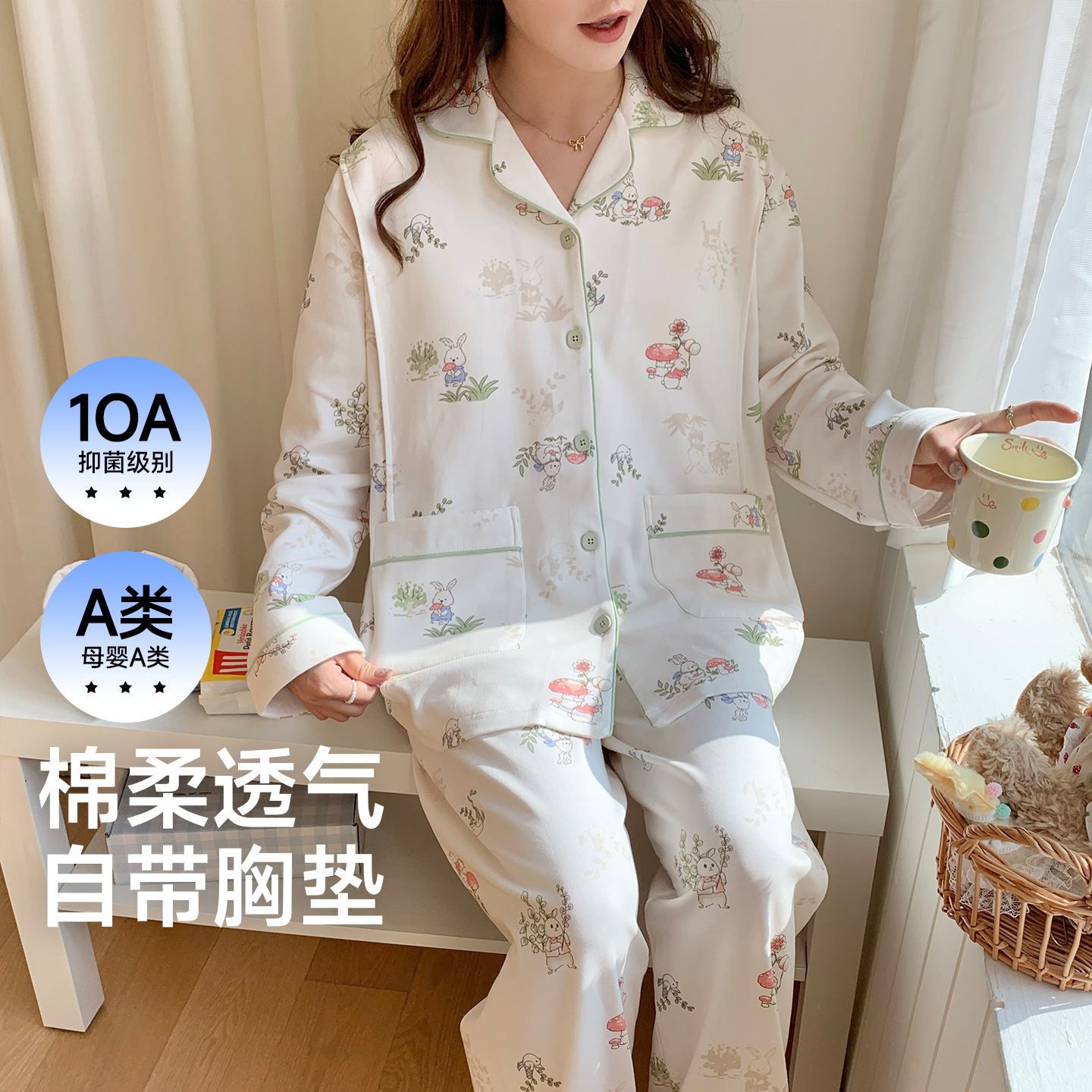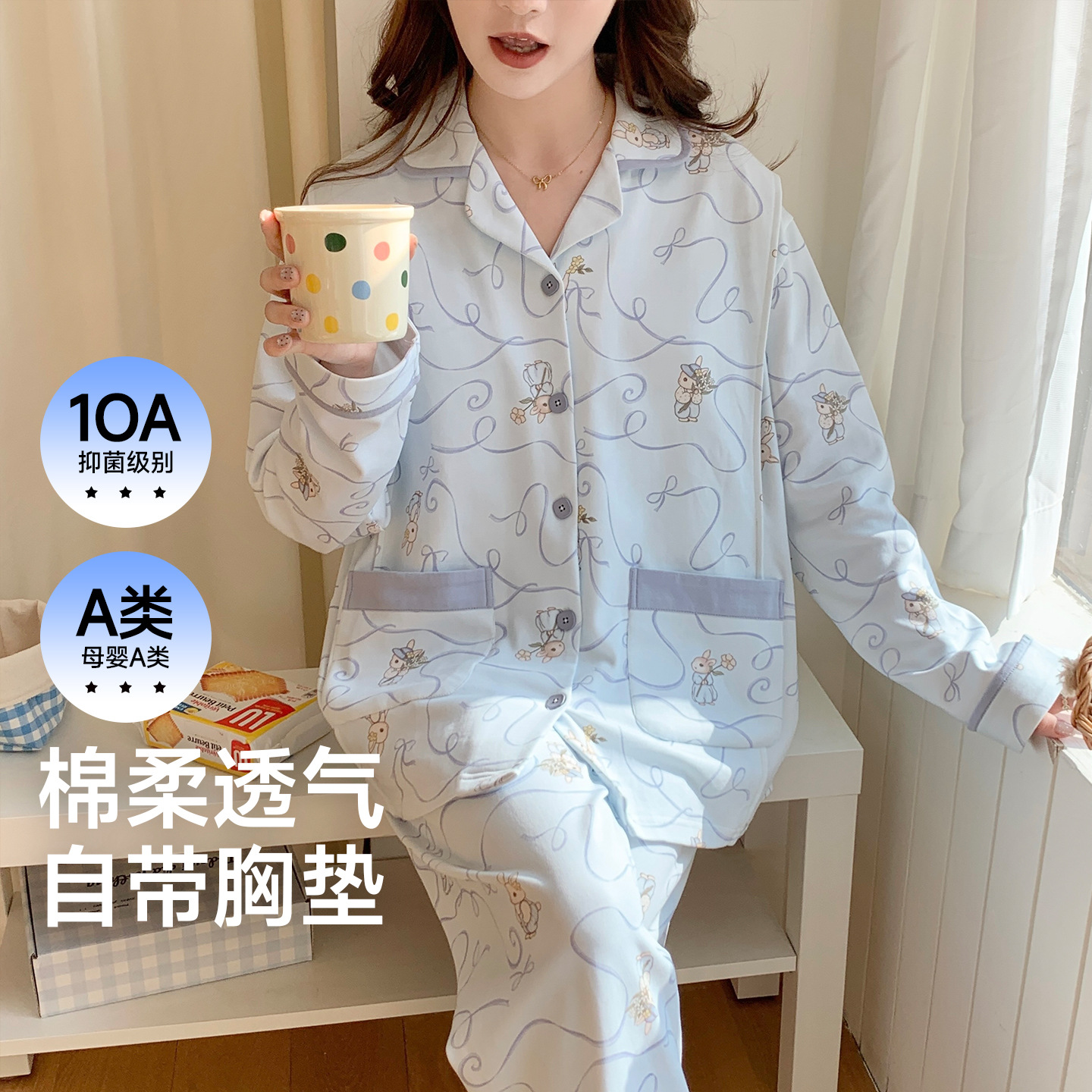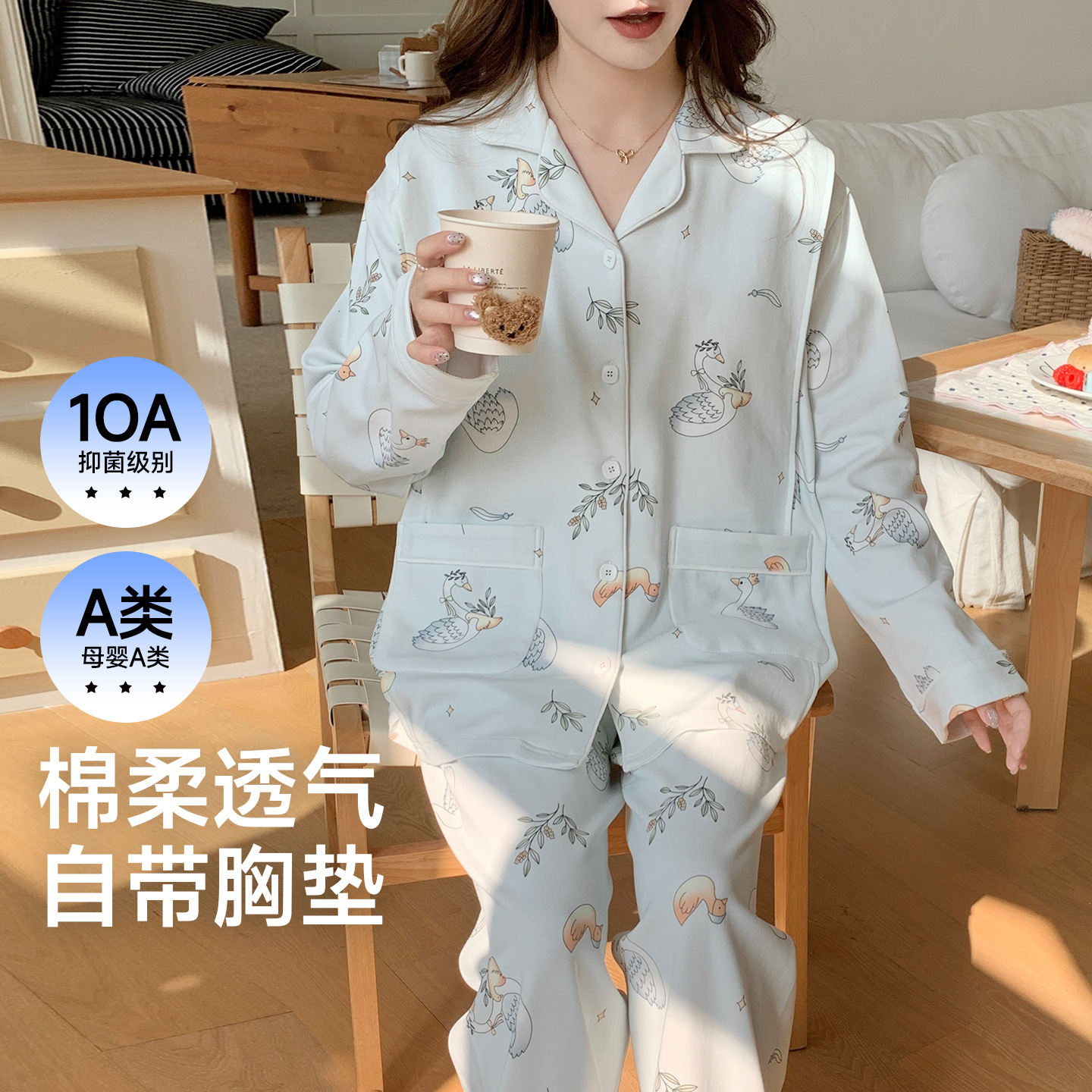 (总)洛兰沙家居馆 细纱拉架纯棉10A抗菌月子服春夏季带胸垫孕期产后哺乳A类孕妇睡衣