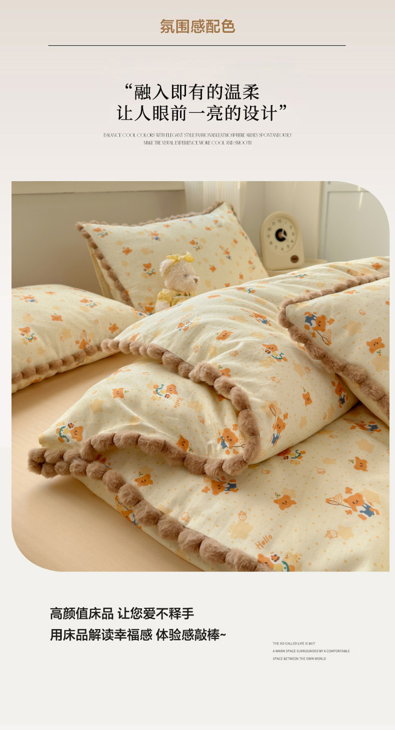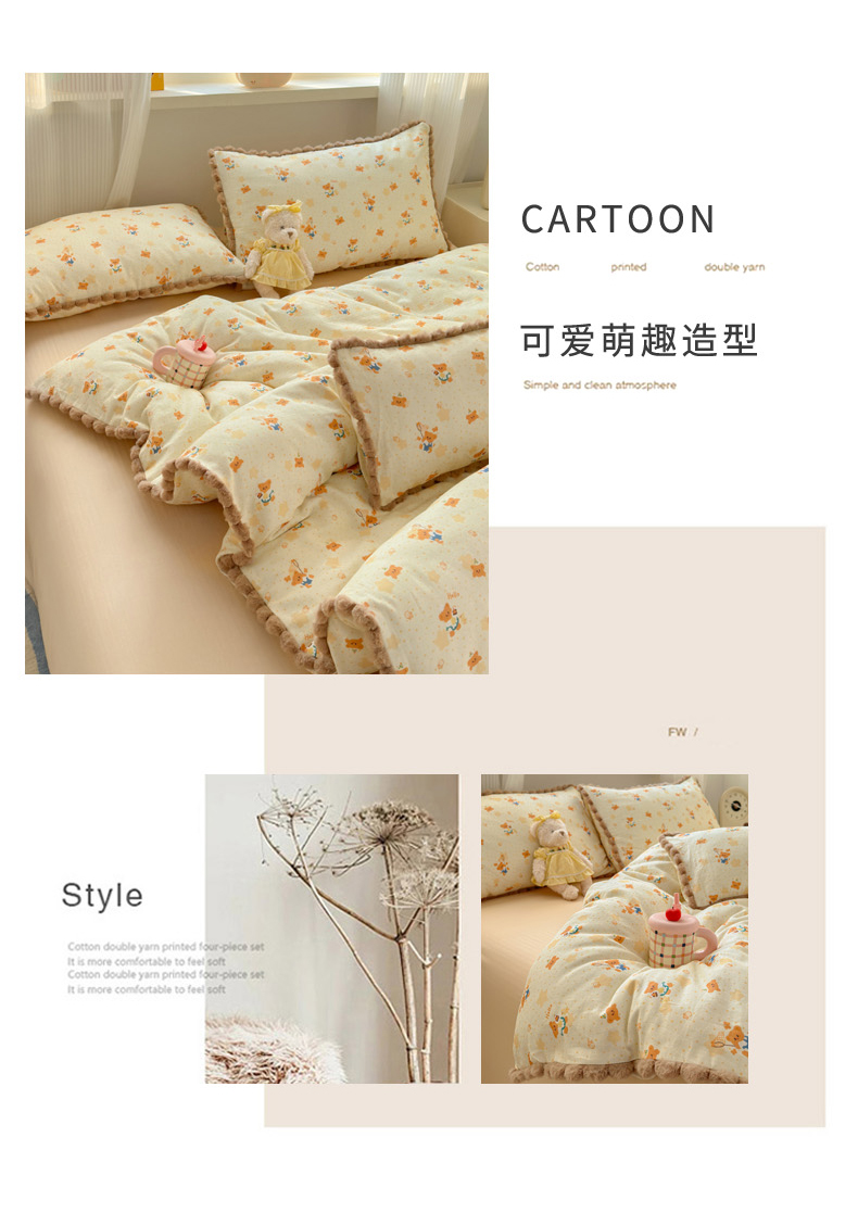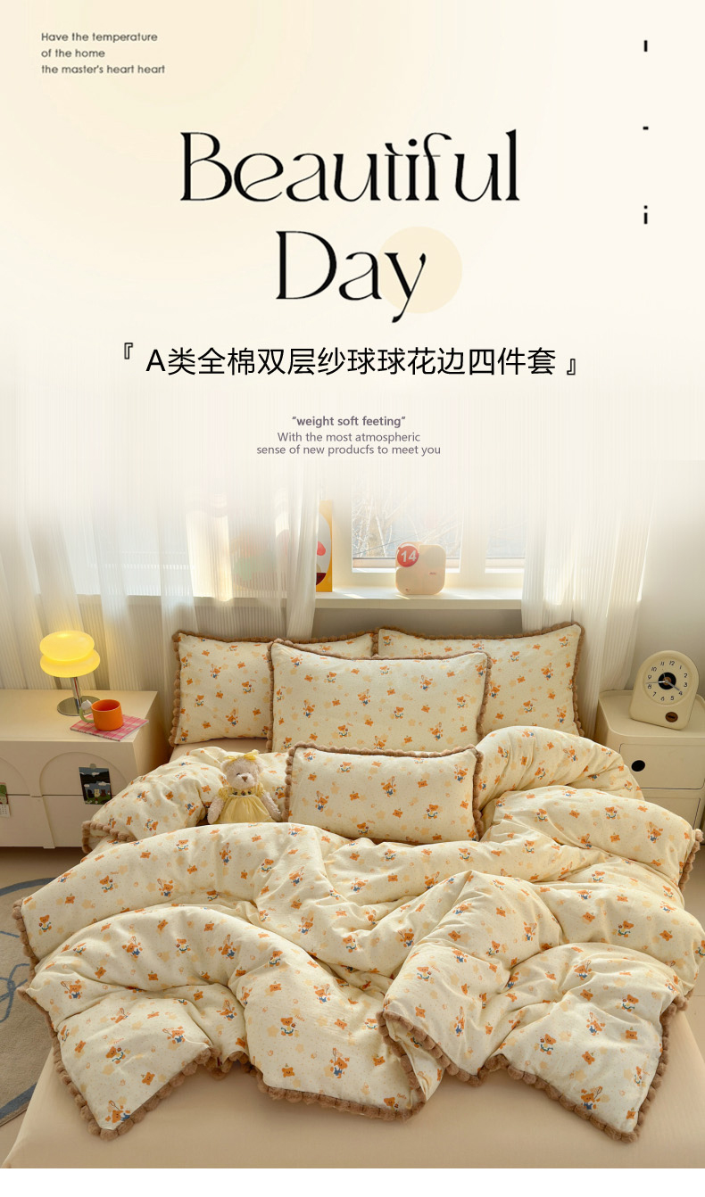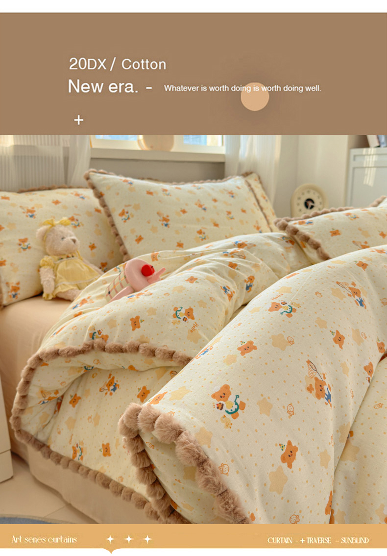 当前位置: 91家纺网 > 商品网购 > 床品套件 > 四件套 > 全棉普通四件套 > 丽涵家纺 2026新款全棉双层纱全棉纯棉大雁纹毛球花边四件套 小熊郊游
