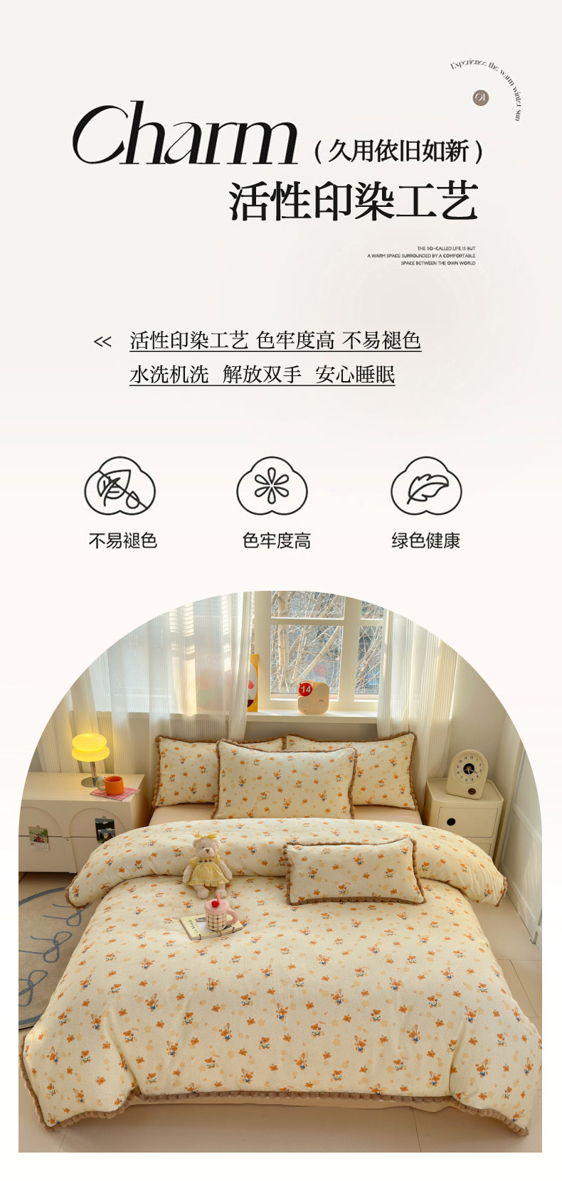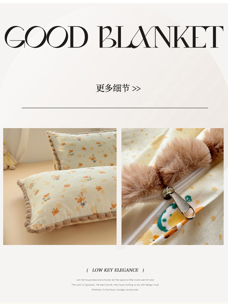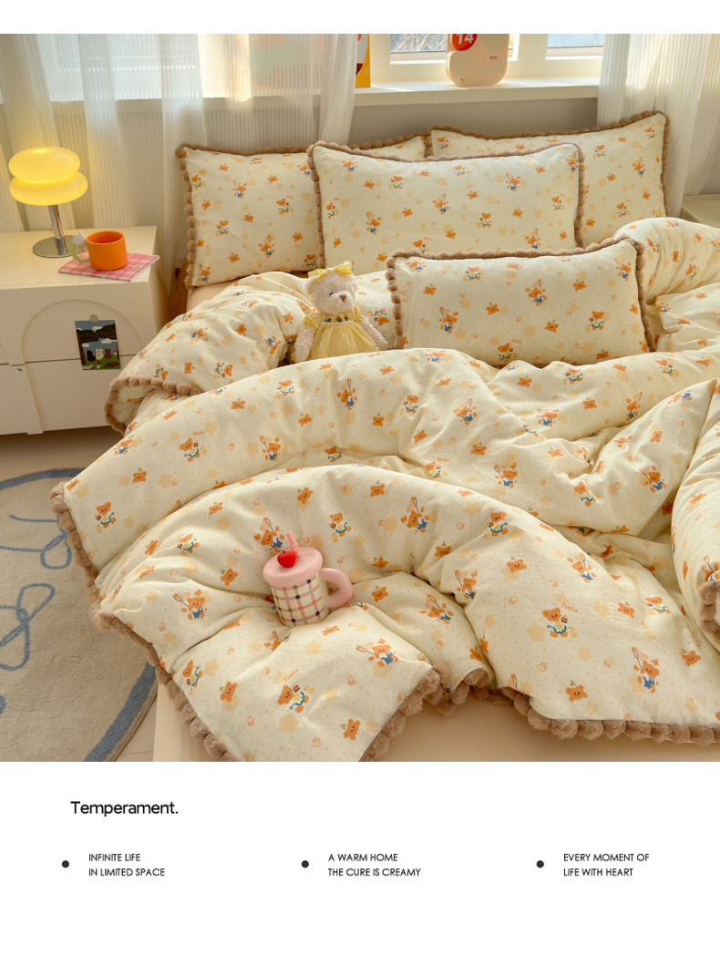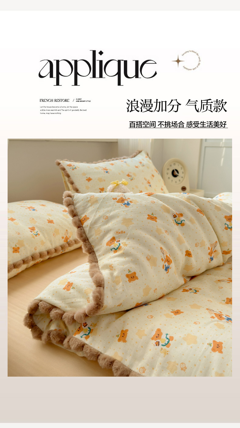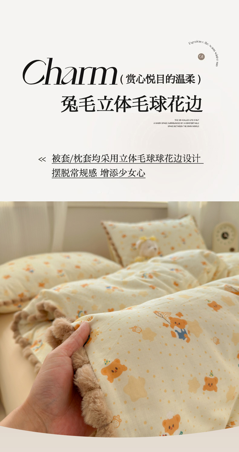 当前位置: 91家纺网 > 商品网购 > 床品套件 > 四件套 > 全棉普通四件套 > 丽涵家纺 2026新款全棉双层纱全棉纯棉大雁纹毛球花边四件套 小熊郊游