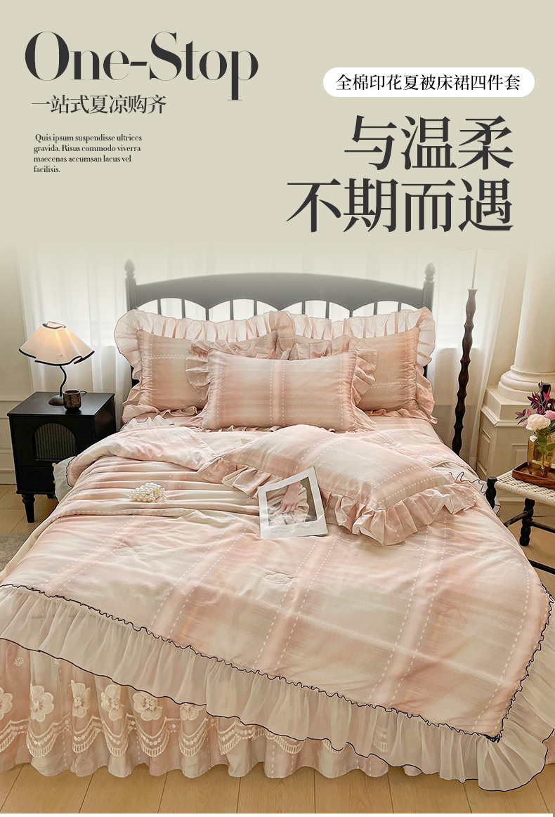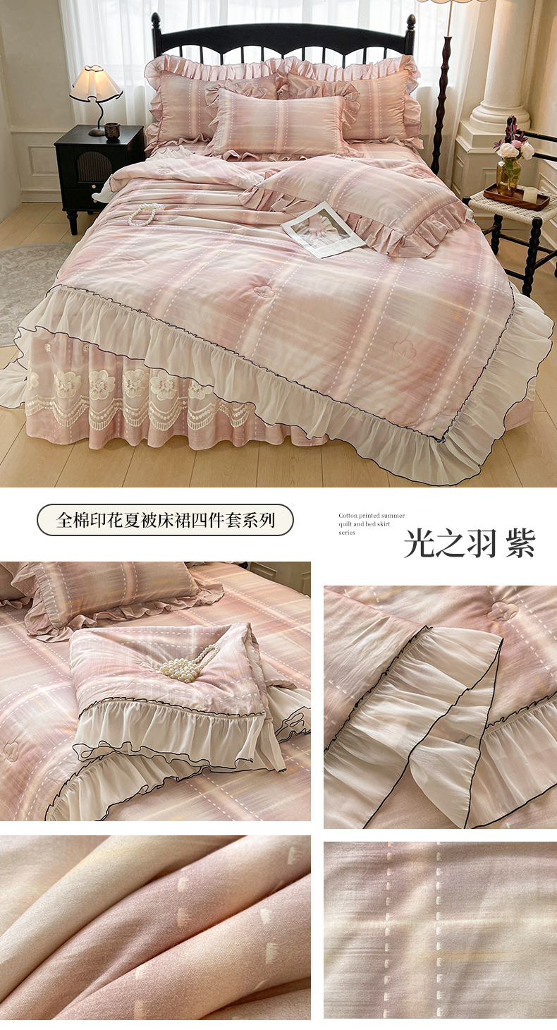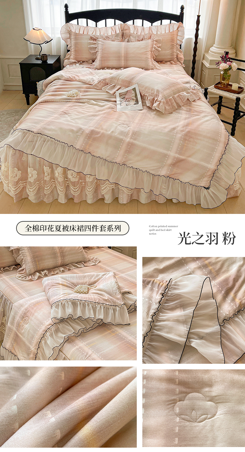 当前位置: 91家纺网 > 商品网购 > 床品套件 > 四件套 > 全棉普通四件套 > 宜凡家纺 2026新款全棉数码印花夏被床裙四件套格子系列 光之羽 粉