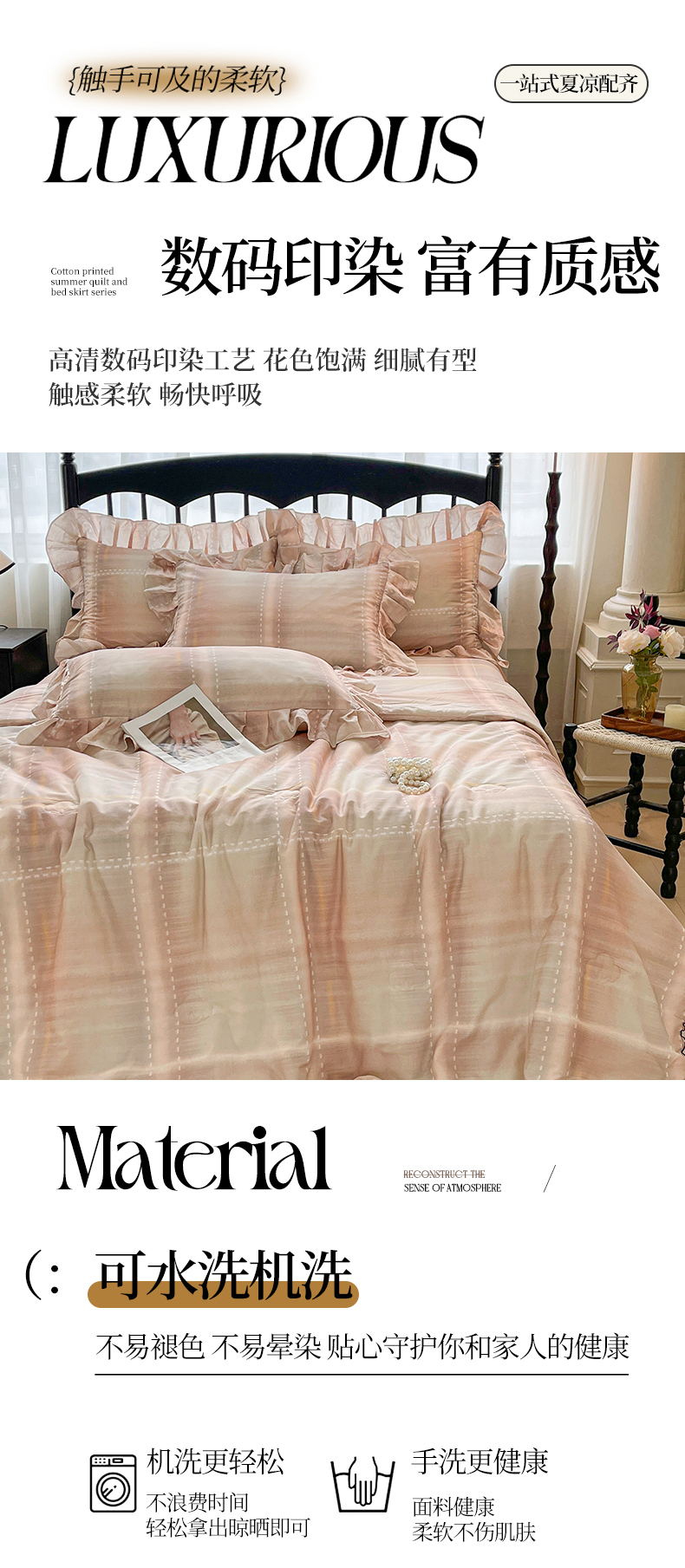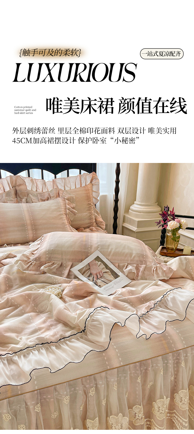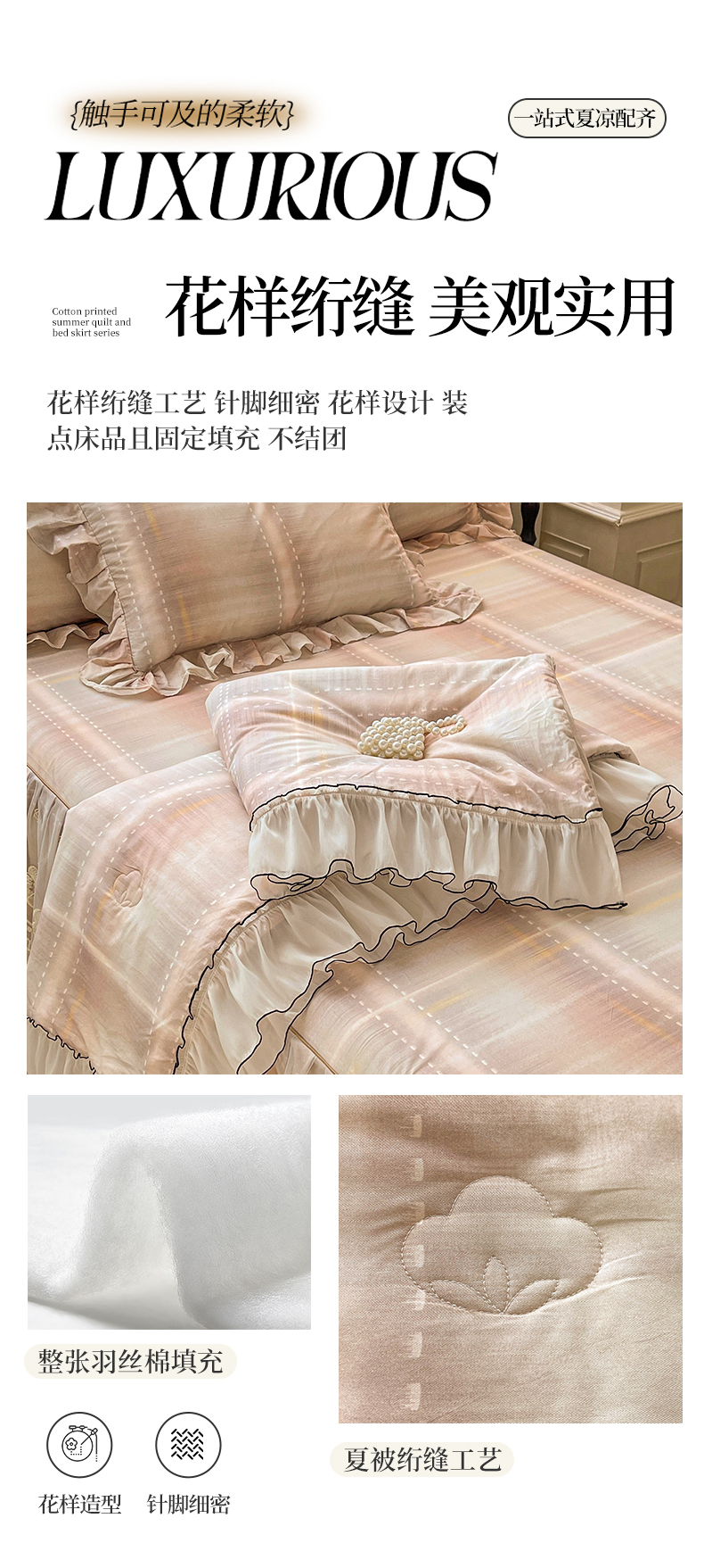 当前位置: 91家纺网 > 商品网购 > 床品套件 > 四件套 > 全棉普通四件套 > 宜凡家纺 2026新款全棉数码印花夏被床裙四件套格子系列 光之羽 粉