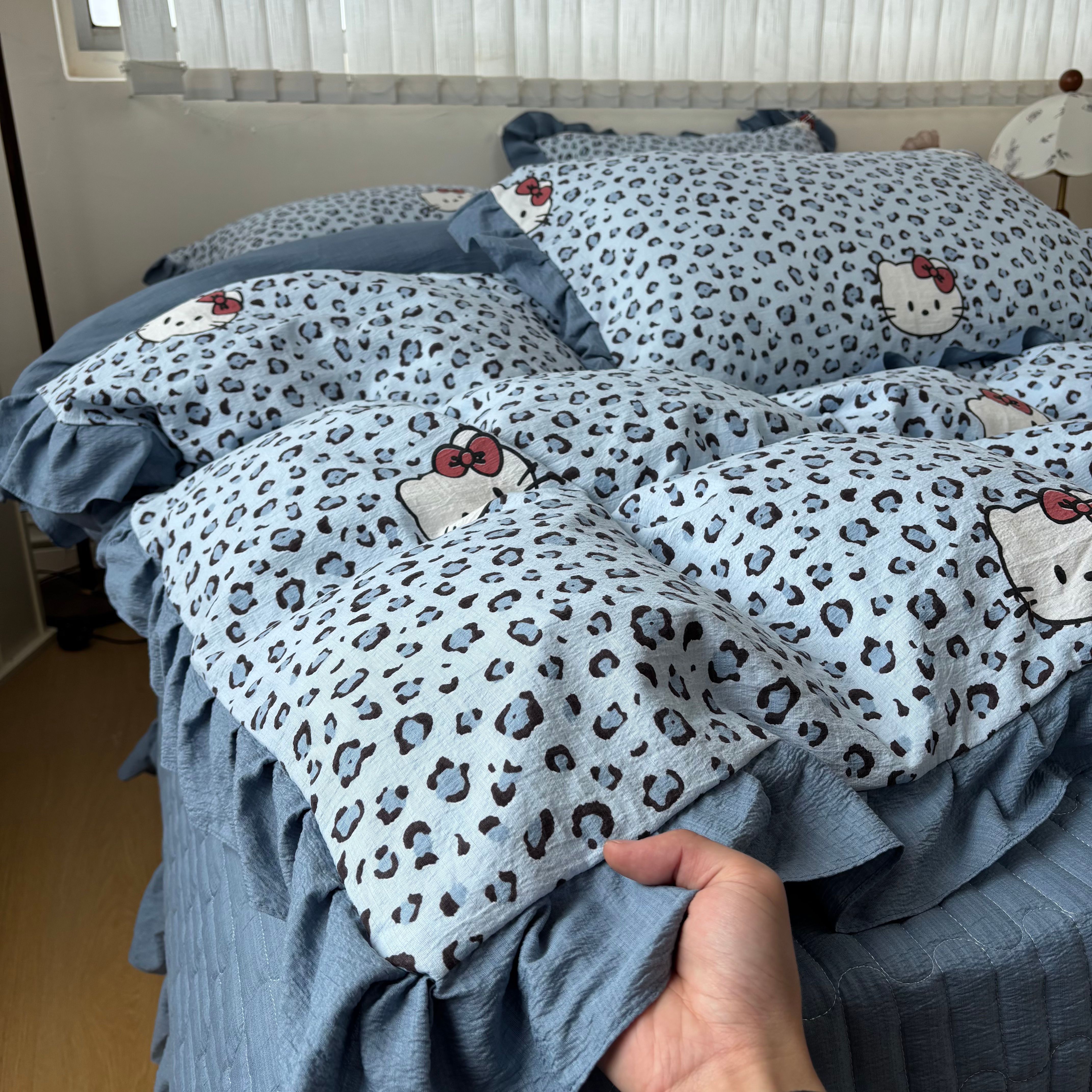 商品名称:麦朵家居 2026新款花边款皱皱纱床盖款四件套水洗棉小清新三件套 豹纹猫咪