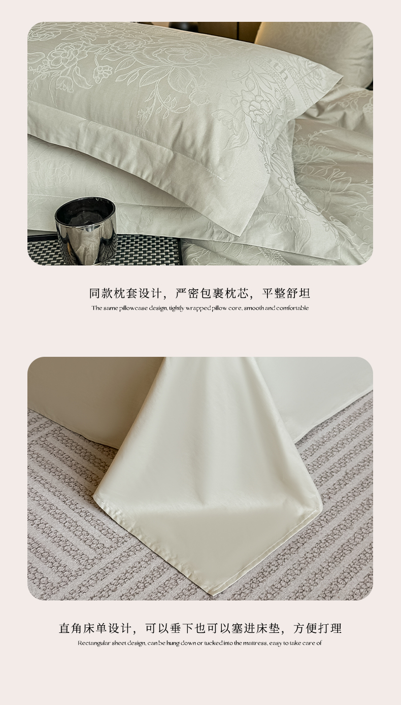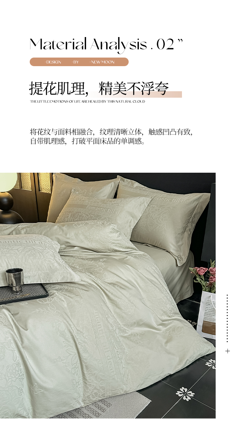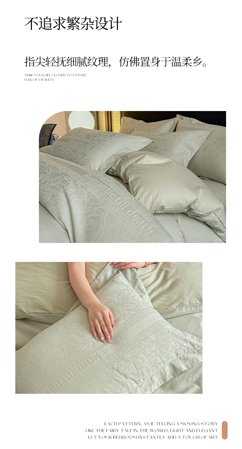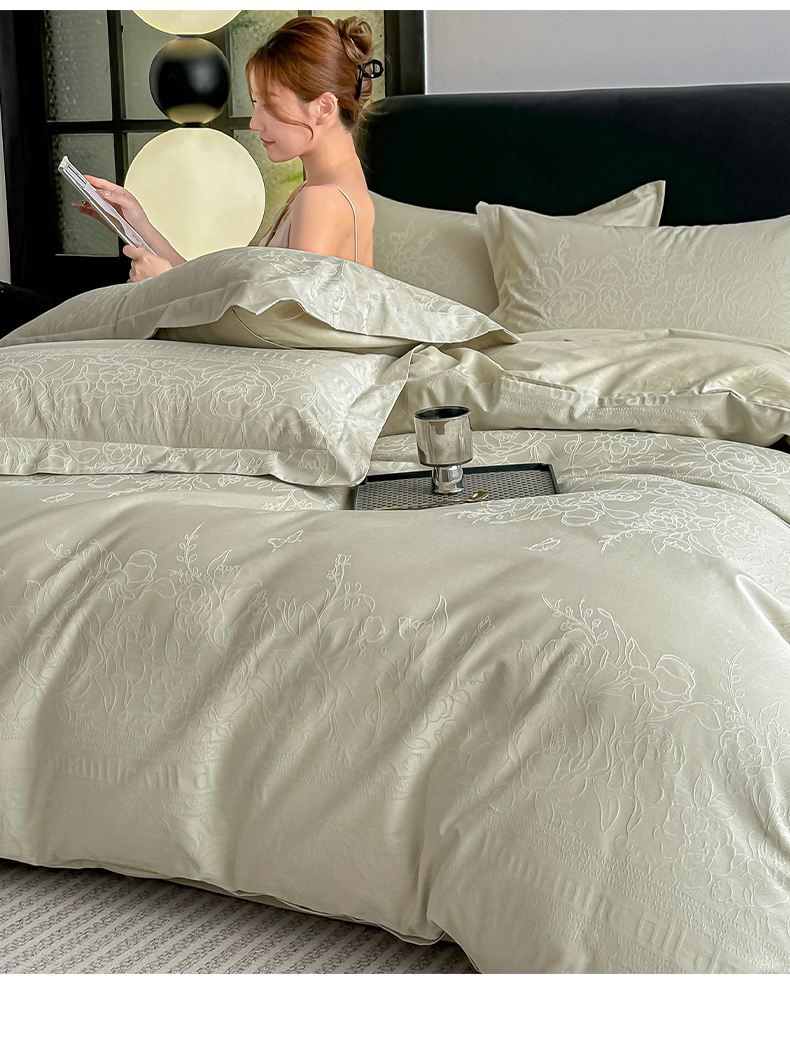 当前位置: 91家纺网 > 商品网购 > 床品套件 > 四件套 > 全棉普通四件套 > 宅家居 2026新款轻奢A类60支立体浮雕长绒棉纯棉提花贡缎全棉四件套光泽绸缎感三件套 恋曲花语-香槟绿