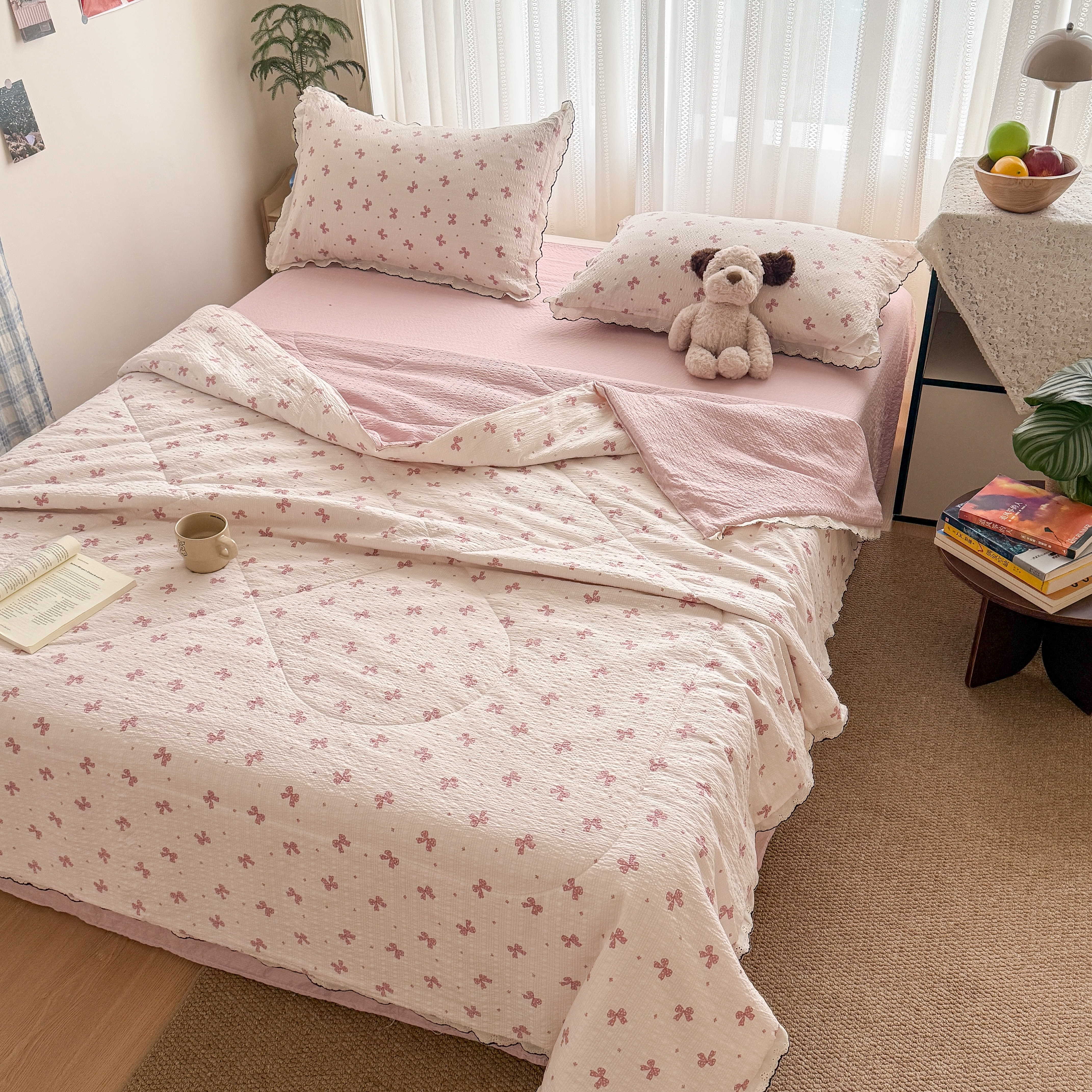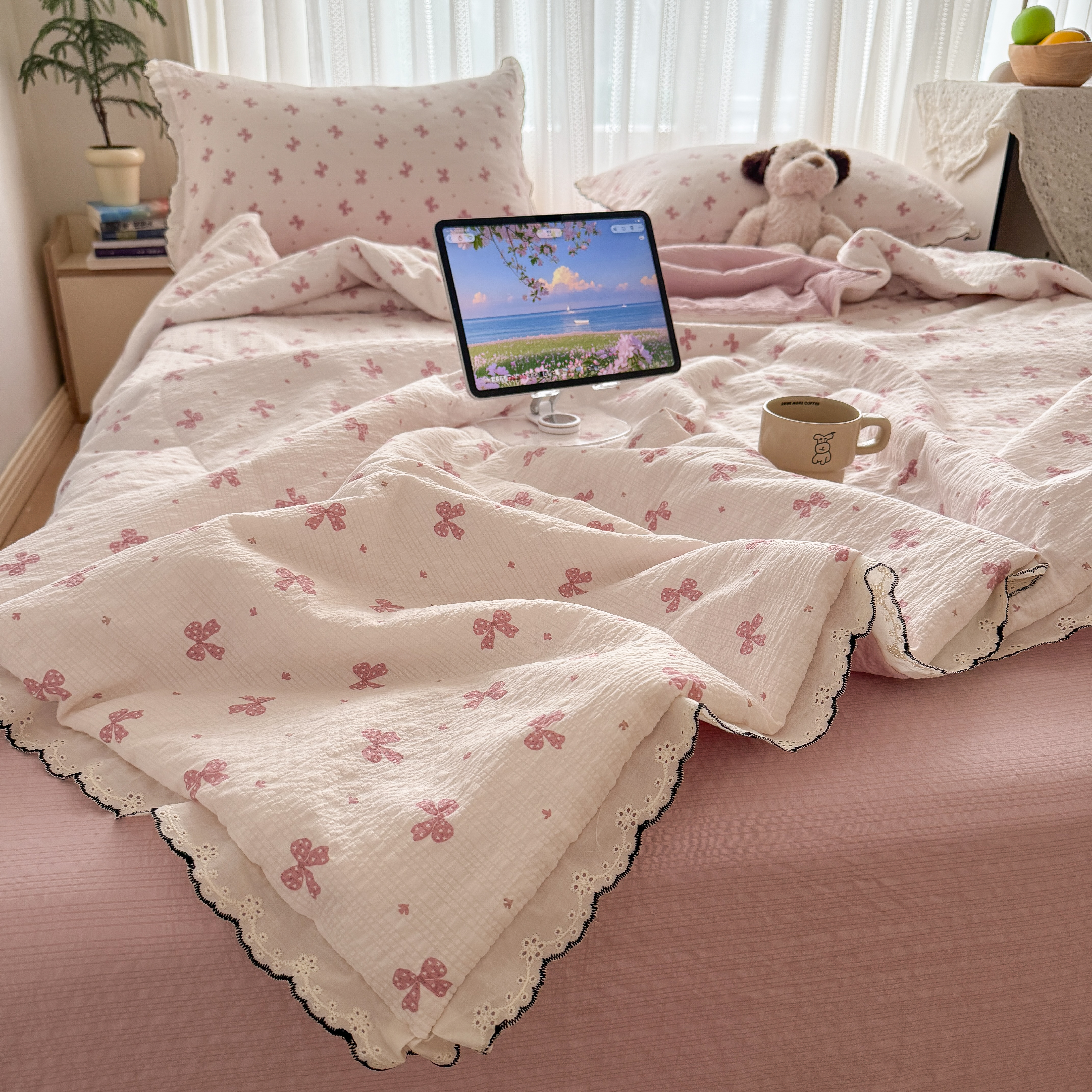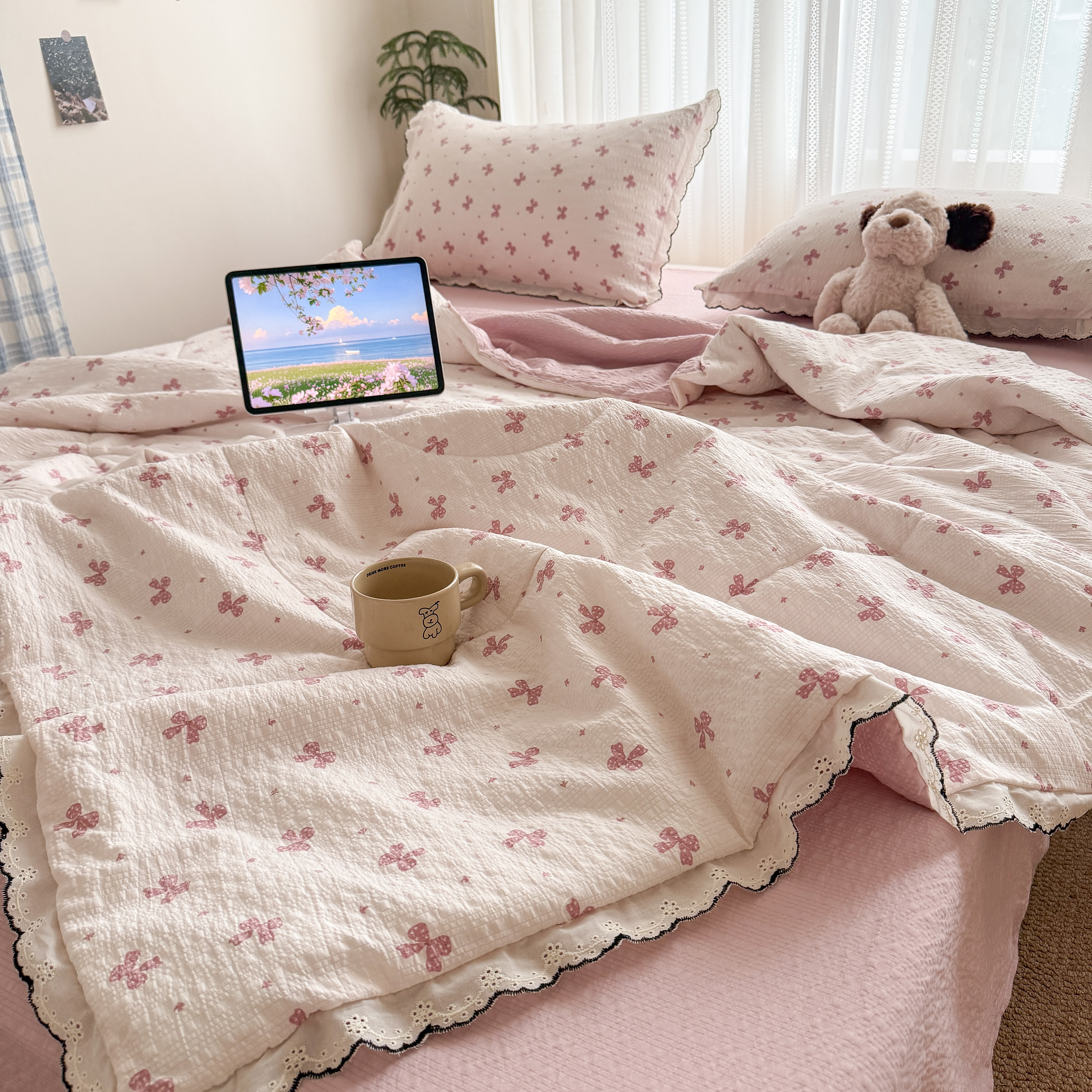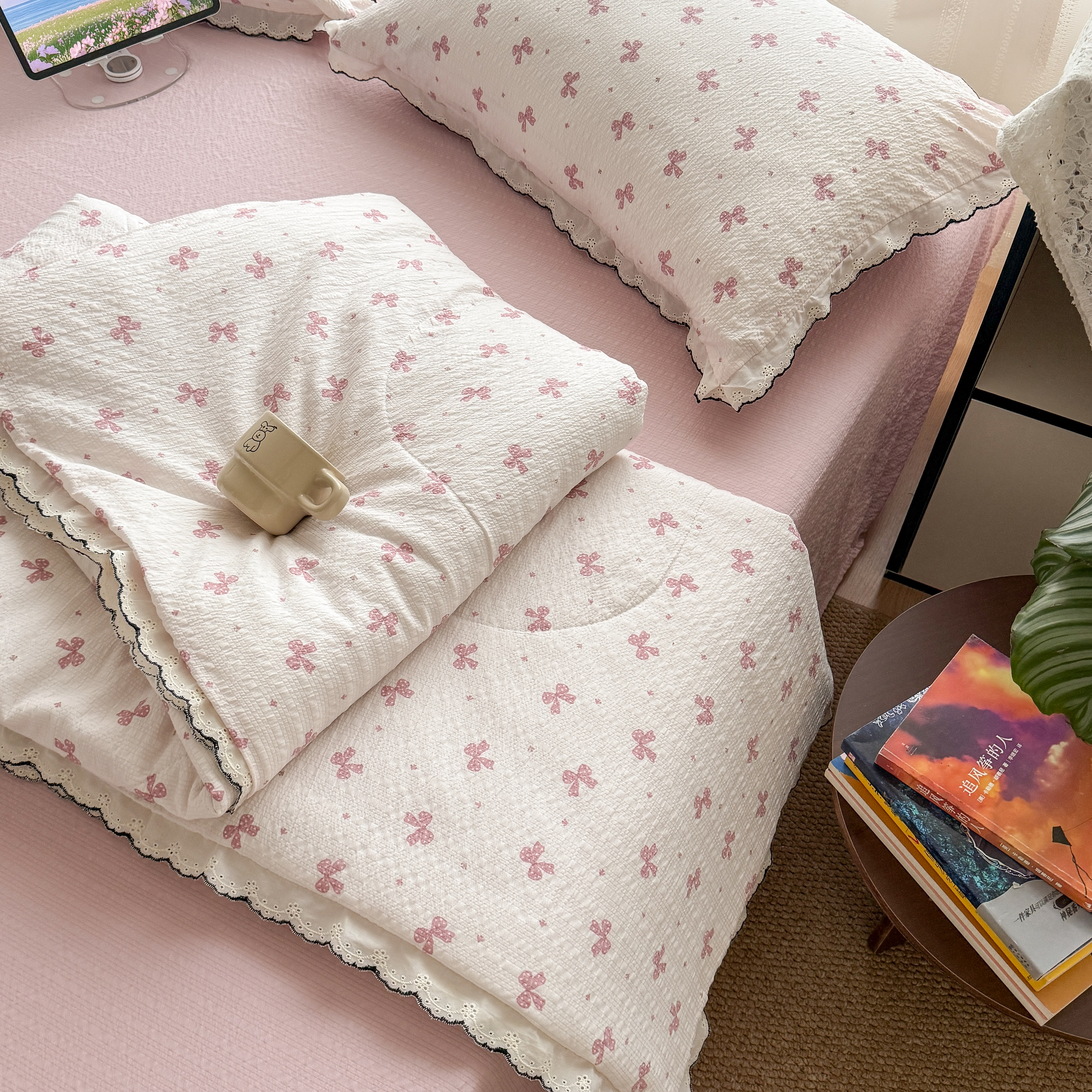 欧尚 2026新款蕾丝花边夏被款四件套 粉色蝴蝶结