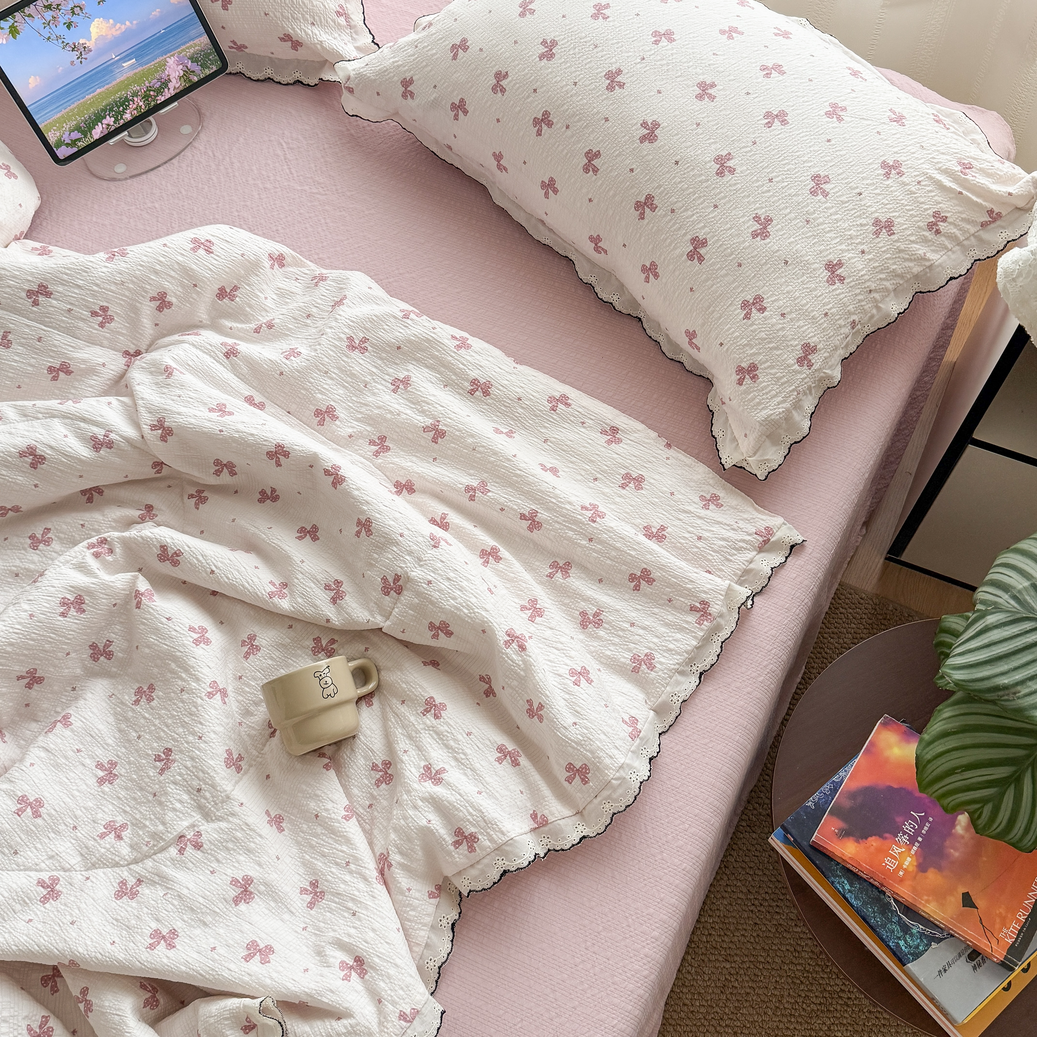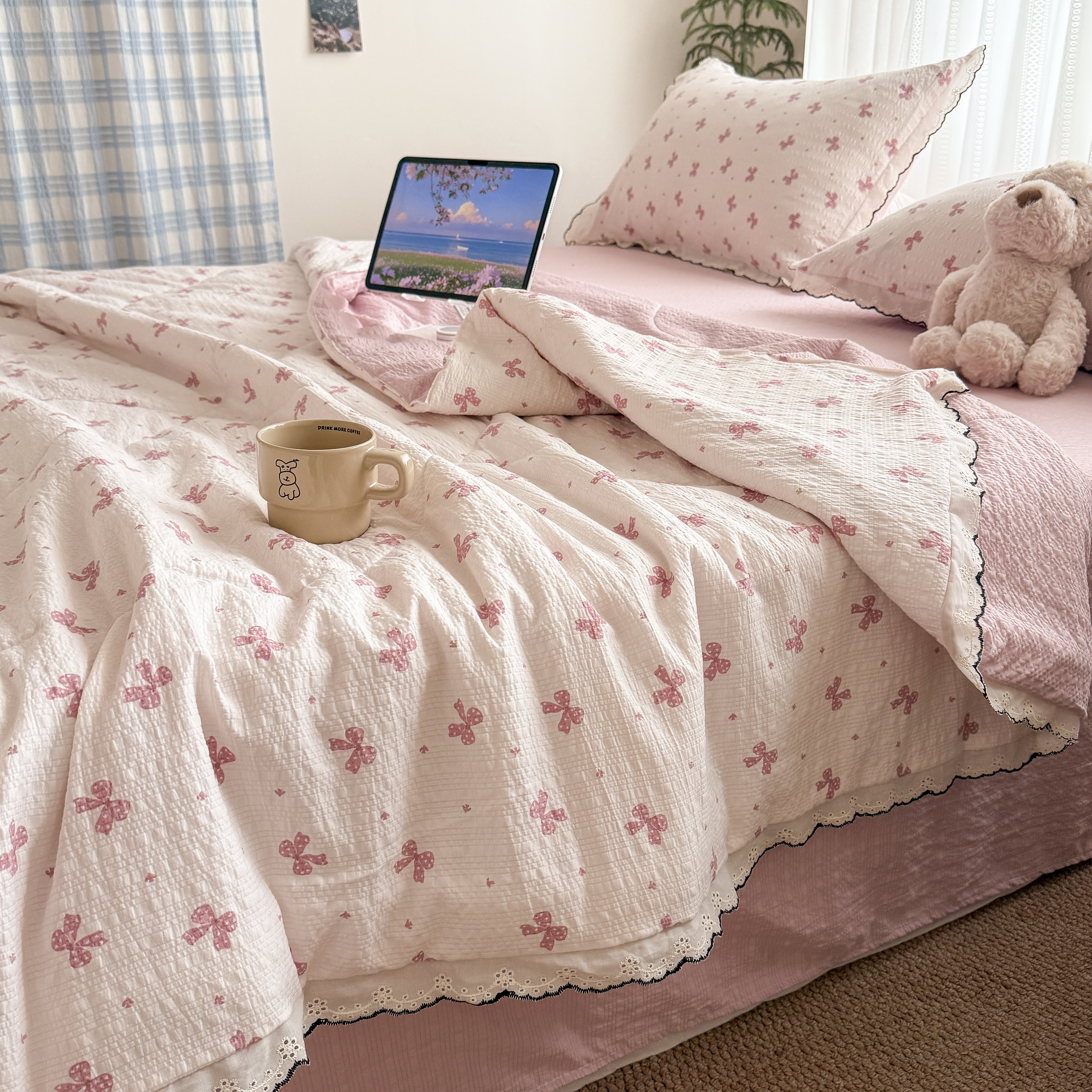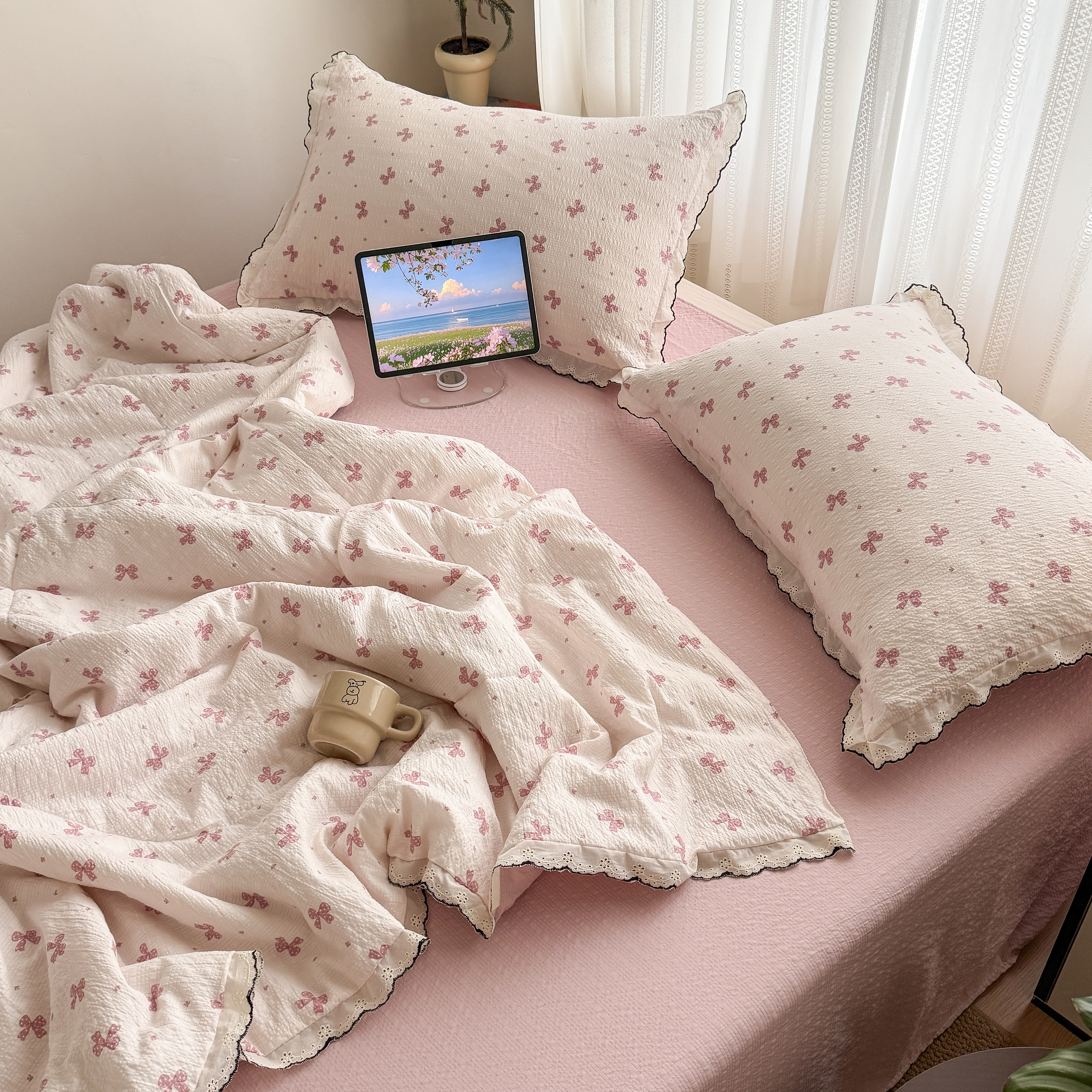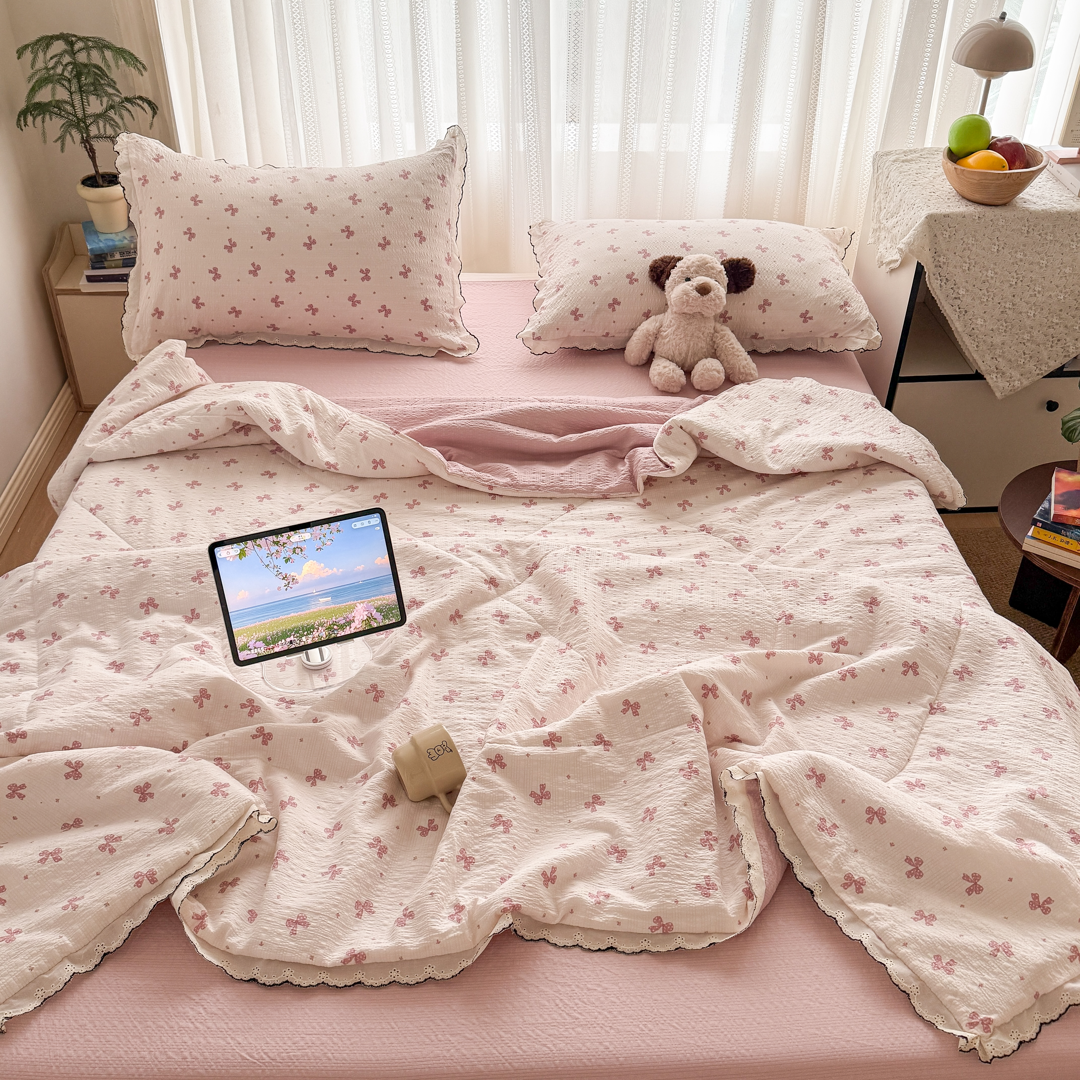 欧尚 2026新款蕾丝花边夏被款四件套 粉色蝴蝶结