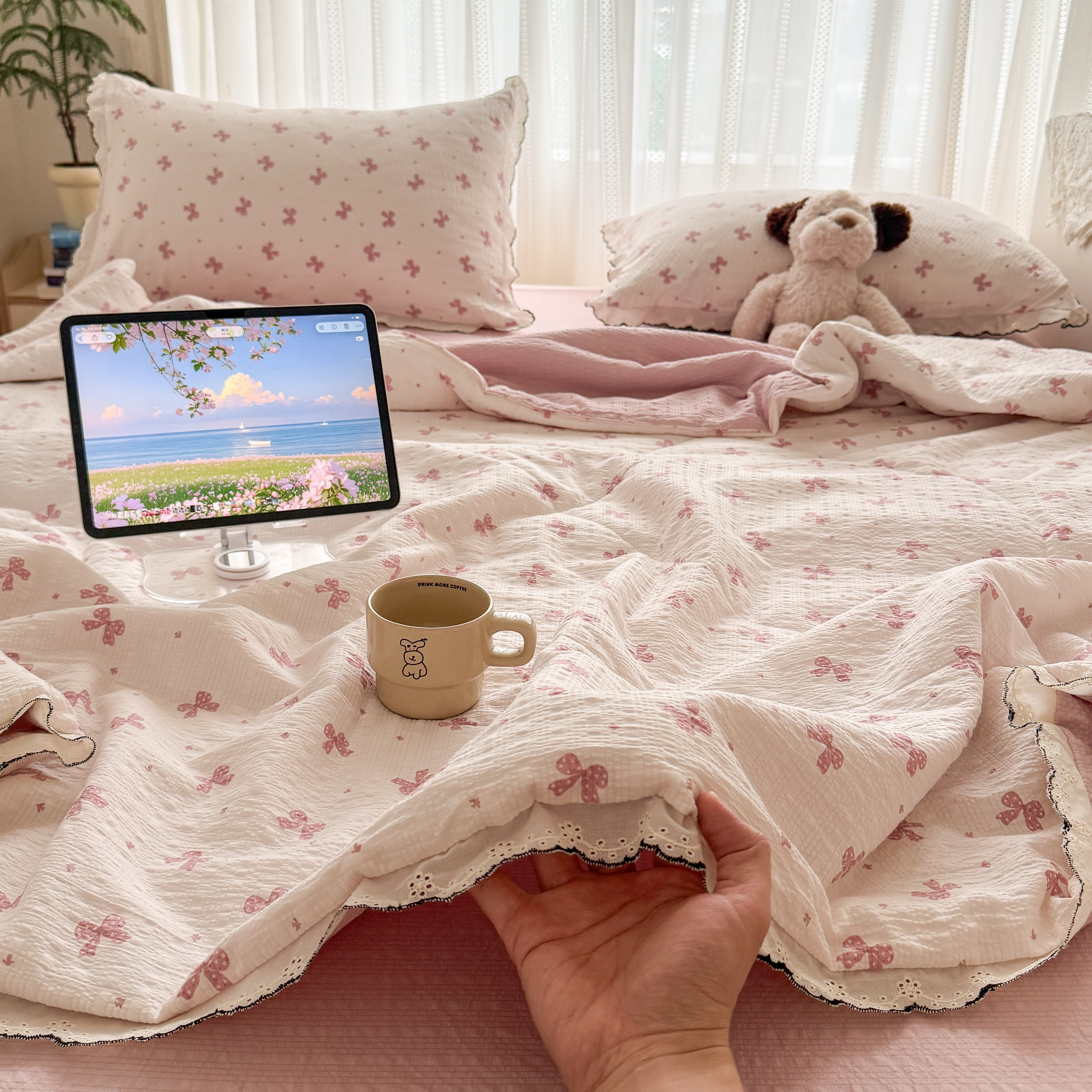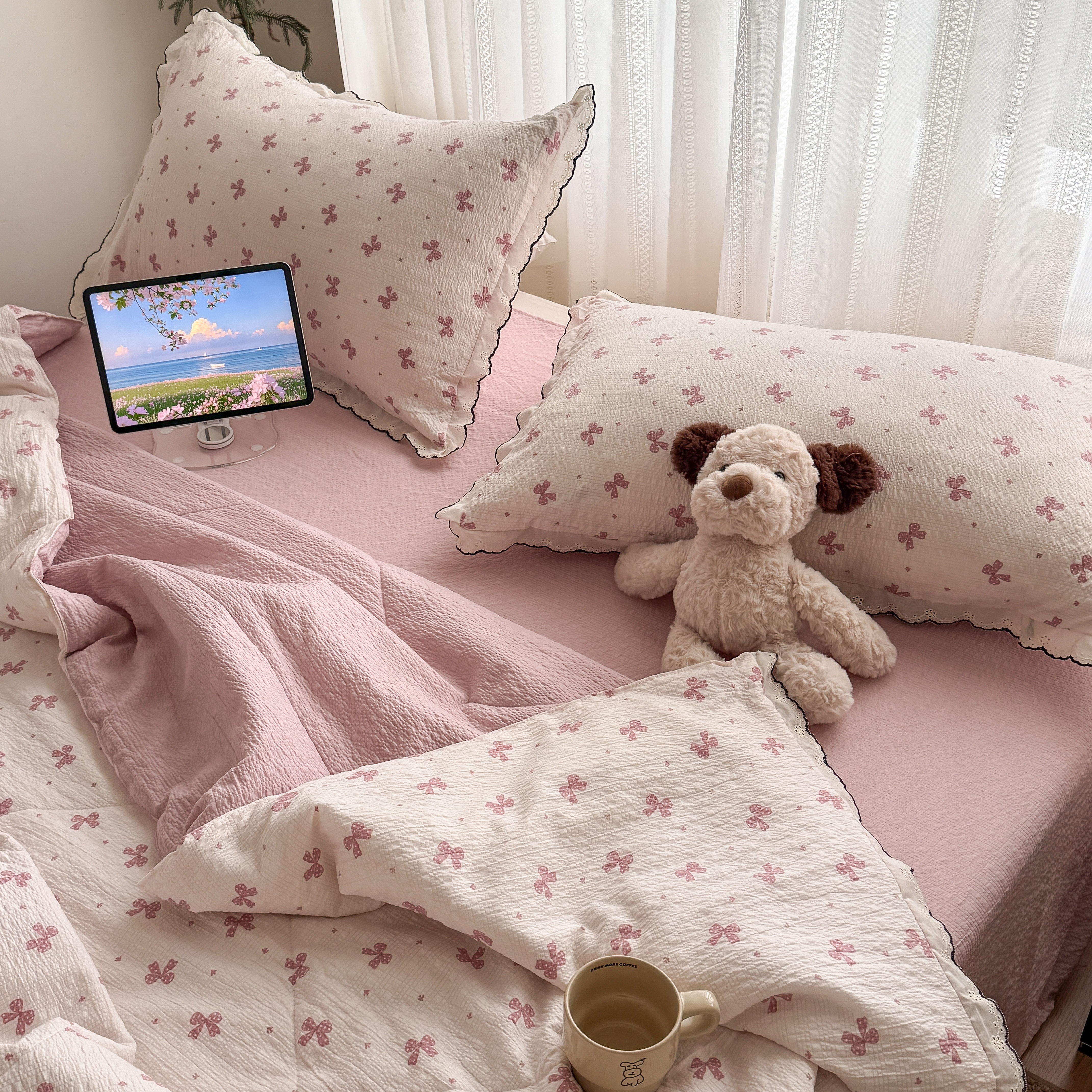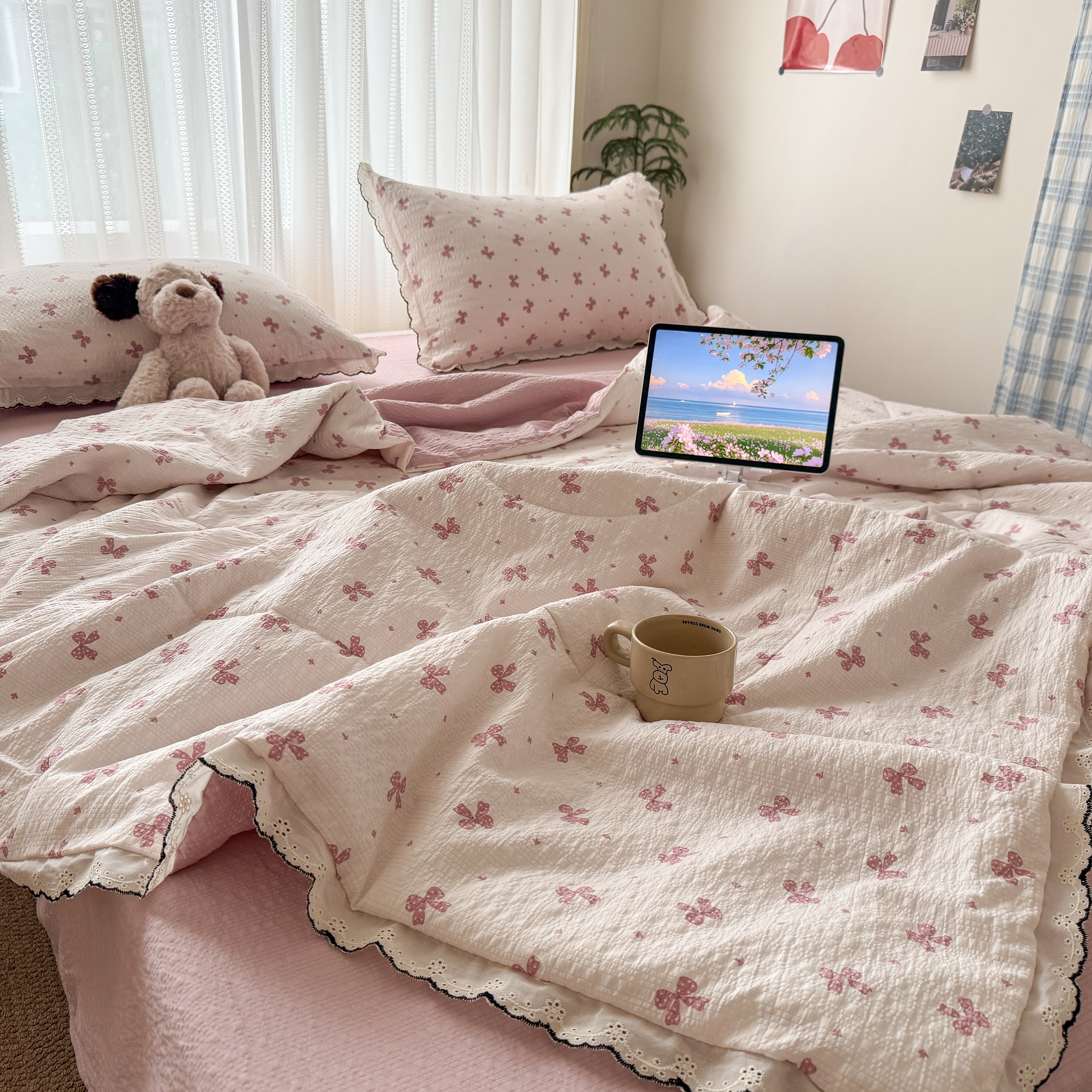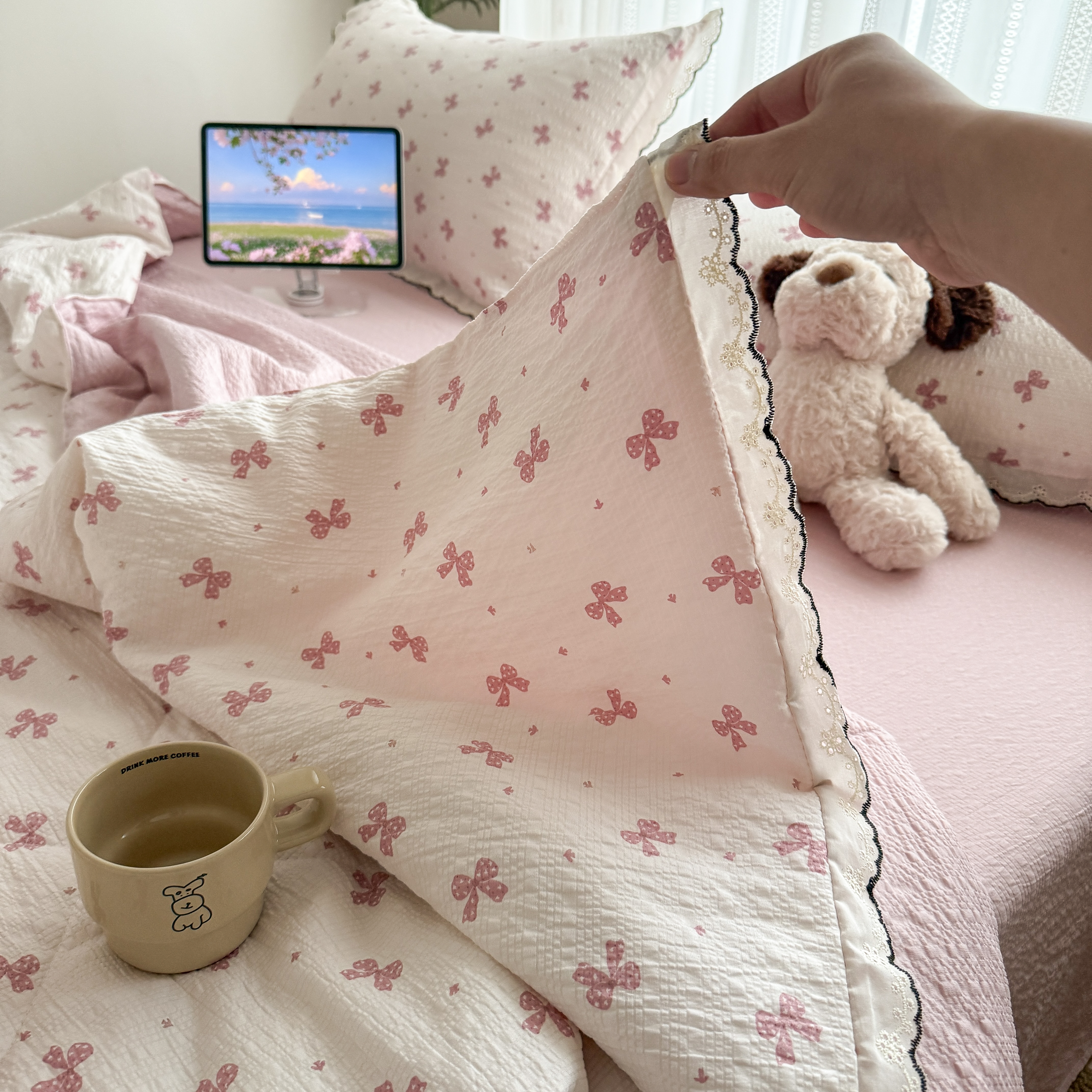 欧尚 2026新款蕾丝花边夏被款四件套 粉色蝴蝶结