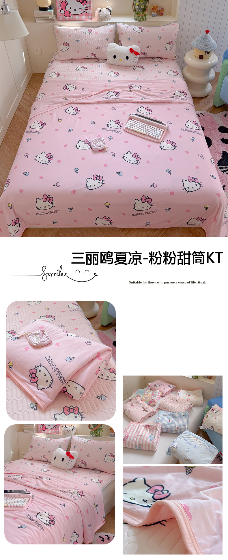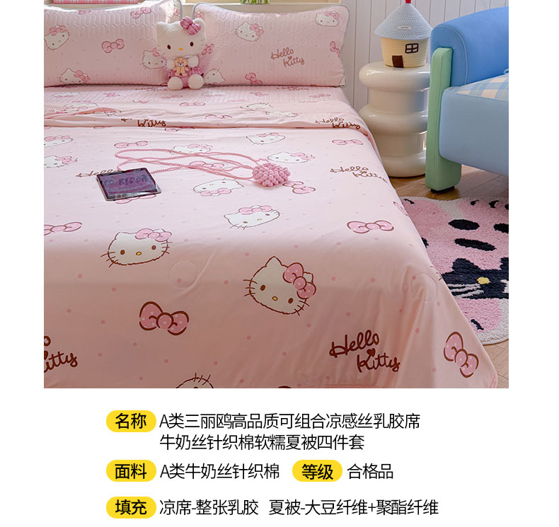 • 91家纺网 家纺一手货源 找家纺 桃子家居 2026新款A类三丽鸥高品质可组合凉感丝乳胶席牛奶丝针织棉软糯夏被四件套 三丽鸥夏凉-爱心美少女KT
