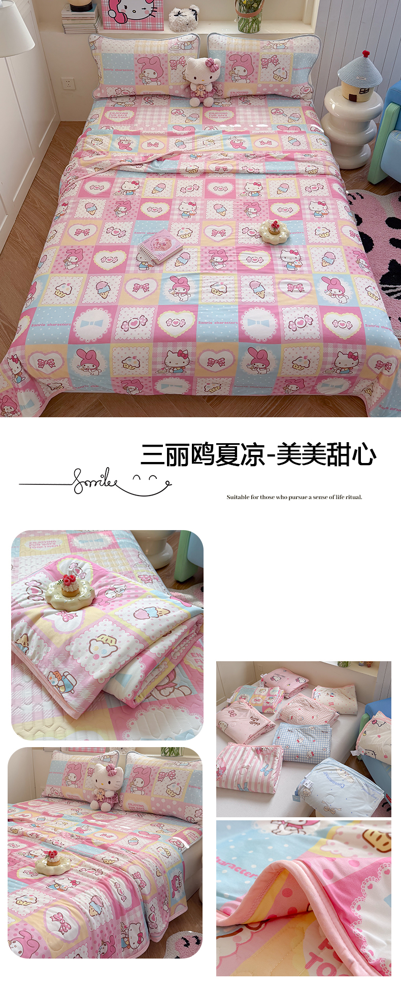 (总)桃子家居 2026新款A类三丽鸥高品质可组合凉感丝乳胶席牛奶丝针织棉软糯夏被四件套,三丽鸥夏凉-爱心美少女KT,三丽鸥夏凉-粉粉美乐蒂,三丽鸥夏凉-粉粉甜筒KT,三丽鸥夏凉-粉格甜品KT,三丽鸥夏凉-蓝格甜品KT,三丽鸥夏凉-美美甜心,三丽鸥夏凉-奶油蓝点大耳狗,三丽鸥夏凉-气球美美KT,三丽鸥夏凉-甜甜KT,组合图