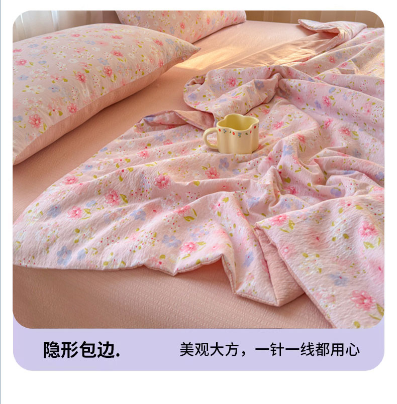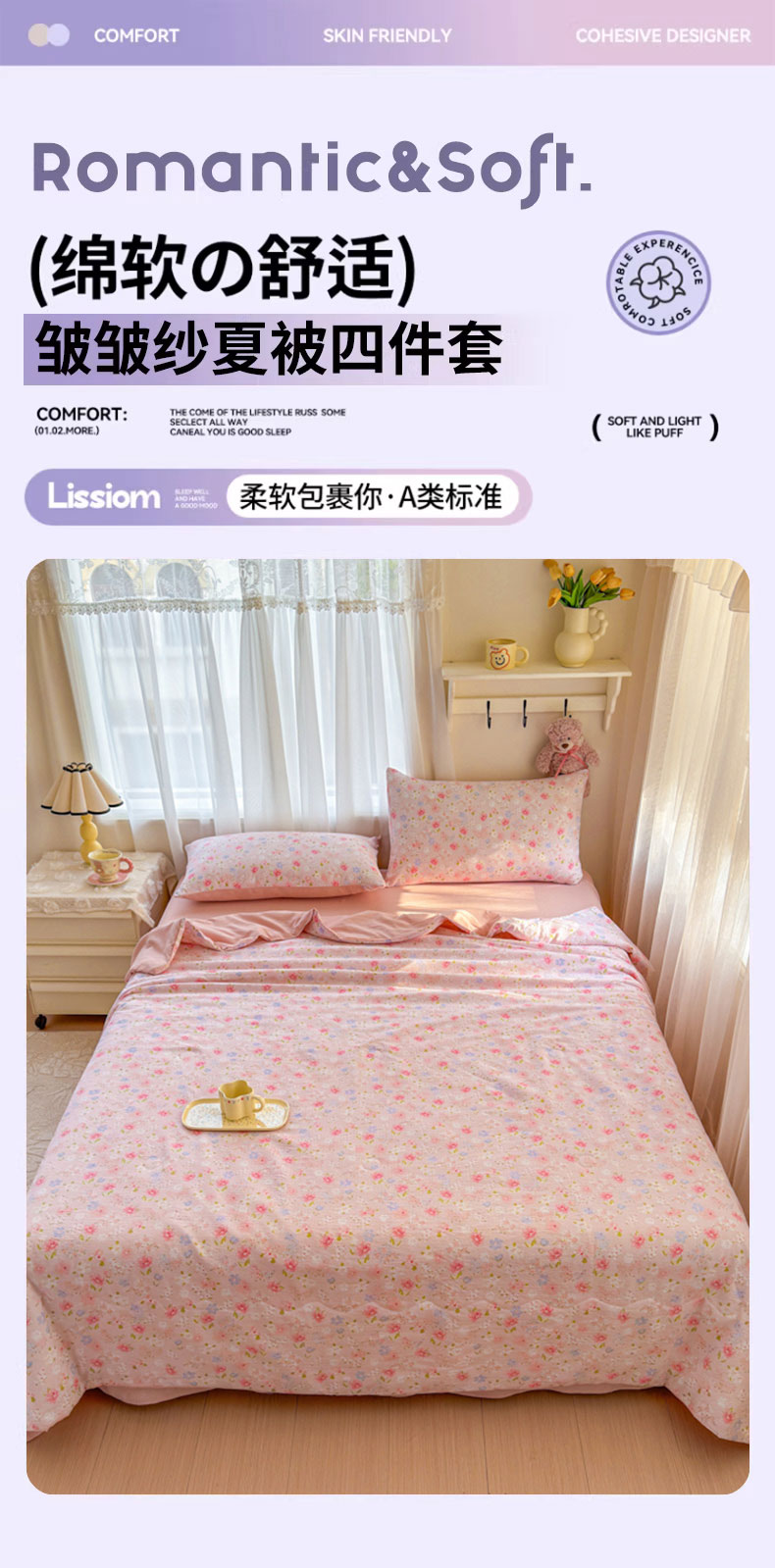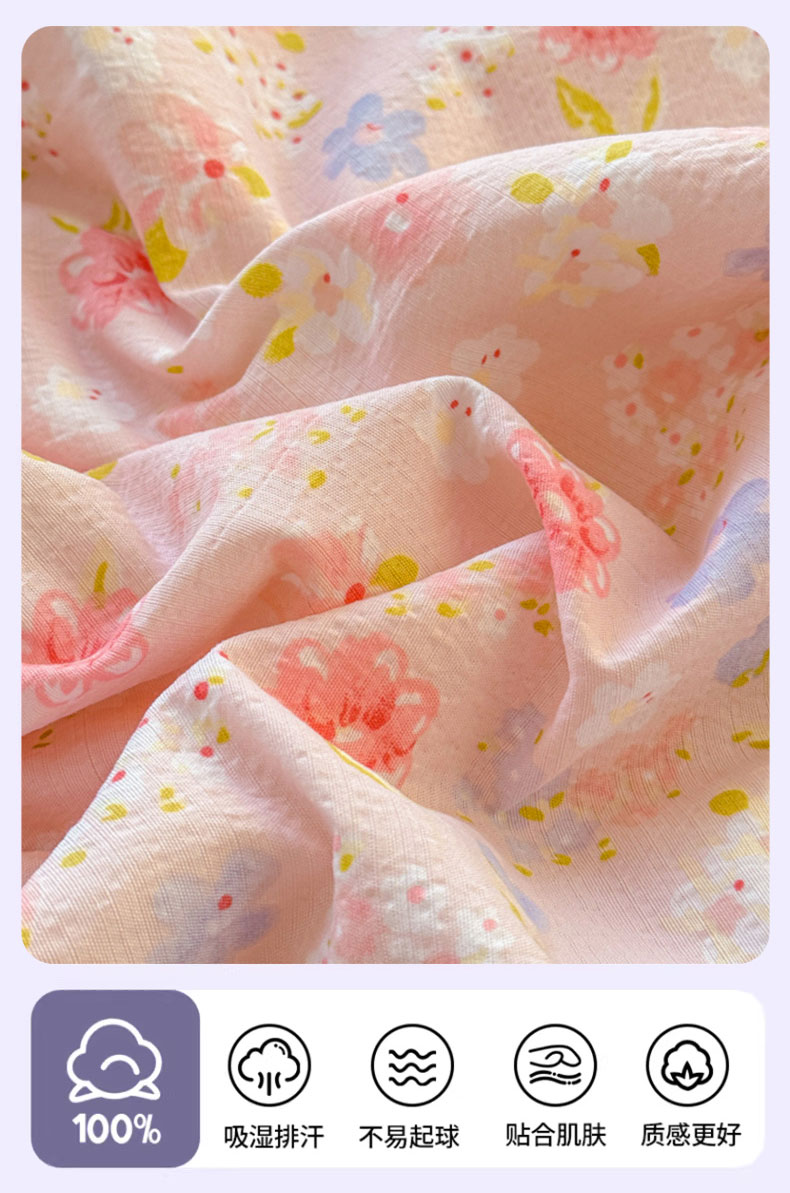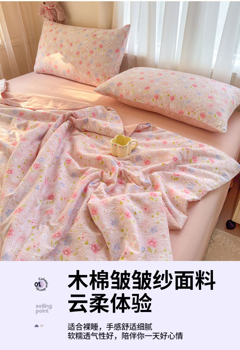 当前位置: 91家纺网 > 商品网购 > 床品套件 > 四件套 > 夏被四件套 > 梵希雅 2026新款A类木棉皱皱纱夏被 樱粉星野