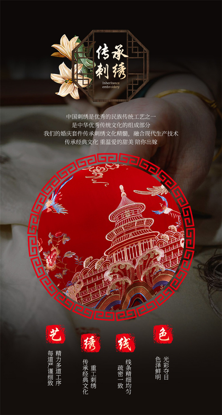 千禧 2024新款贡缎磨毛婚庆绣花多件套 盛世华庭(彩色绣),盛世华庭(彩色绣)