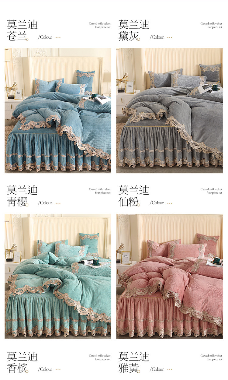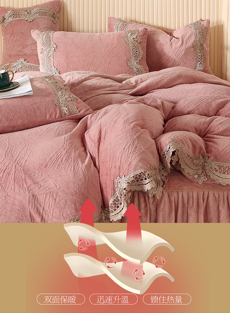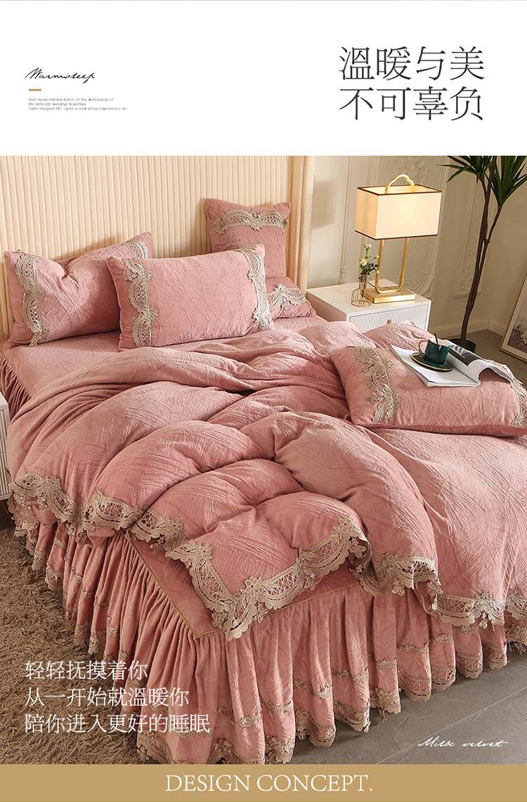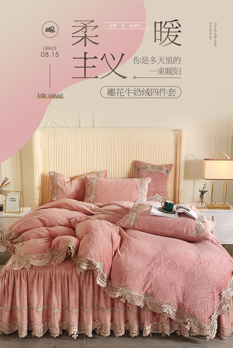 网红馆 2025新款牛奶绒雕花床裙四件套 莫兰迪-仙粉