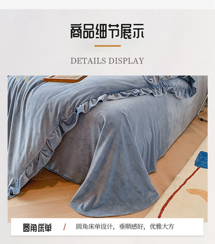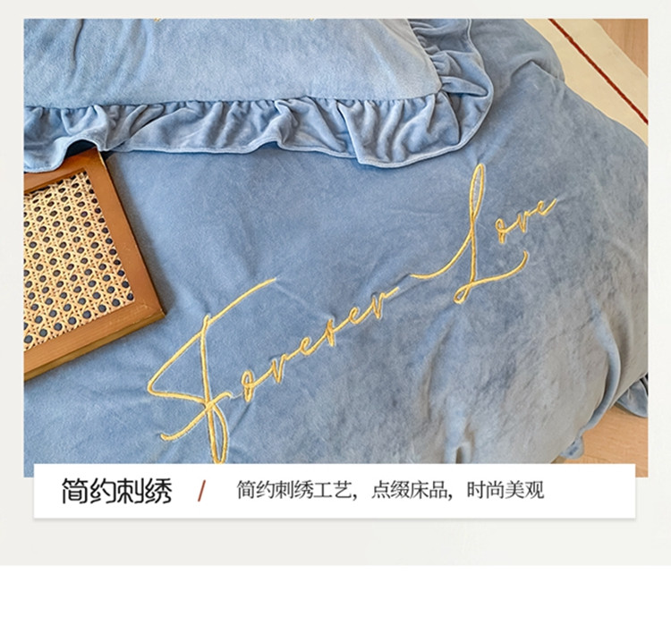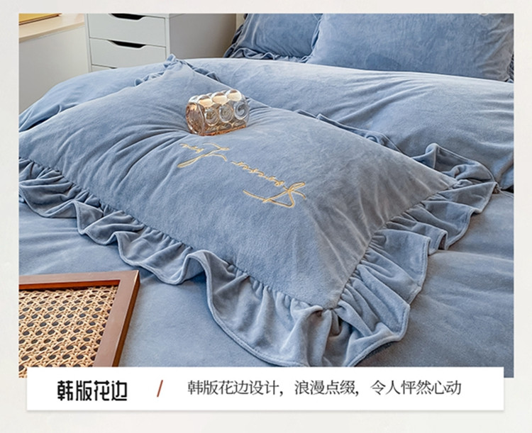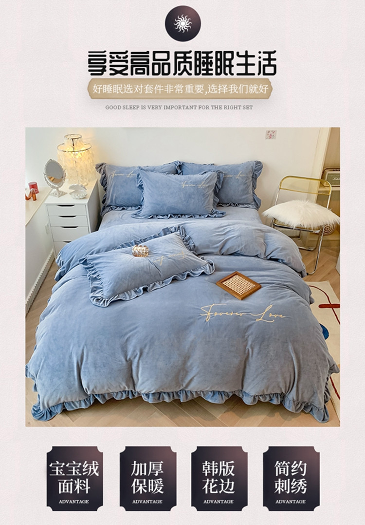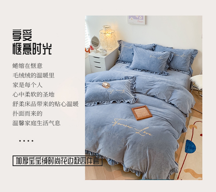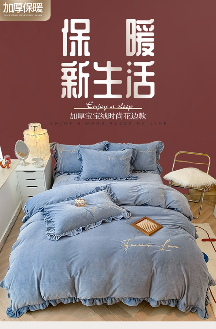 当前位置: 91家纺网 > 商品网购 > 床品套件 > 四件套 > 宝宝绒四件套 > 珺柔家纺2021新款加厚水晶绒时尚花边款 艾丽丝 天蓝