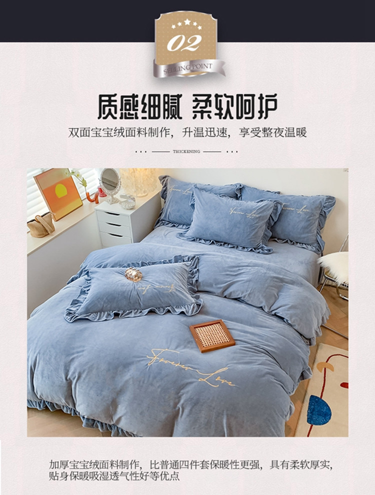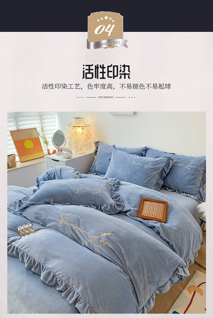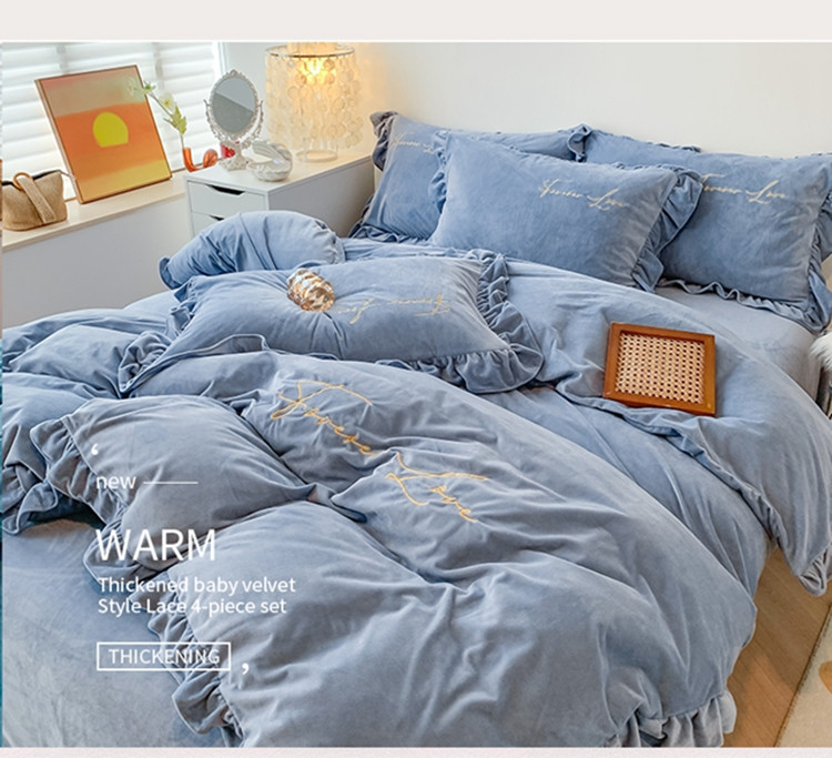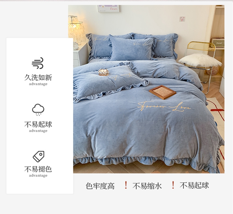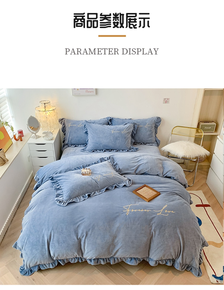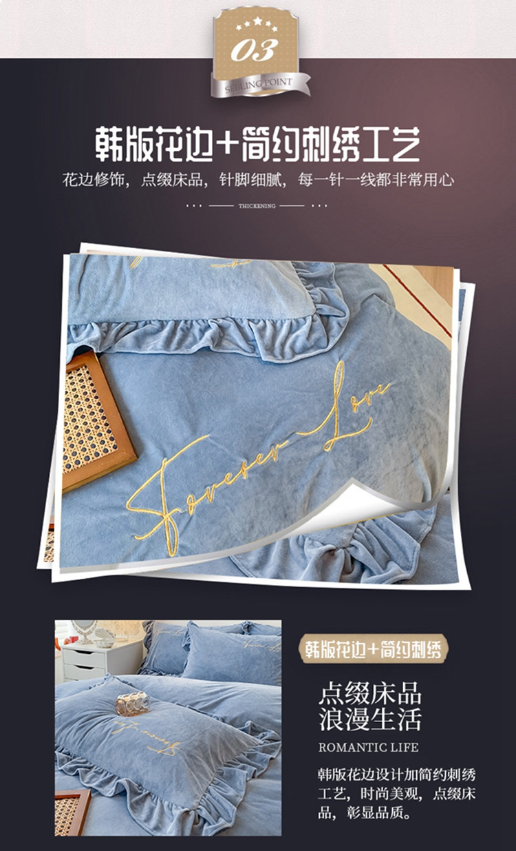 当前位置: 91家纺网 > 商品网购 > 床品套件 > 四件套 > 宝宝绒四件套 > 珺柔家纺2021新款加厚水晶绒时尚花边款 艾丽丝 天蓝