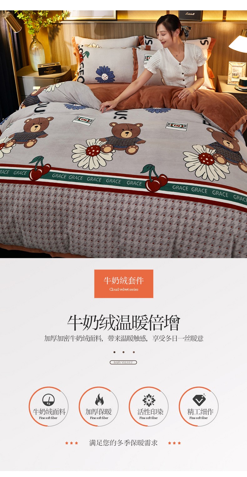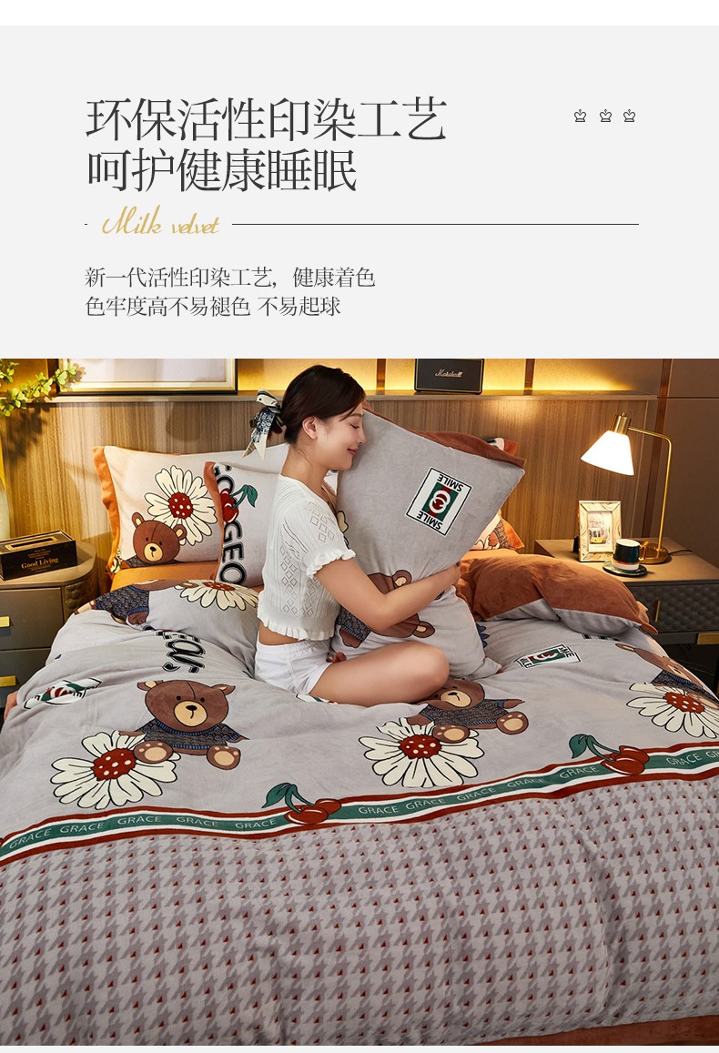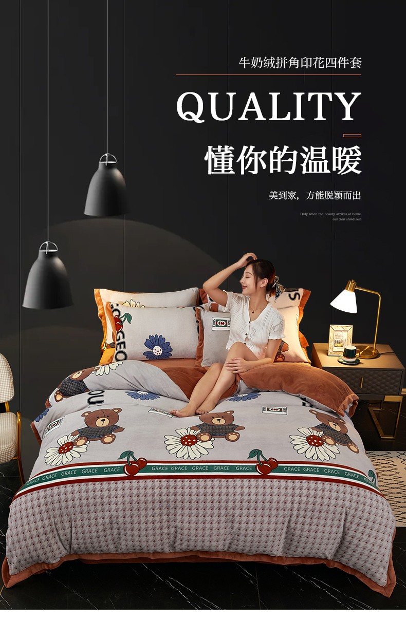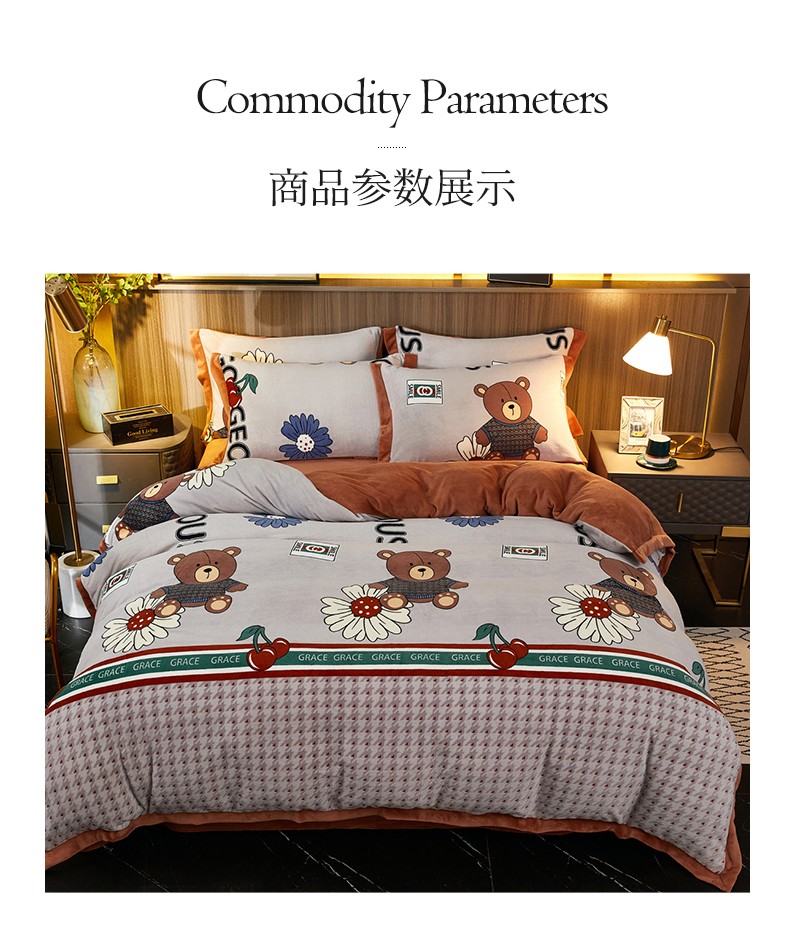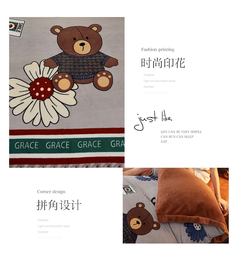 商品名称:澳洲羽 2024年新牛奶绒拼角印花四件套水晶法莱绒直播供货 泰迪熊