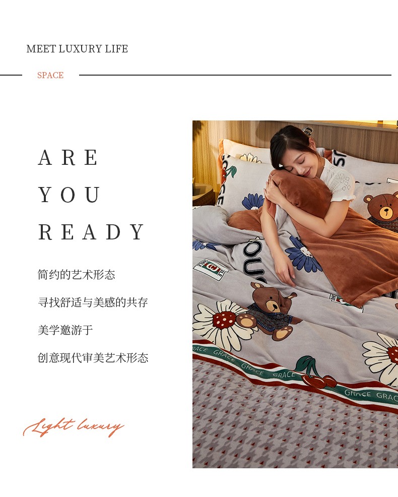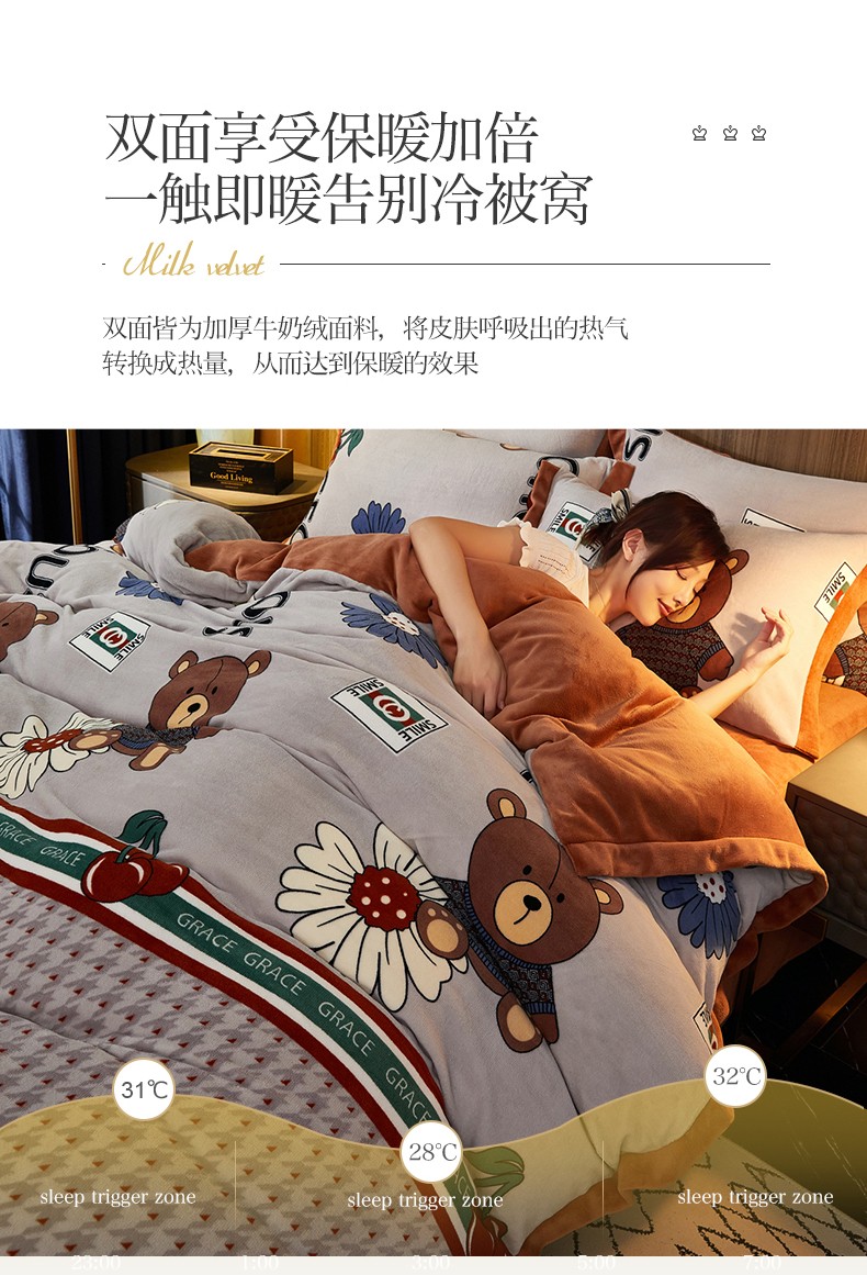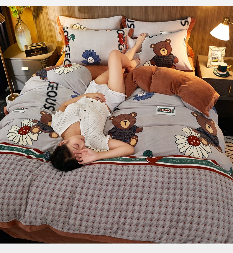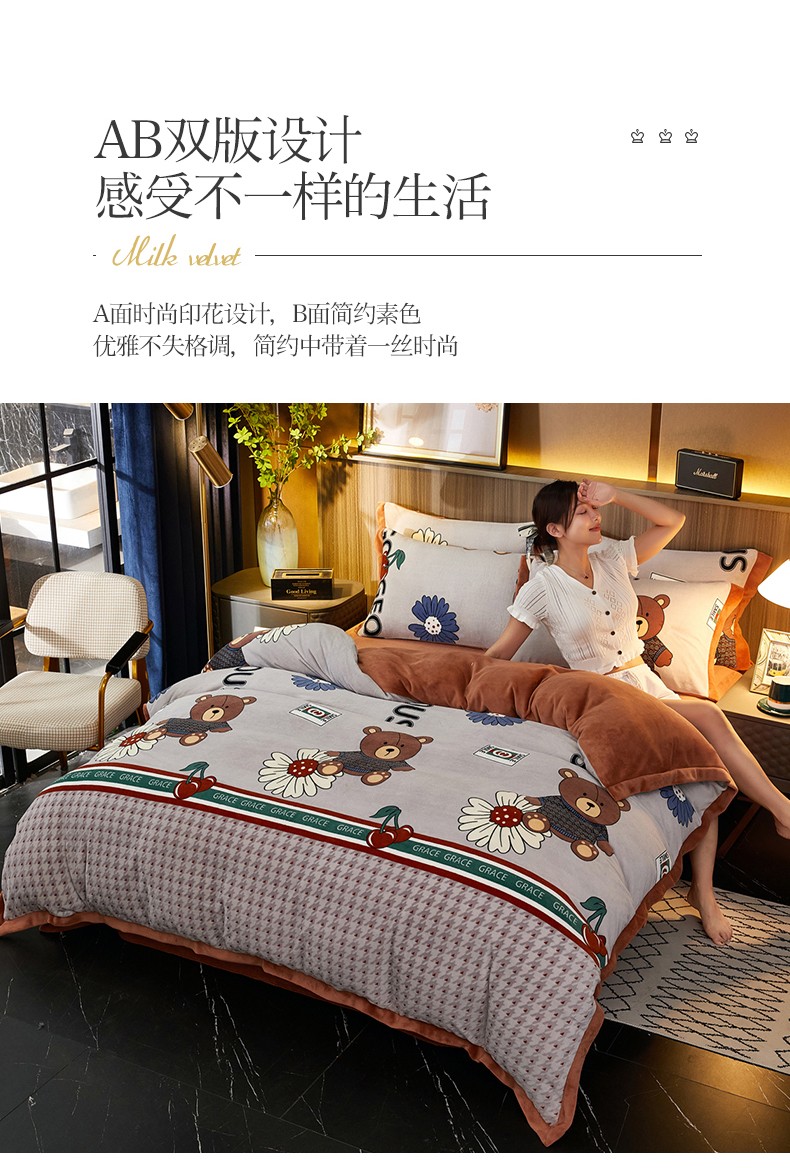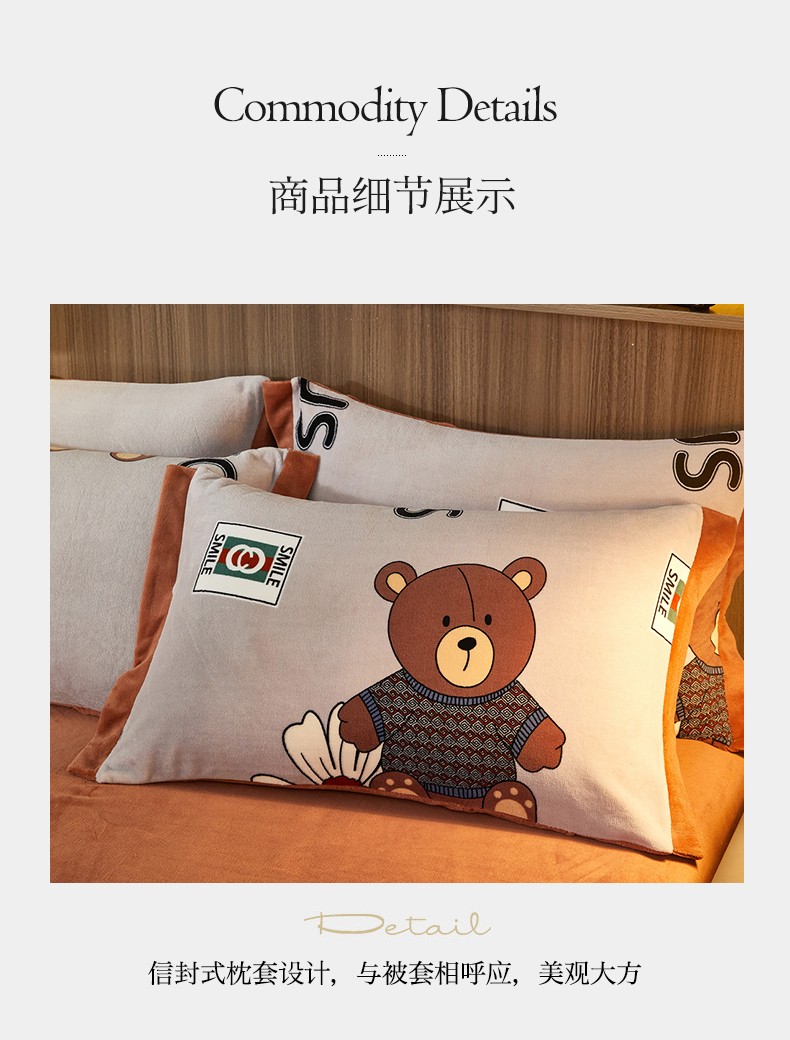 商品名称:澳洲羽 2024年新牛奶绒拼角印花四件套水晶法莱绒直播供货 泰迪熊