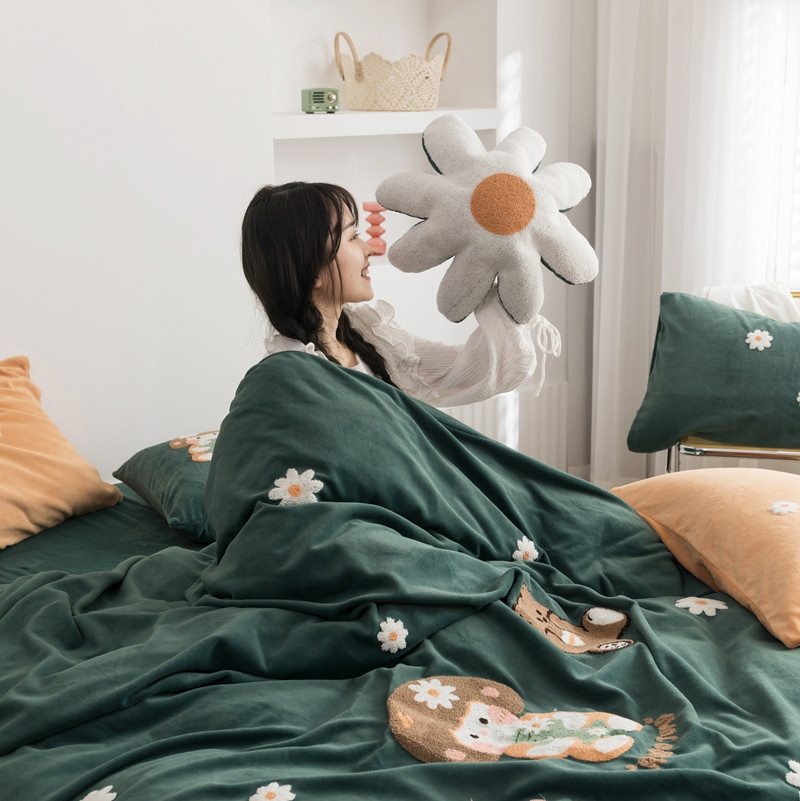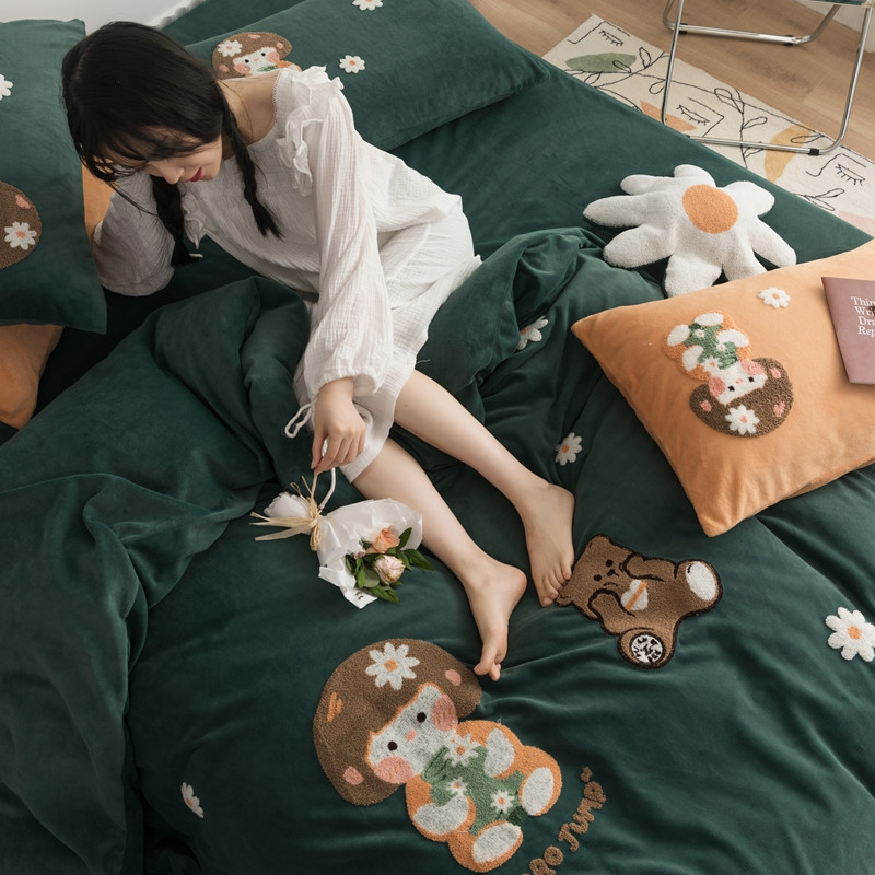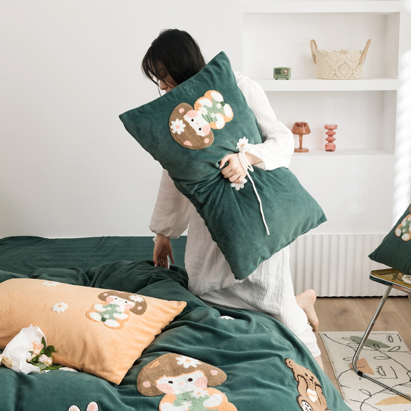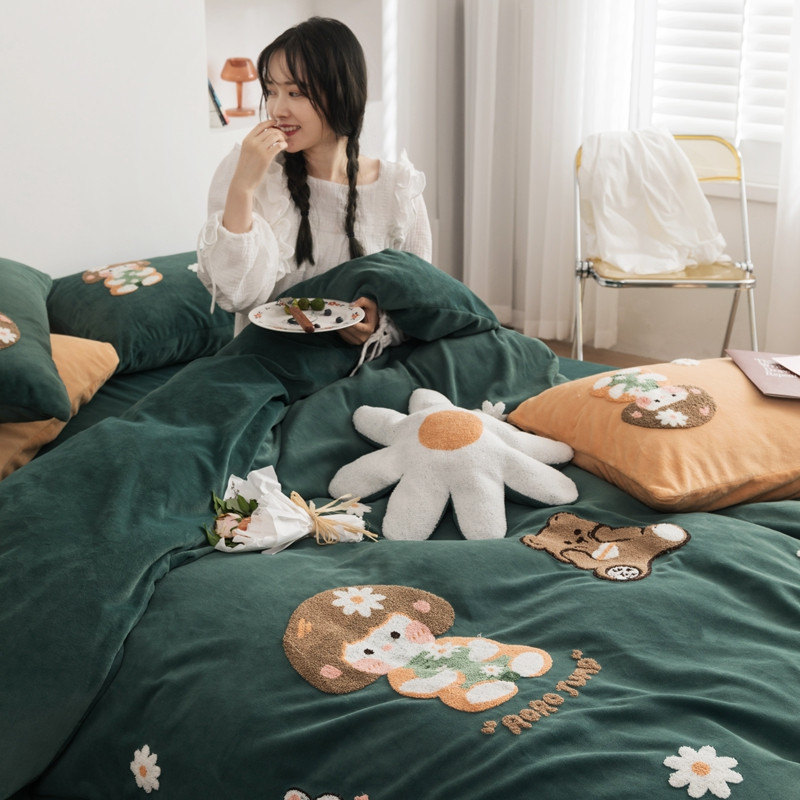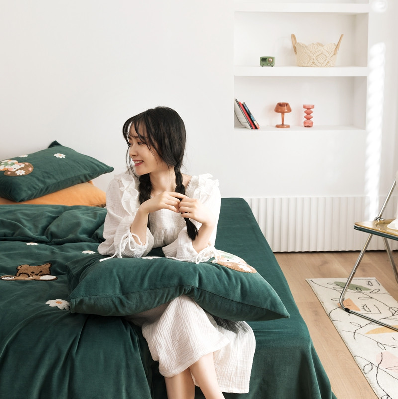 柚子YOUTH 2021新款牛奶绒绣花工艺款四件套-棚拍 肉肉酱绿