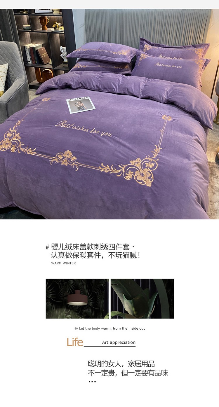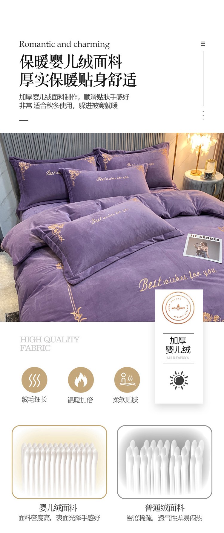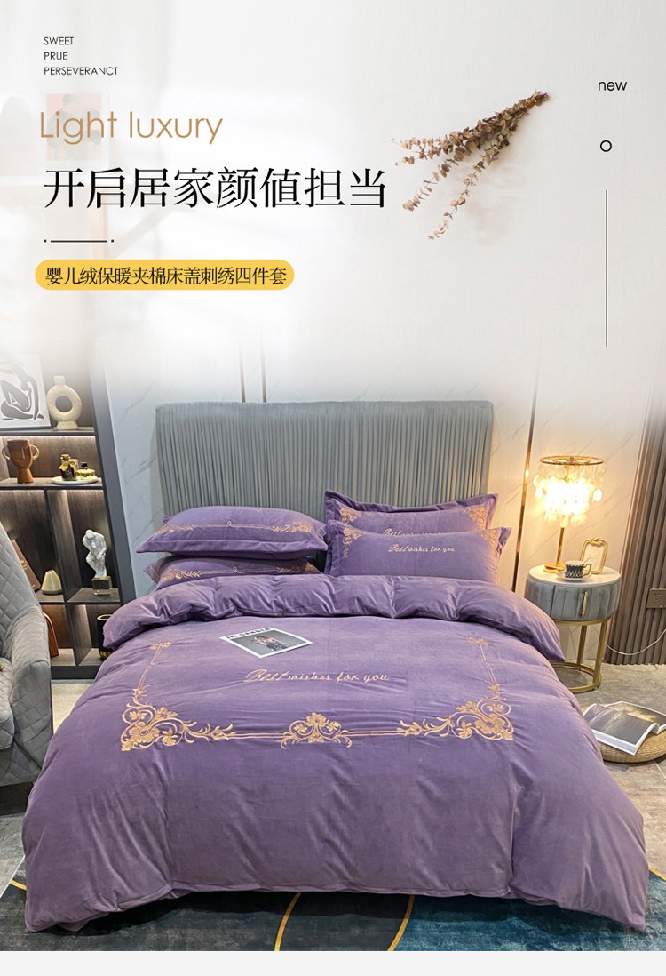 星尚2021高品质婴儿绒夹棉床盖绣花四件套牛奶法莱绒 优雅紫
