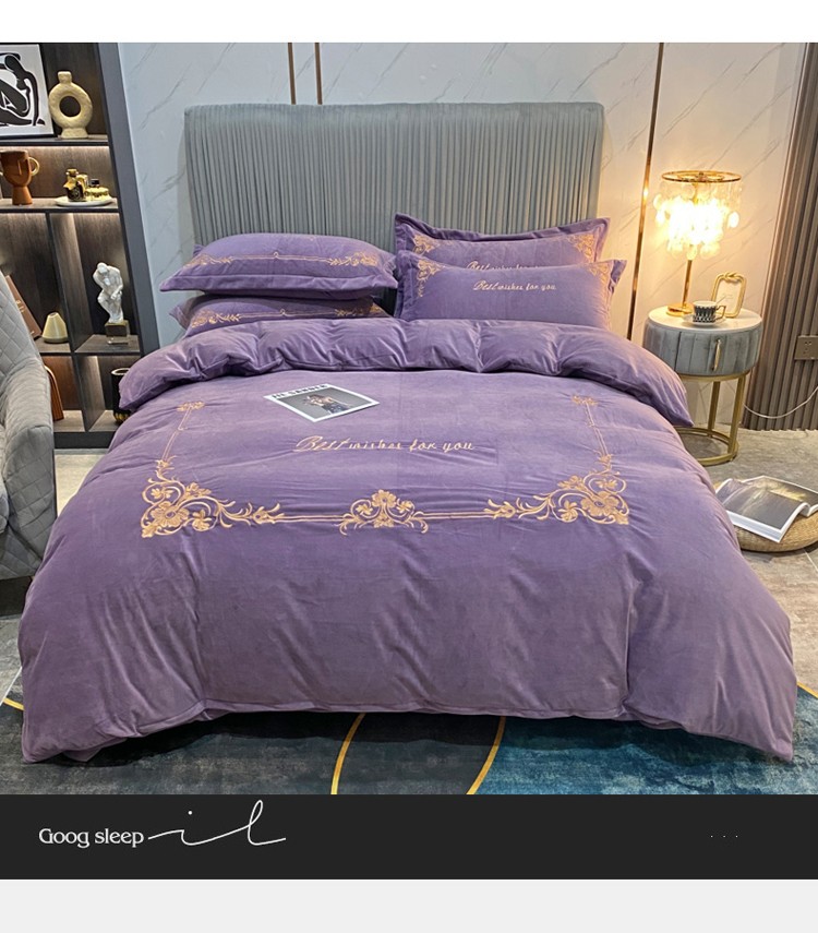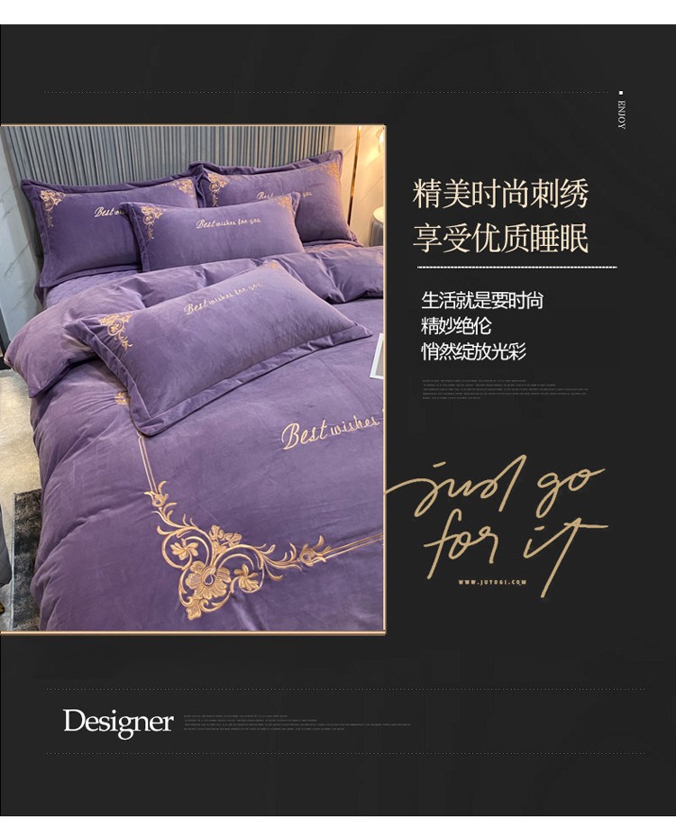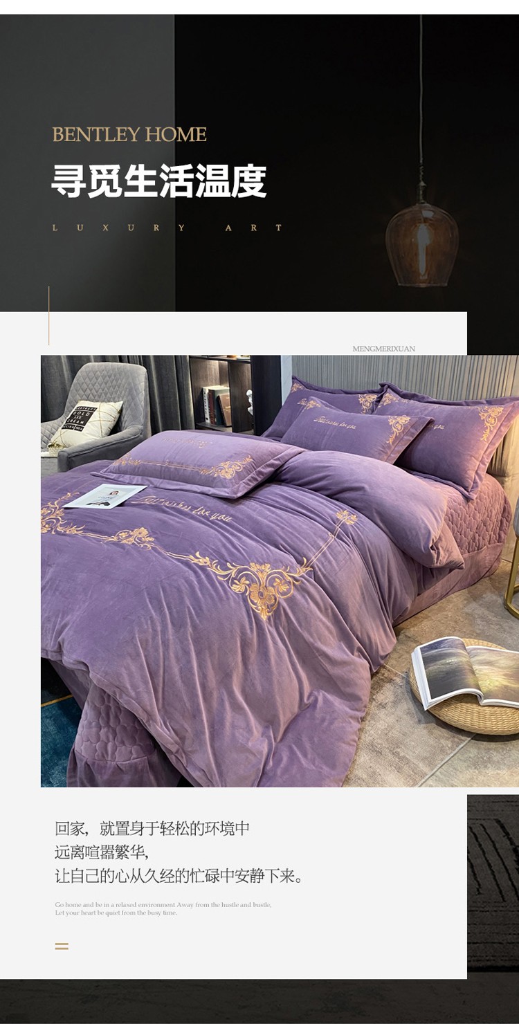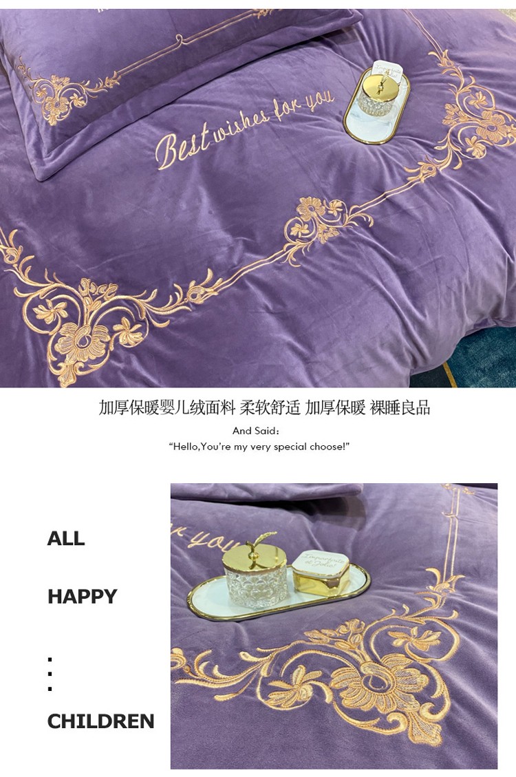 星尚2021高品质婴儿绒夹棉床盖绣花四件套牛奶法莱绒 优雅紫
