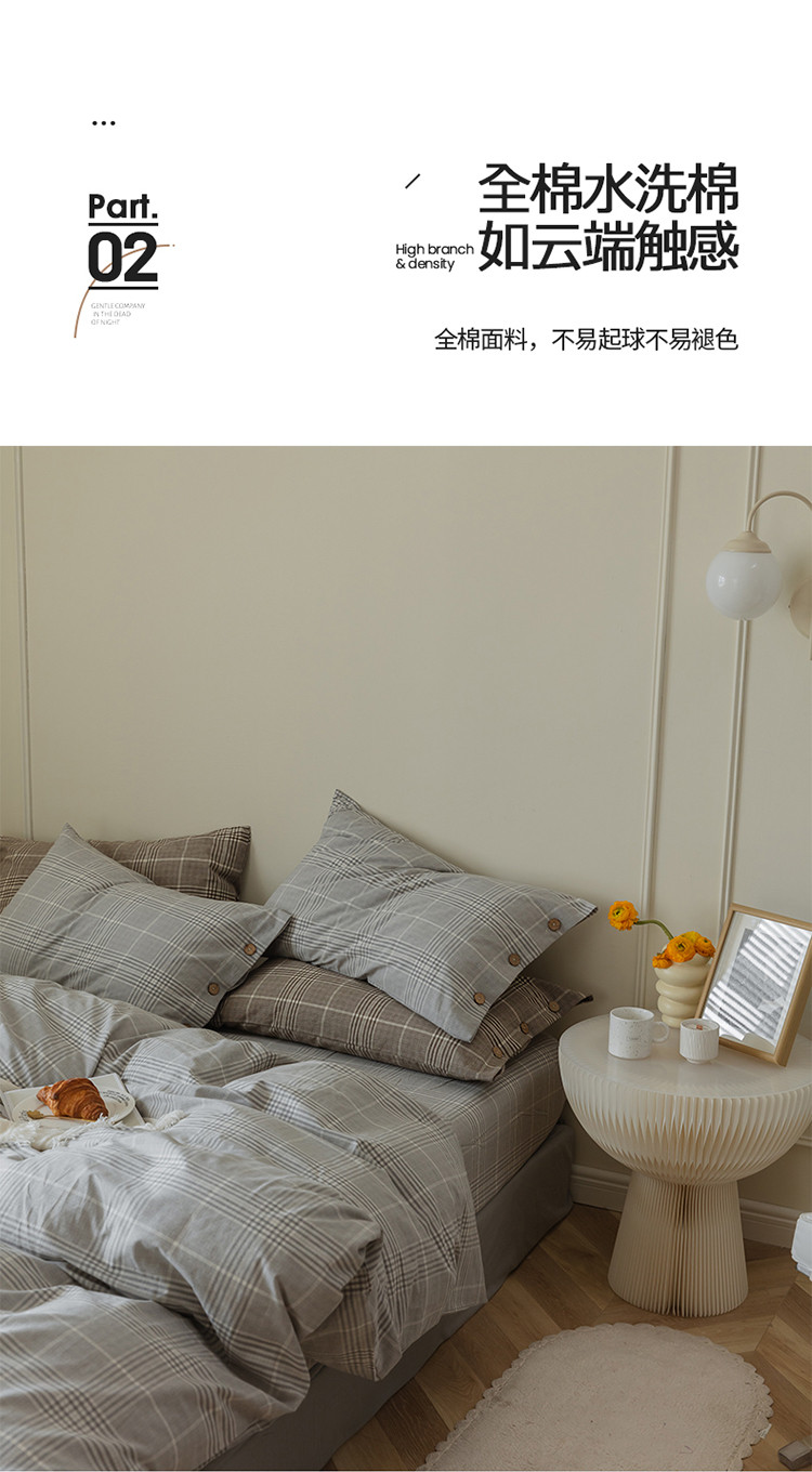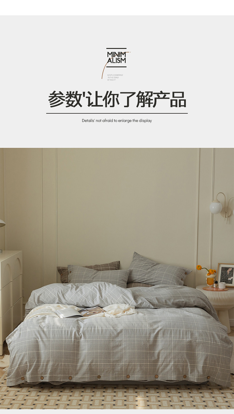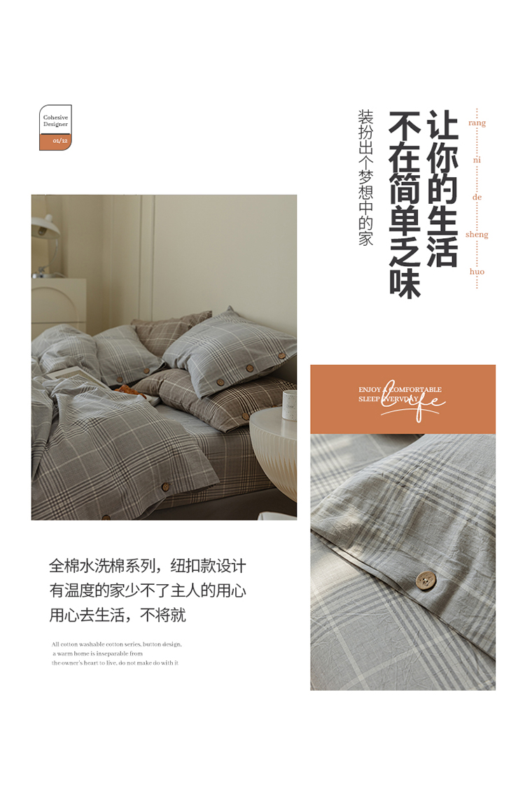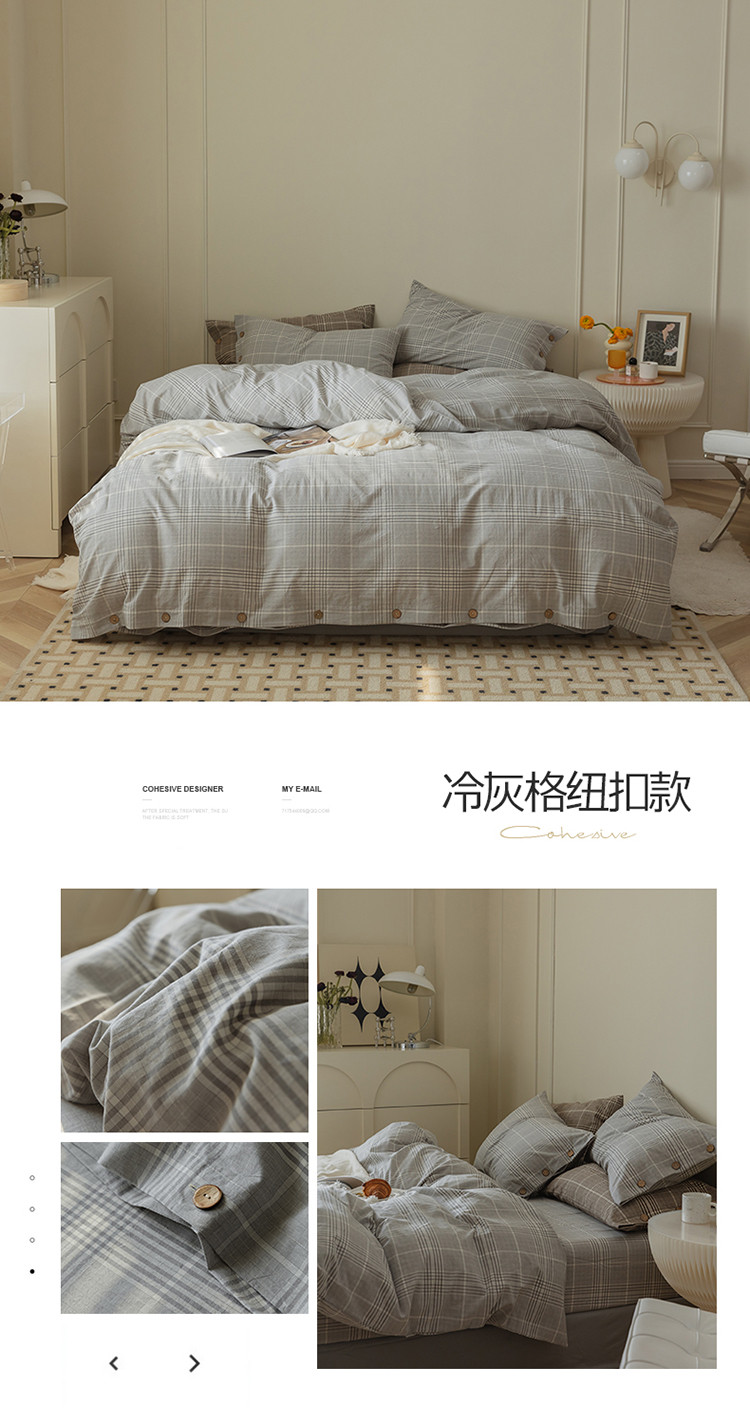 当前位置: 91家纺网 > 商品网购 > 床品套件 > 四件套 > 水洗棉四件套 > 寐眠 22年A类水洗棉全棉纽扣款四件套 冷灰格纽扣款