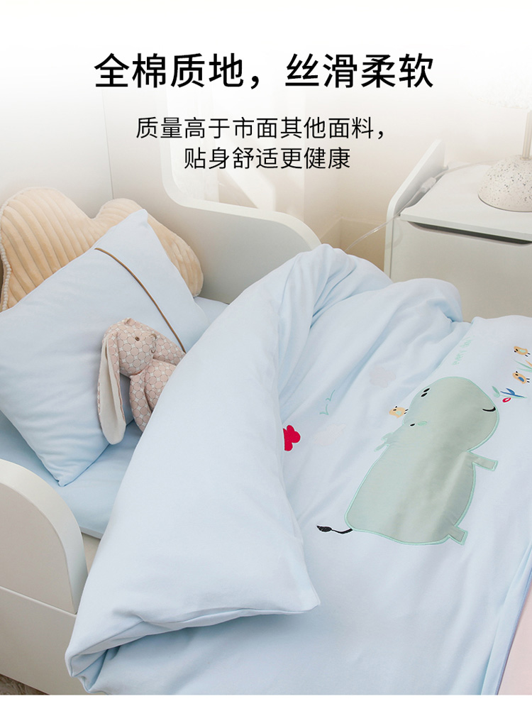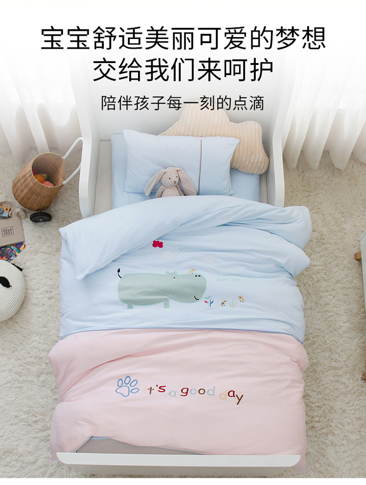 喜多兔 2022新款全棉针织三件套床品套件-神奇伙伴 蓝色排队河马