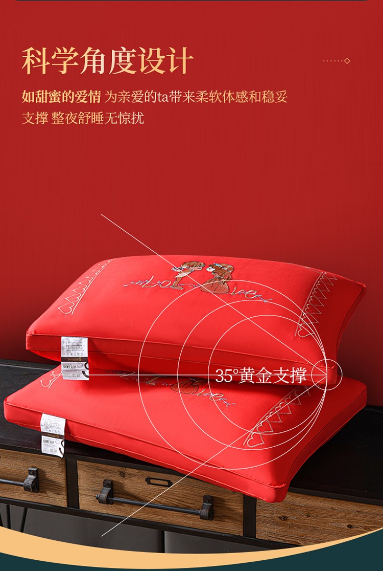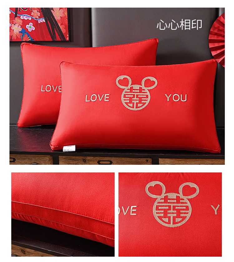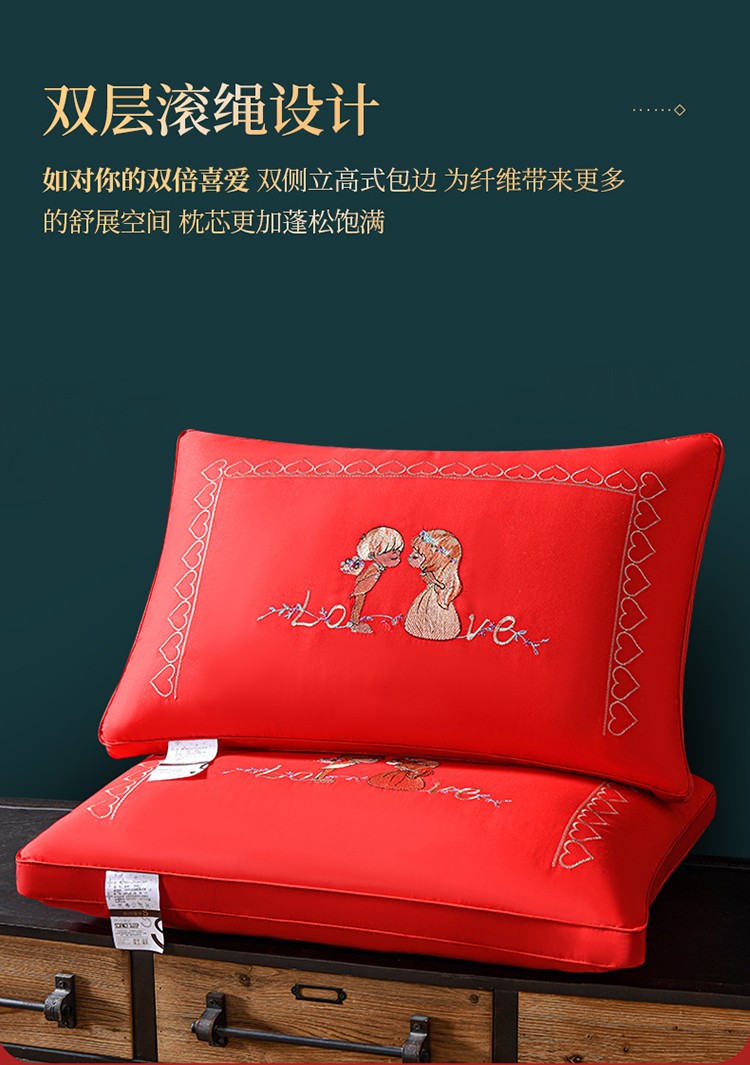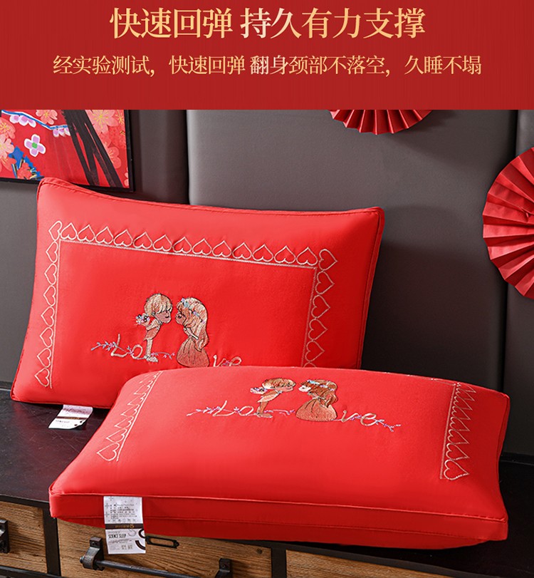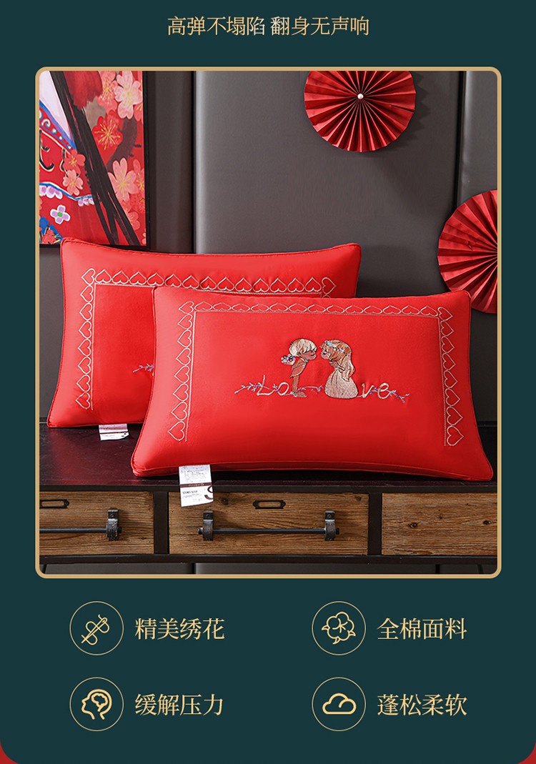 新款婚庆全棉枕芯刺绣款羽丝绒枕头纯棉立体大红色