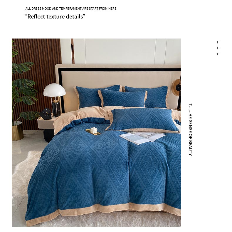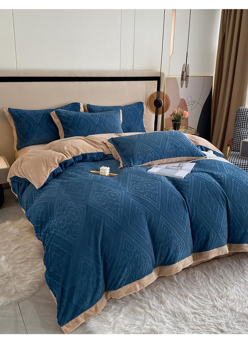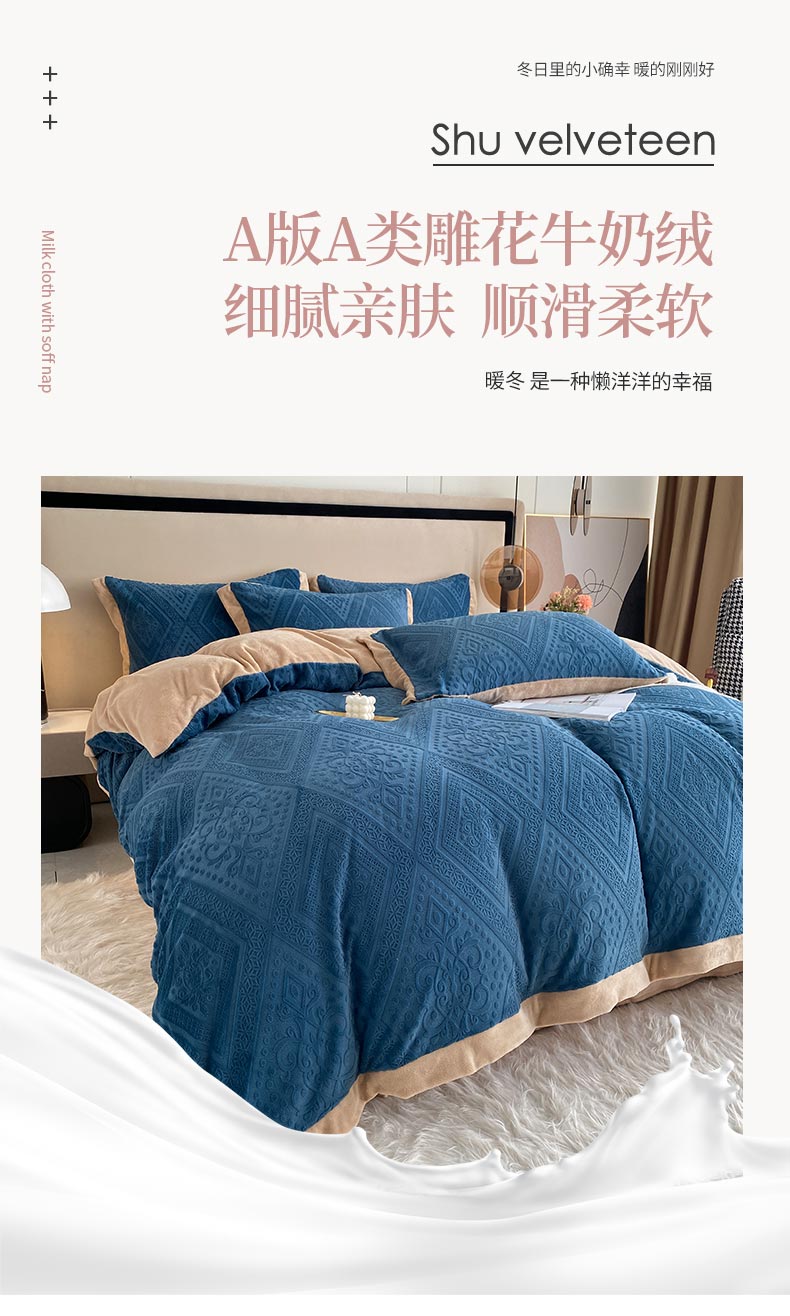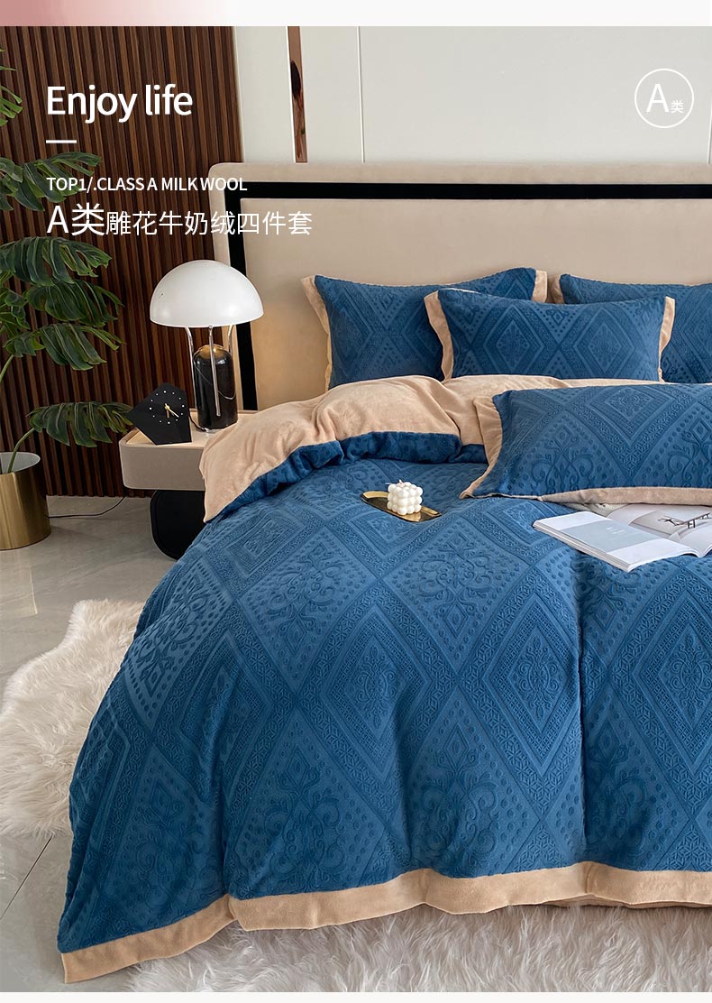 铠畅 2022新款230克轻奢简约烂花绒牛奶绒剪花四件套 欧式经典-蓝