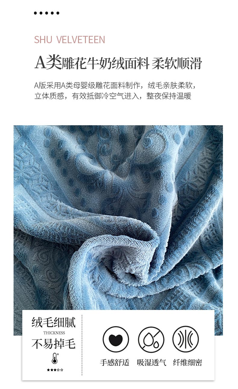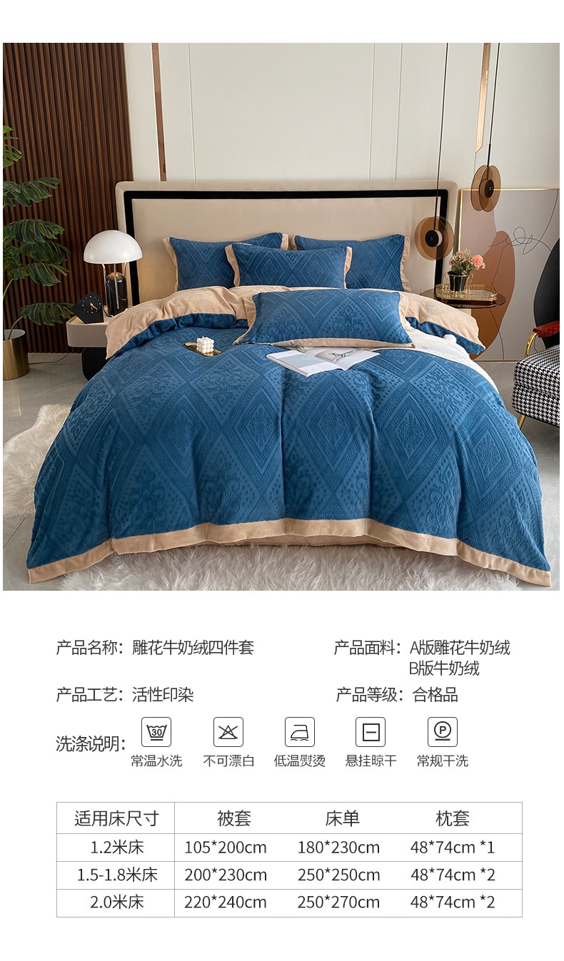 商品名称:铠畅 2022新款230克轻奢简约烂花绒牛奶绒剪花四件套 欧式经典-蓝