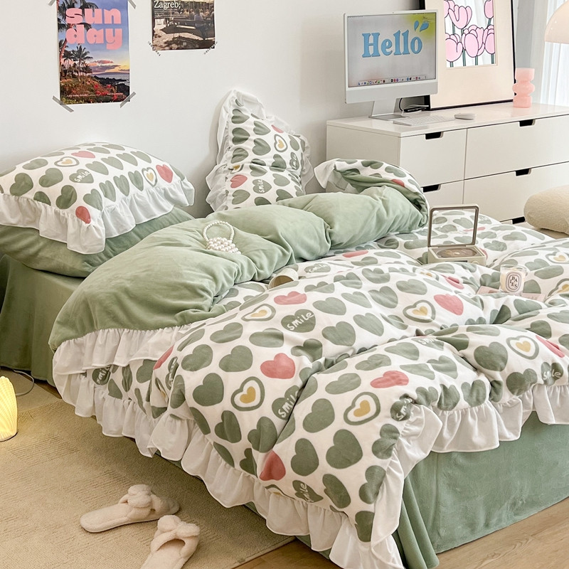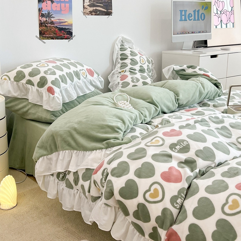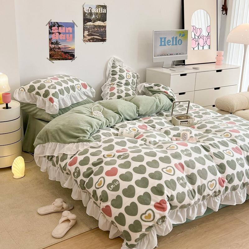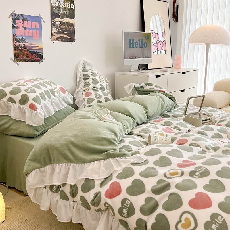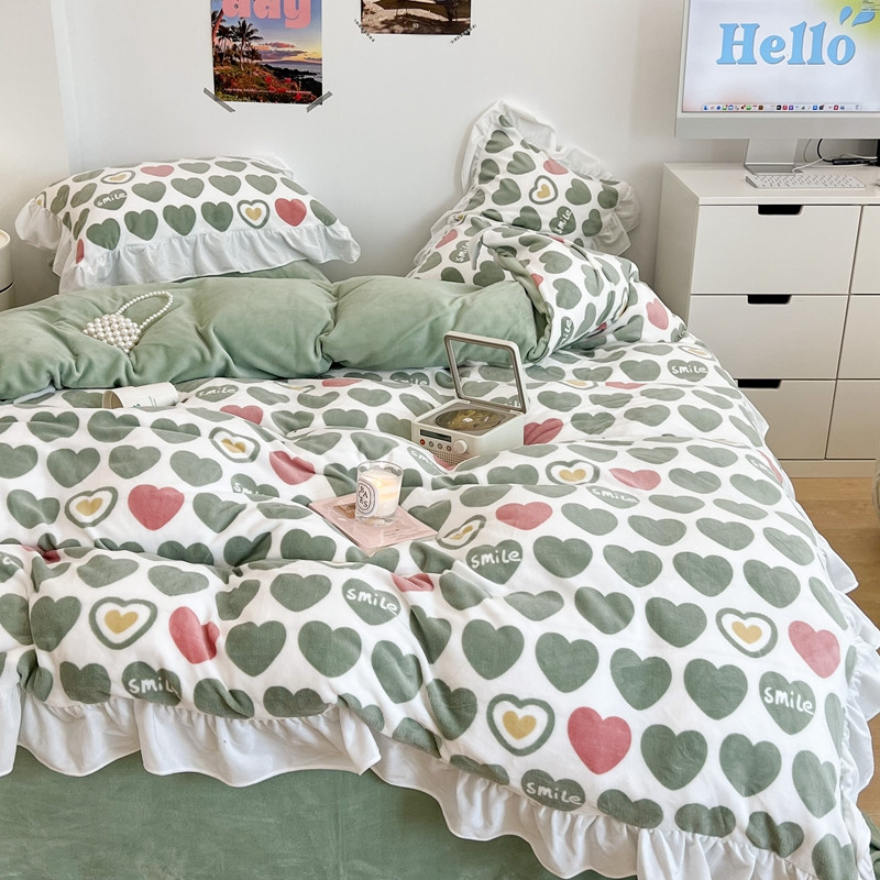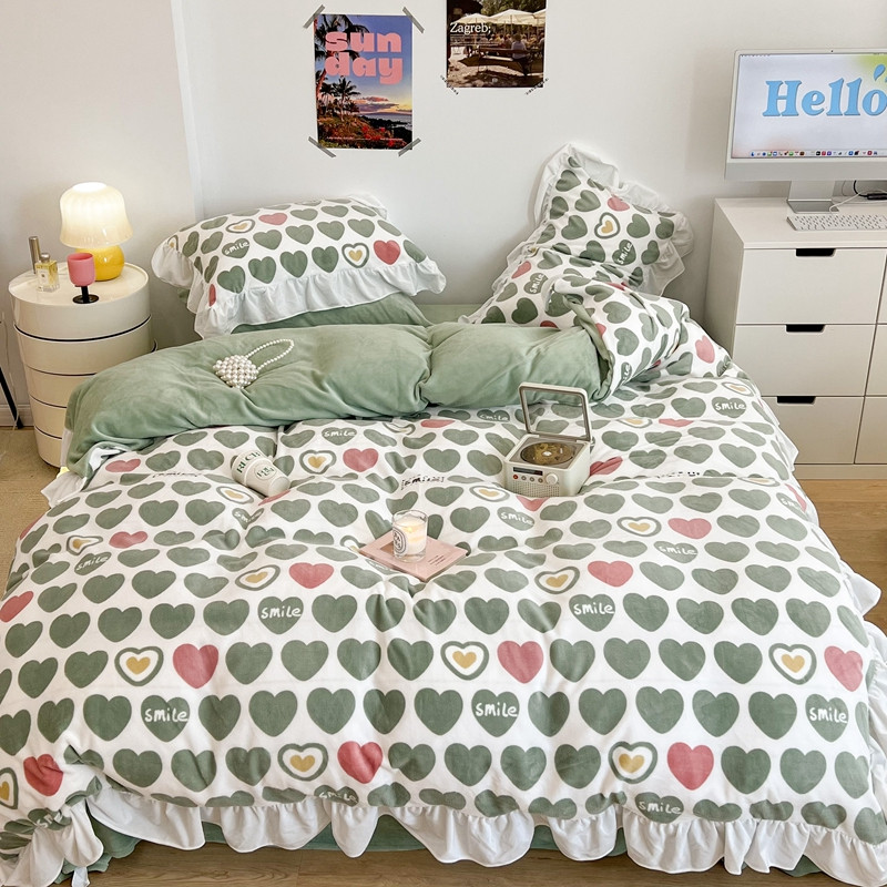 昔可 2022新款花边牛奶绒四件套 微笑爱心绿
