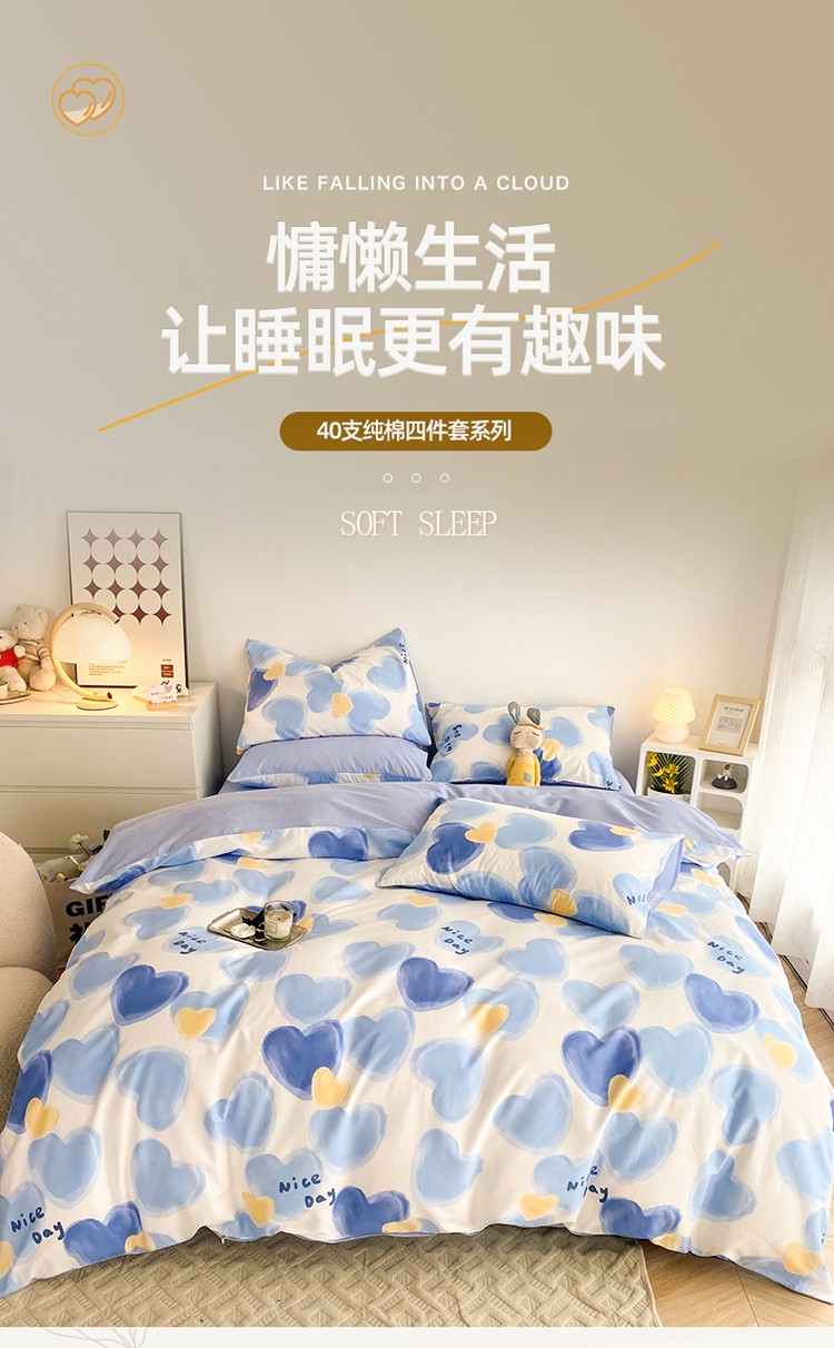 简宜家居 2023新款小清新卡通纯棉全棉斜纹四件套 蓝色心愿