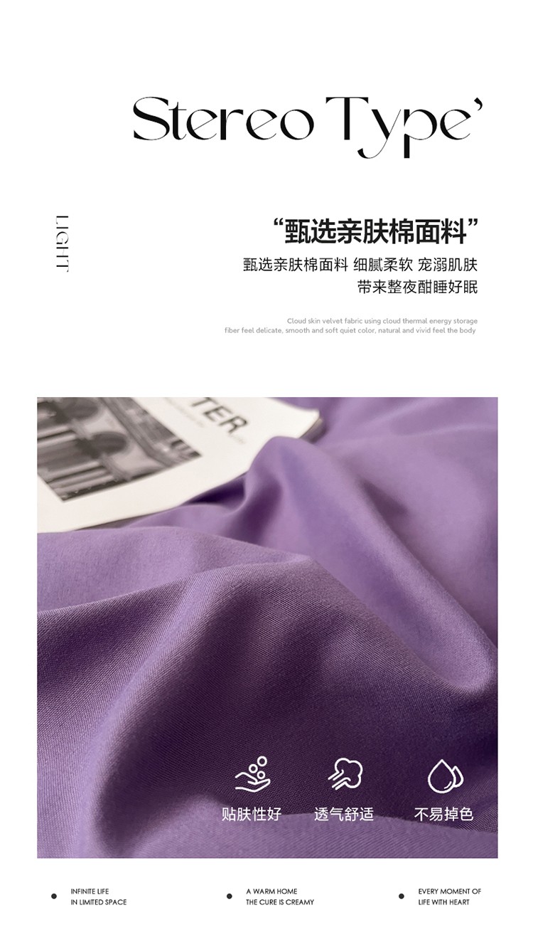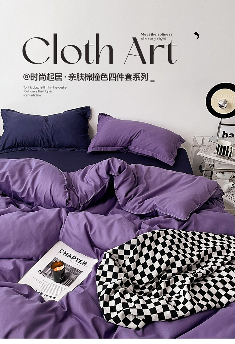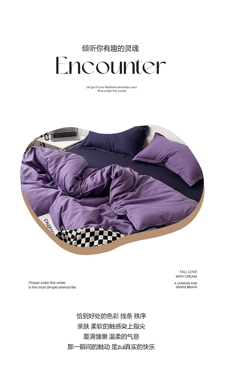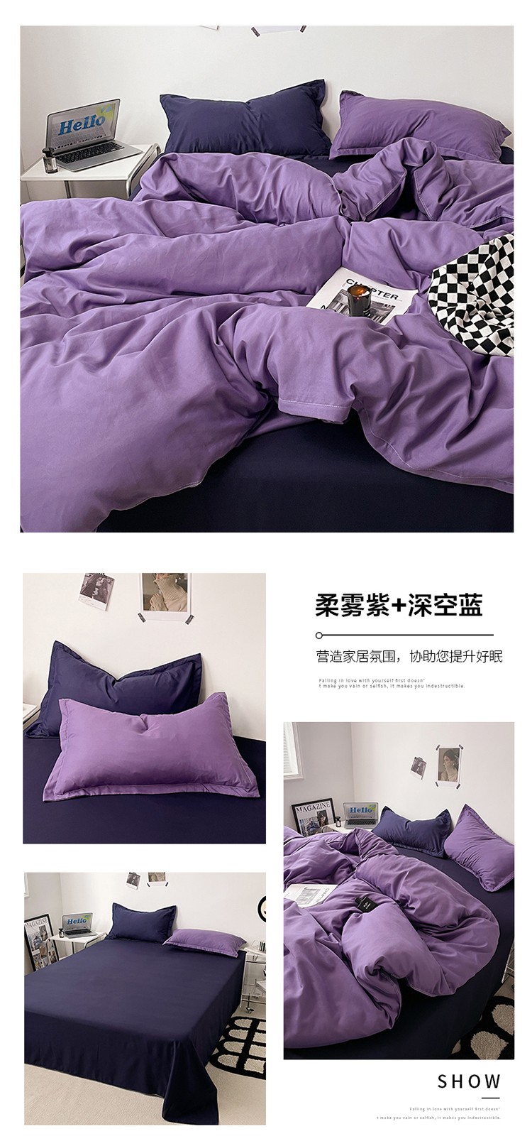 商品名称:贝拉梦 2023款亲肤棉纯色拼色治 愈系四件套 柔雾紫+深空蓝