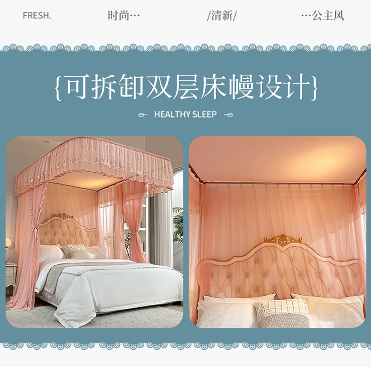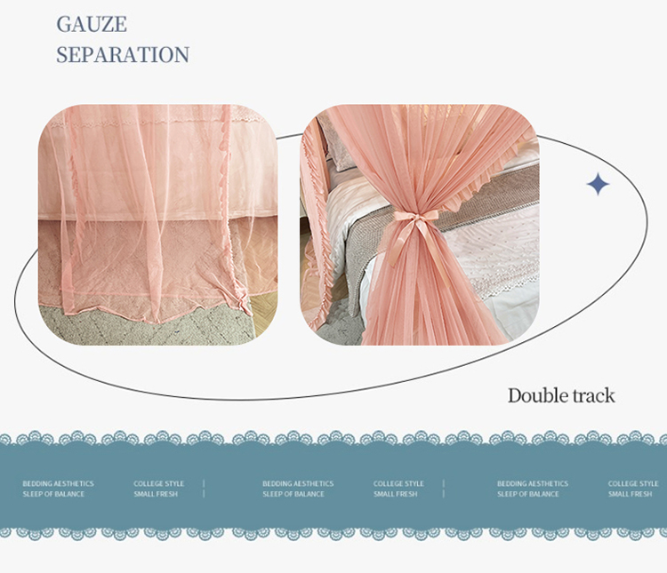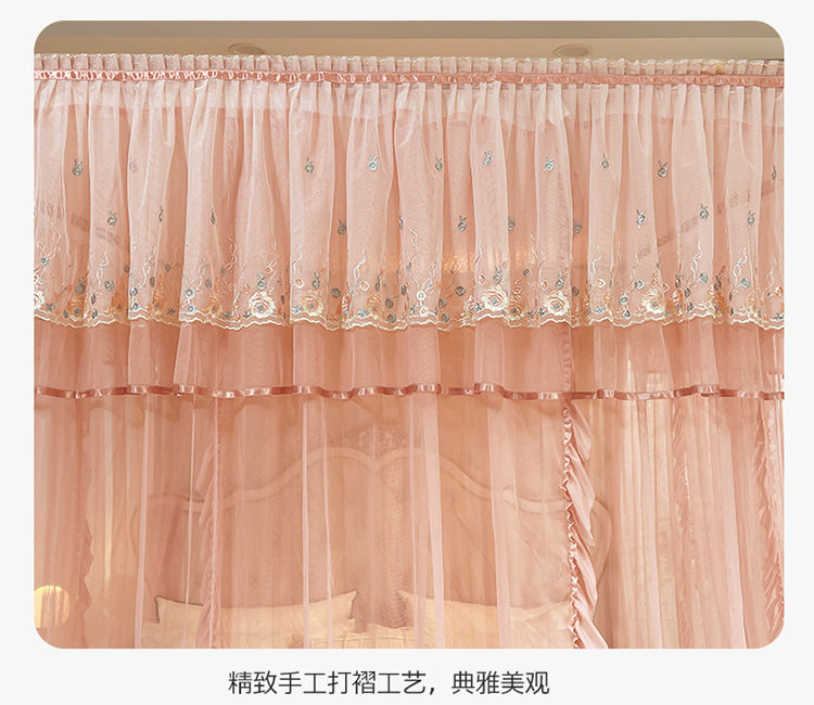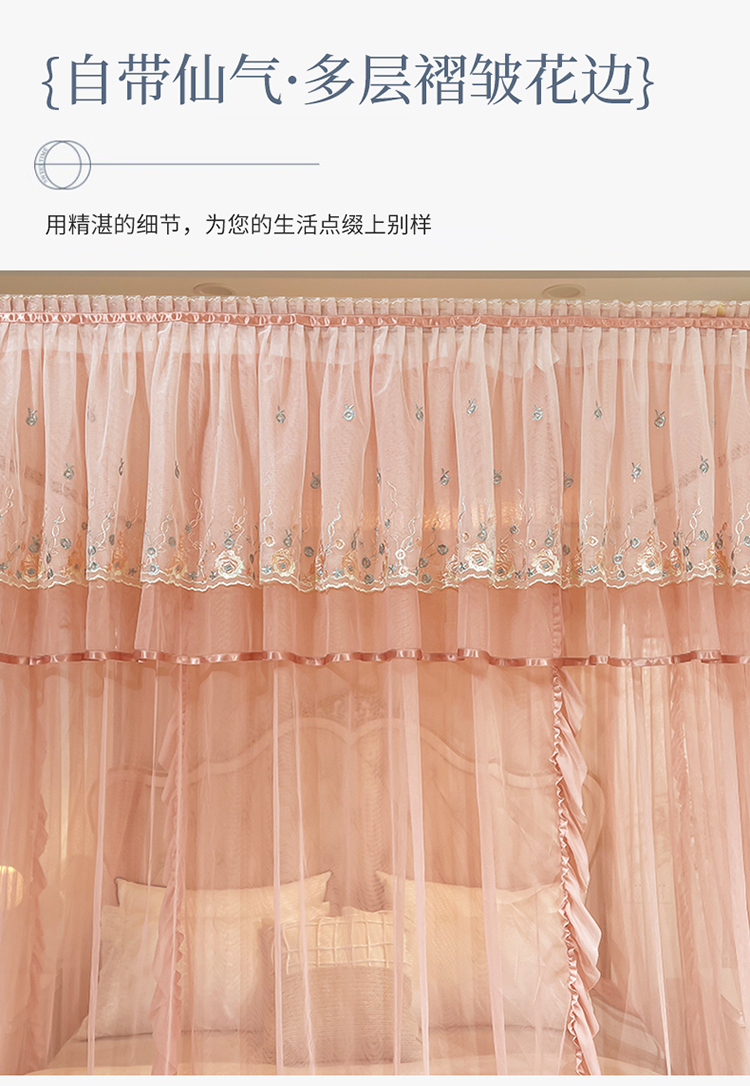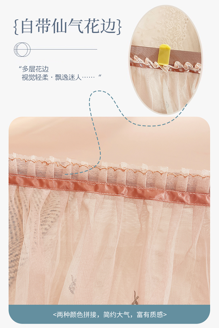 (总)2025新款双层花边全包围床笠款三开门蚊帐-幽梦星辰,奶黄,藕玉,颜淡蓝