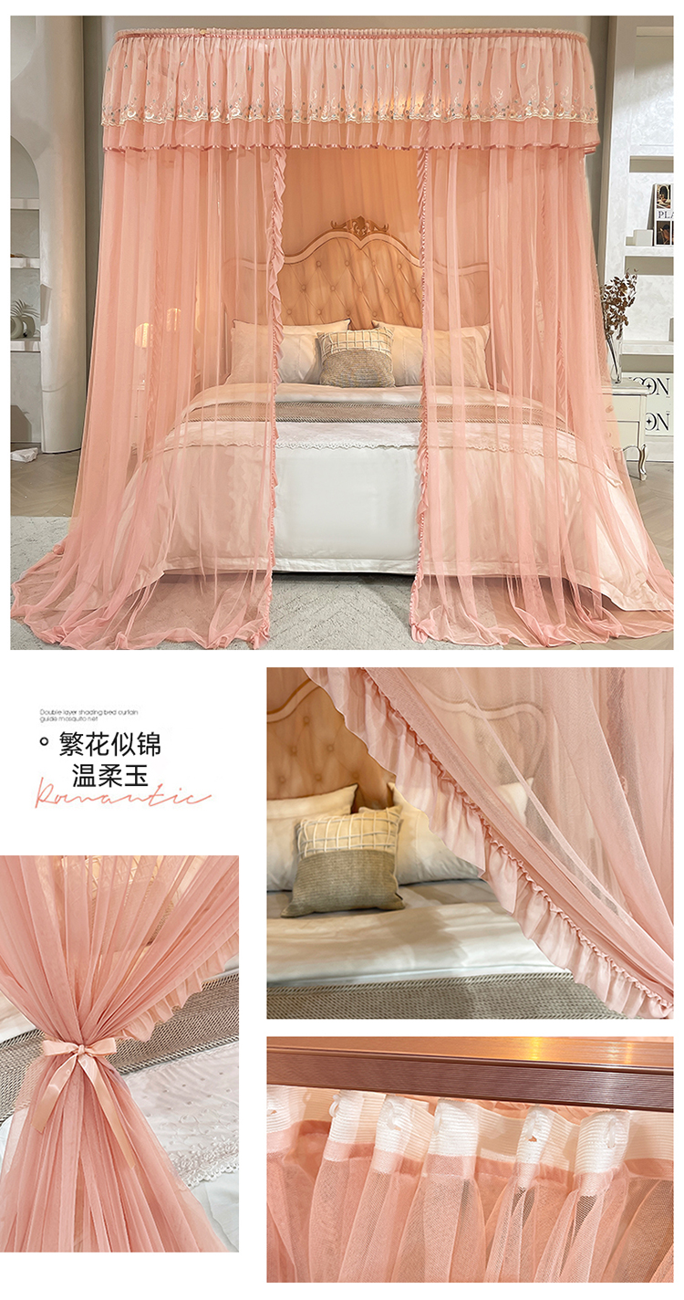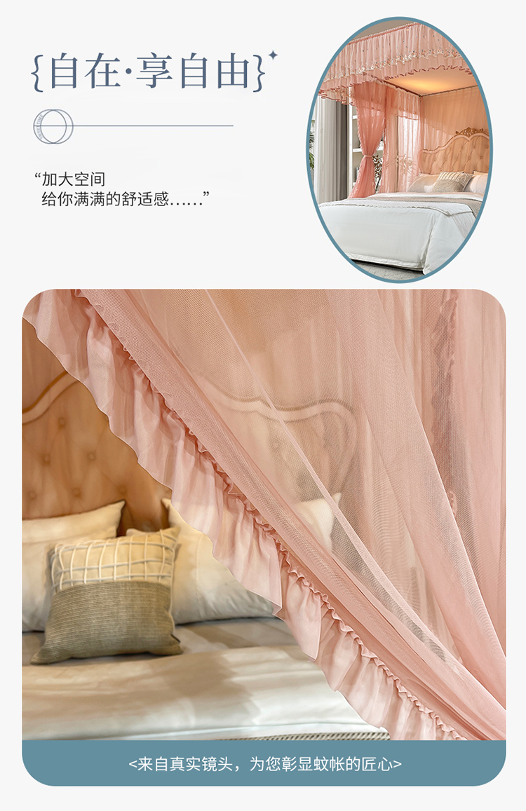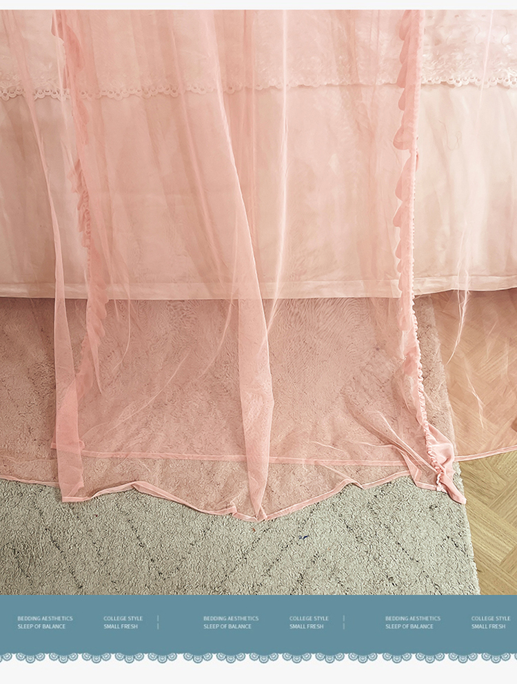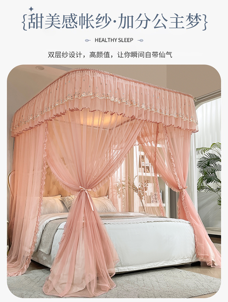 (总)2025新款双层花边全包围床笠款三开门蚊帐-幽梦星辰,奶黄,藕玉,颜淡蓝