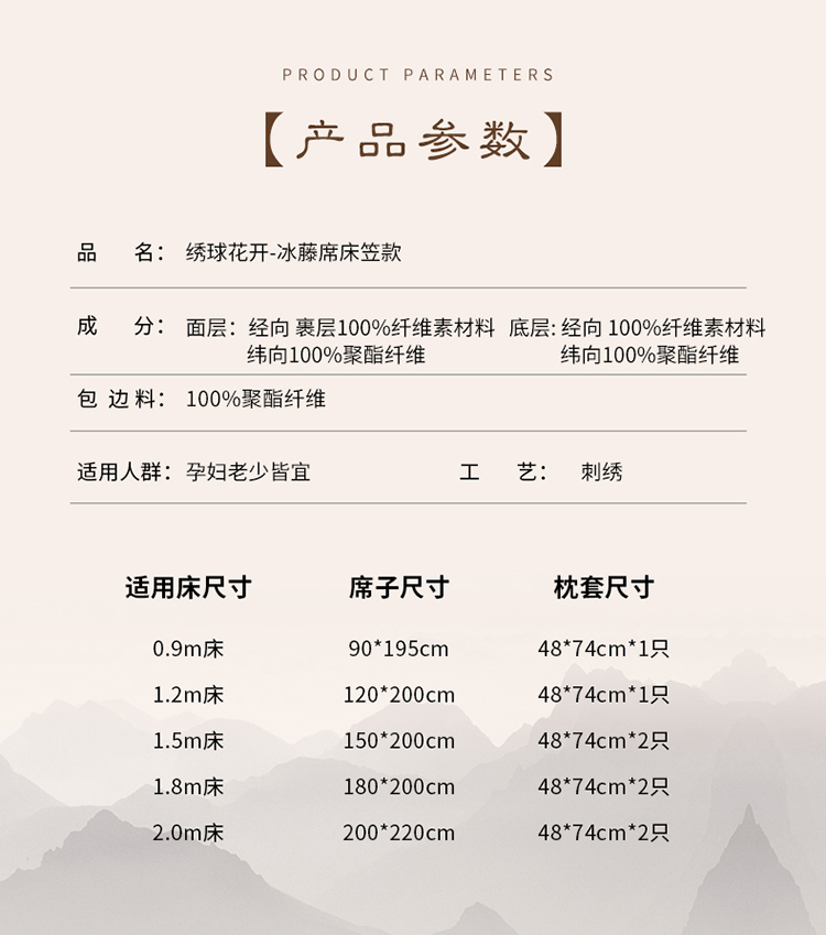 商品名称:(总)小牛席业2023新款绣球花开冰藤双面席床笠款系列凉席藤席冰丝席