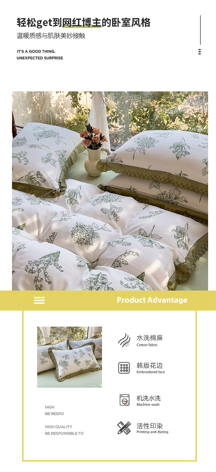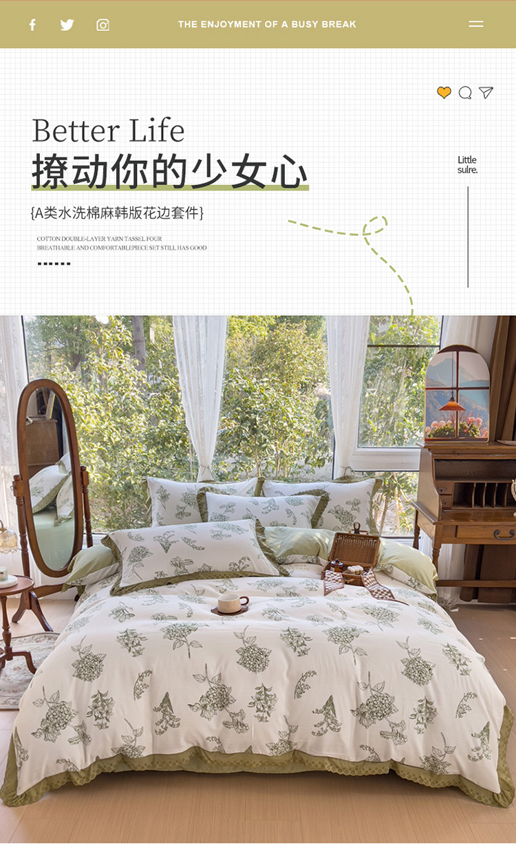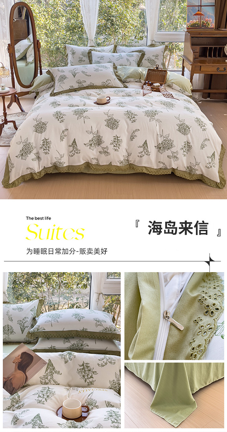 当前位置: 91家纺网 > 商品网购 > 床品套件 > 四件套 > 水洗棉四件套 > 大米 2023新款复古花边A类印花水洗棉麻四件套 海岛来信