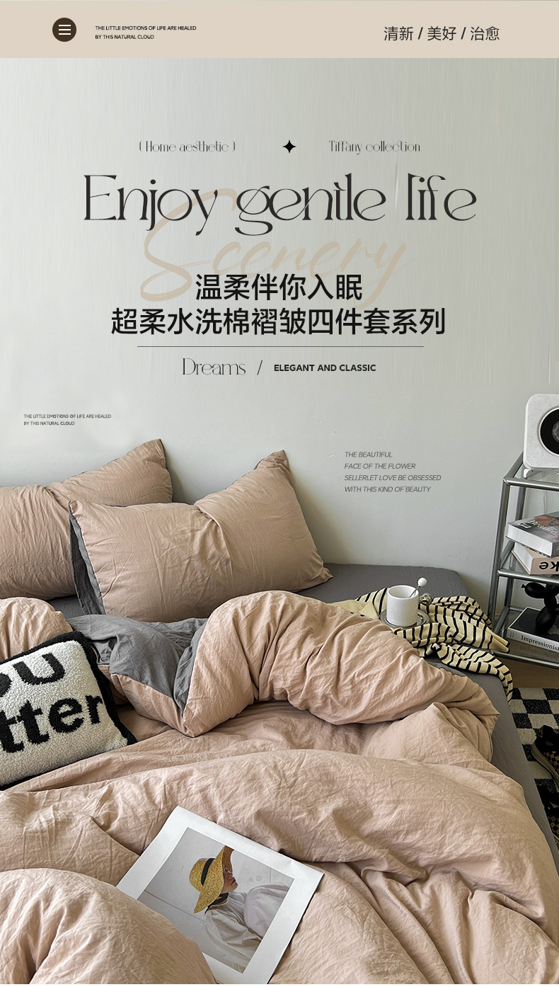 (总)水墨江南 2025新款亲肤磨毛水洗棉纯色四件套,翡绿,暗夜绿,碧蓝,橄榄绿,墨灰,浅灰深灰,雅白,藻绿米黄,中驼