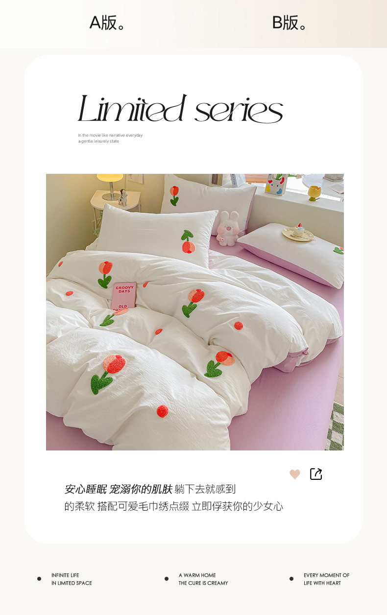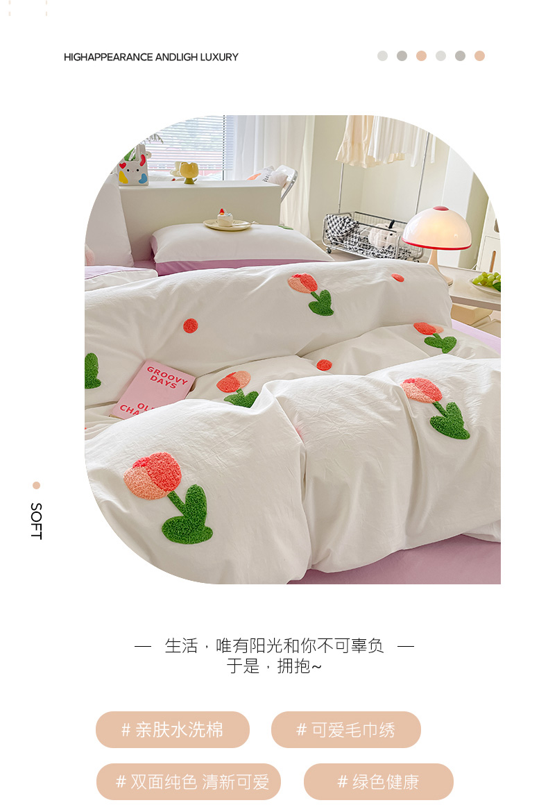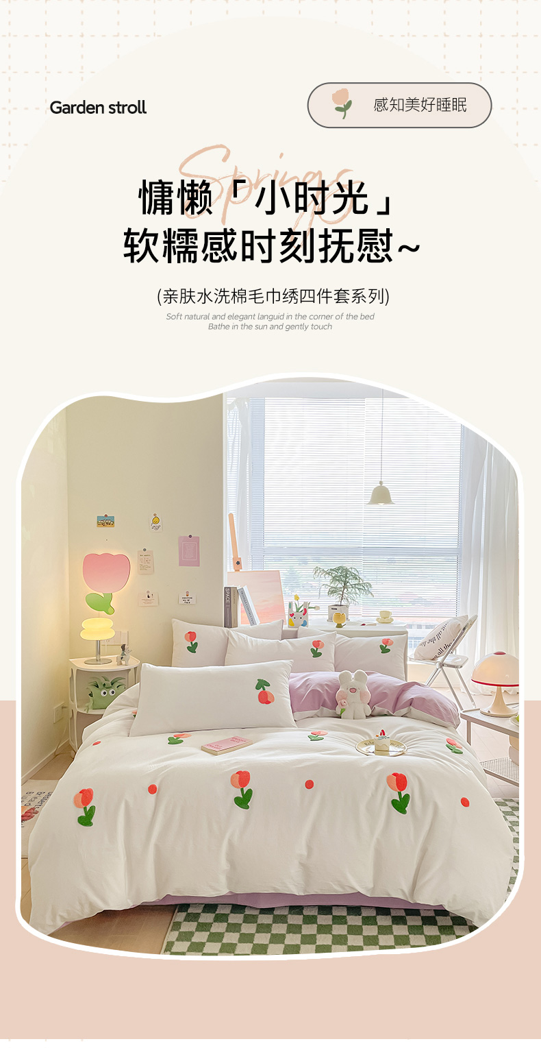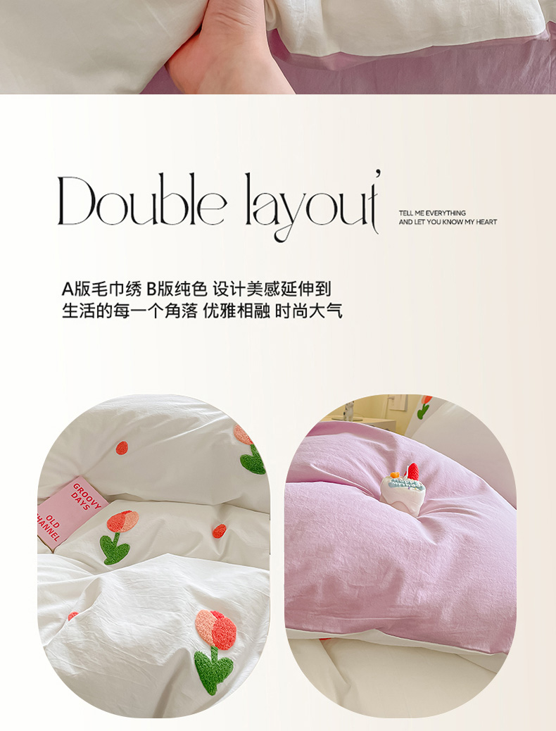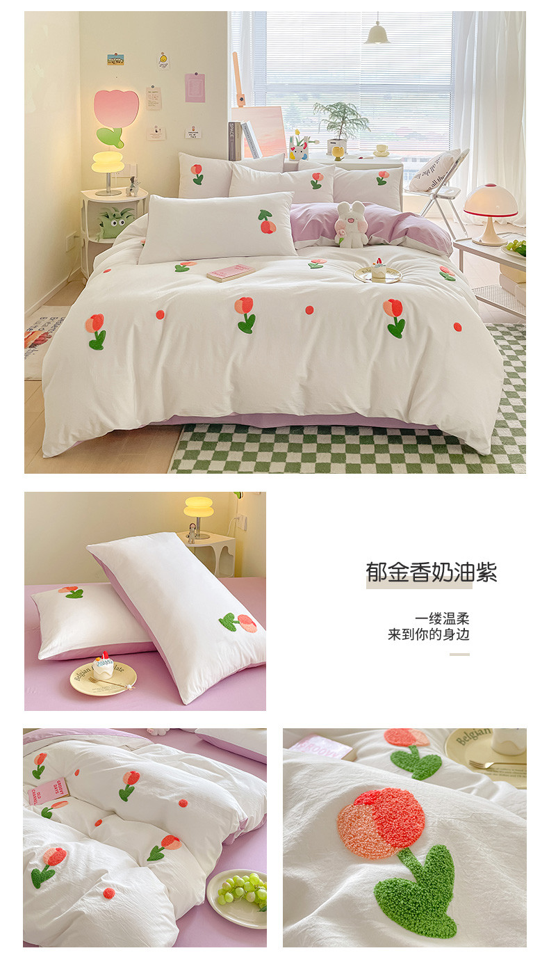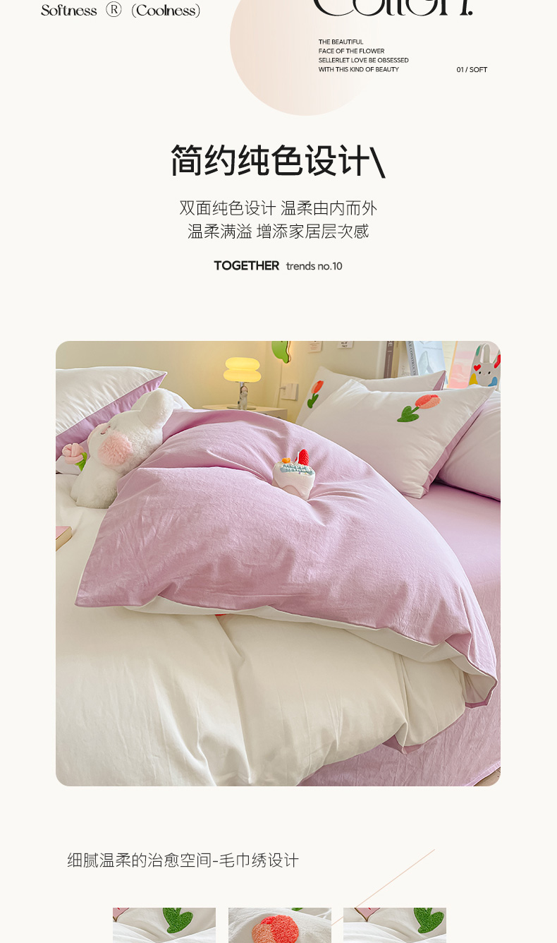 当前位置: 91家纺网 > 商品网购 > 床品套件 > 四件套 > 毛巾绣四件套 > 眠帛家居 2023新款A类水洗棉毛巾绣四件套 郁金香奶油紫