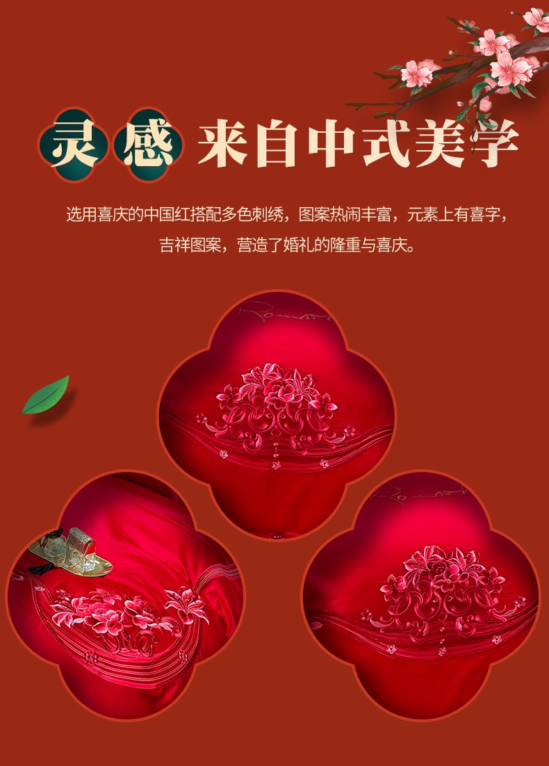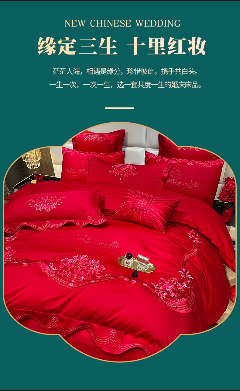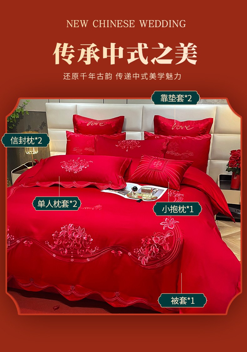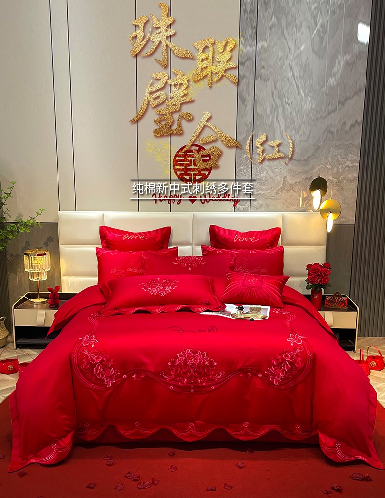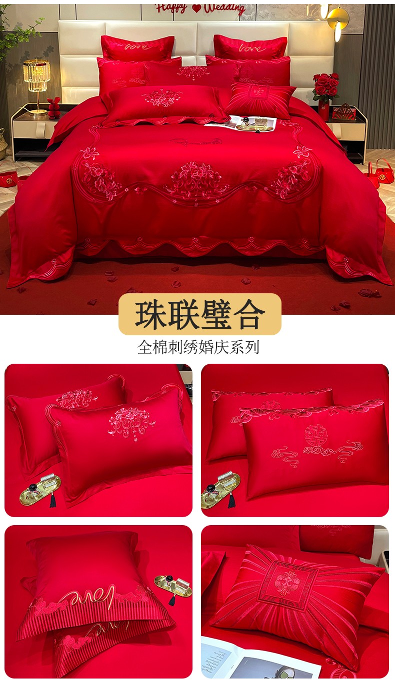当前位置: 91家纺网 > 商品网购 > 床品套件 > 多件套 > 多件套 > 红番天 2023新款全棉刺绣婚庆四件套六件套多件套 珠联璧合-红