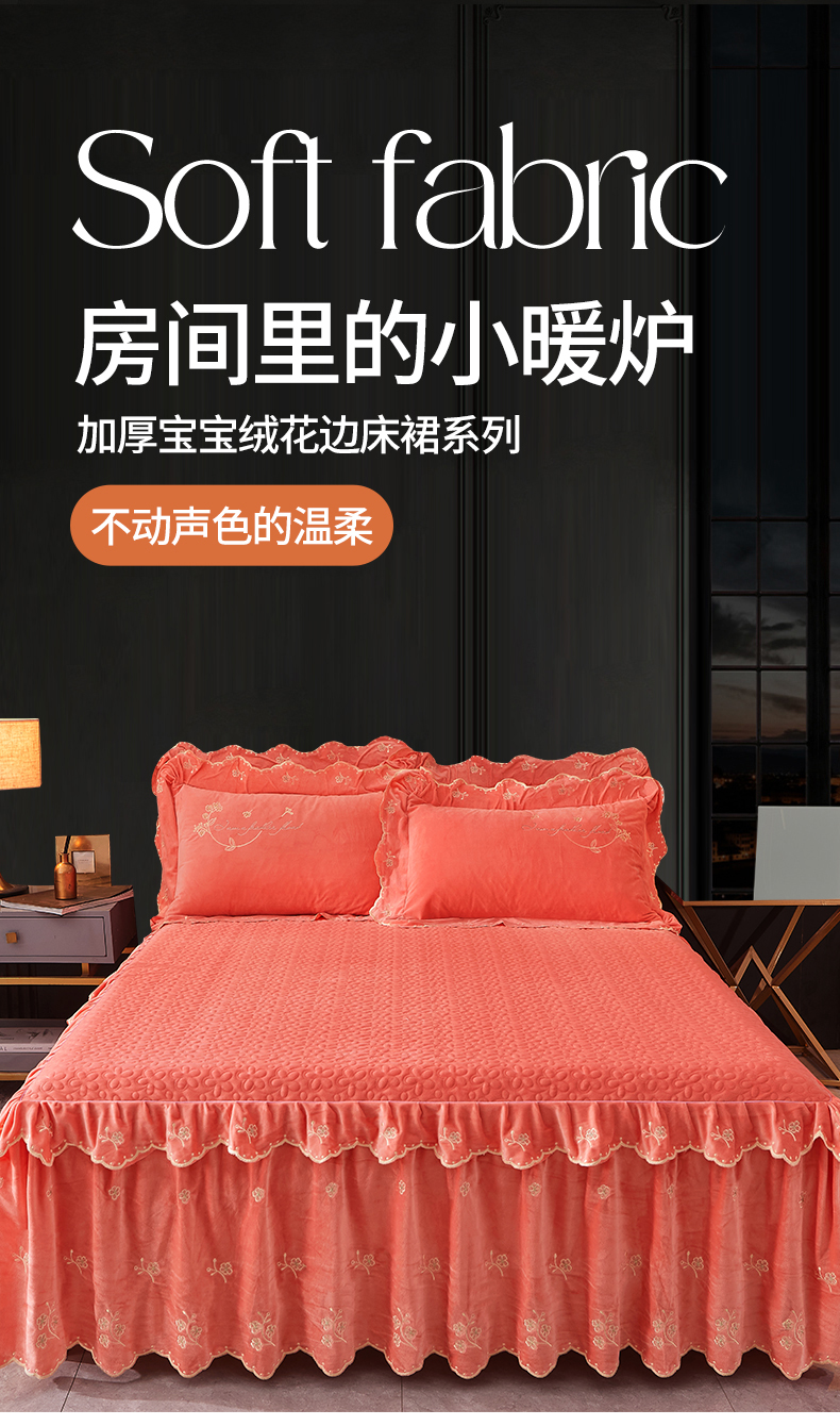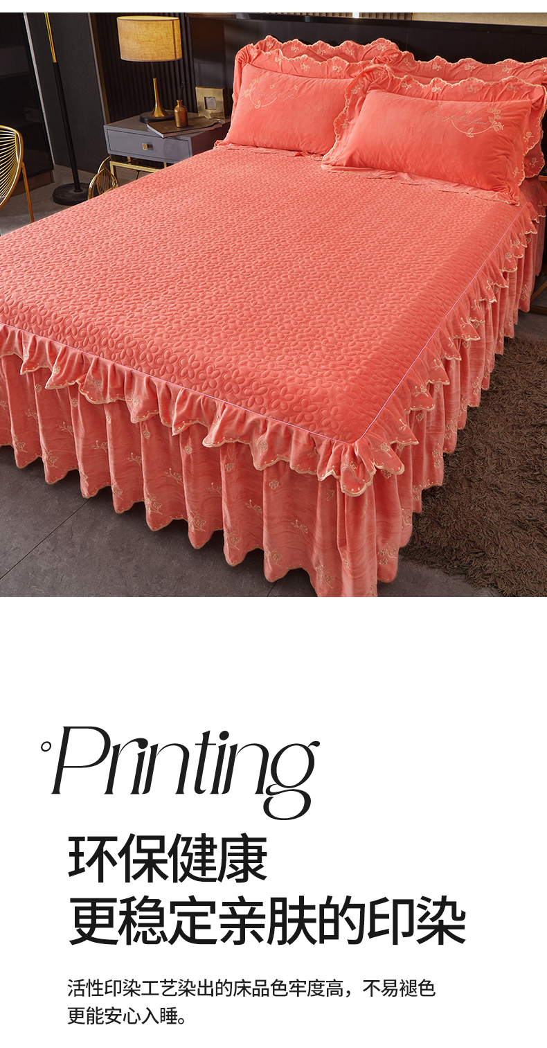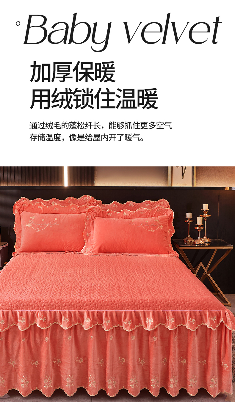 (总)恒爱 2022秋冬水晶绒翩翩花舞夹棉单床裙,大红色,豆沙红,橄榄绿,公主粉,桔色,咖啡色,孔雀绿,拉菲红,罗兰紫,玫红色,美人玉,米白色,米驼色,抹茶绿,浅灰色,紫色