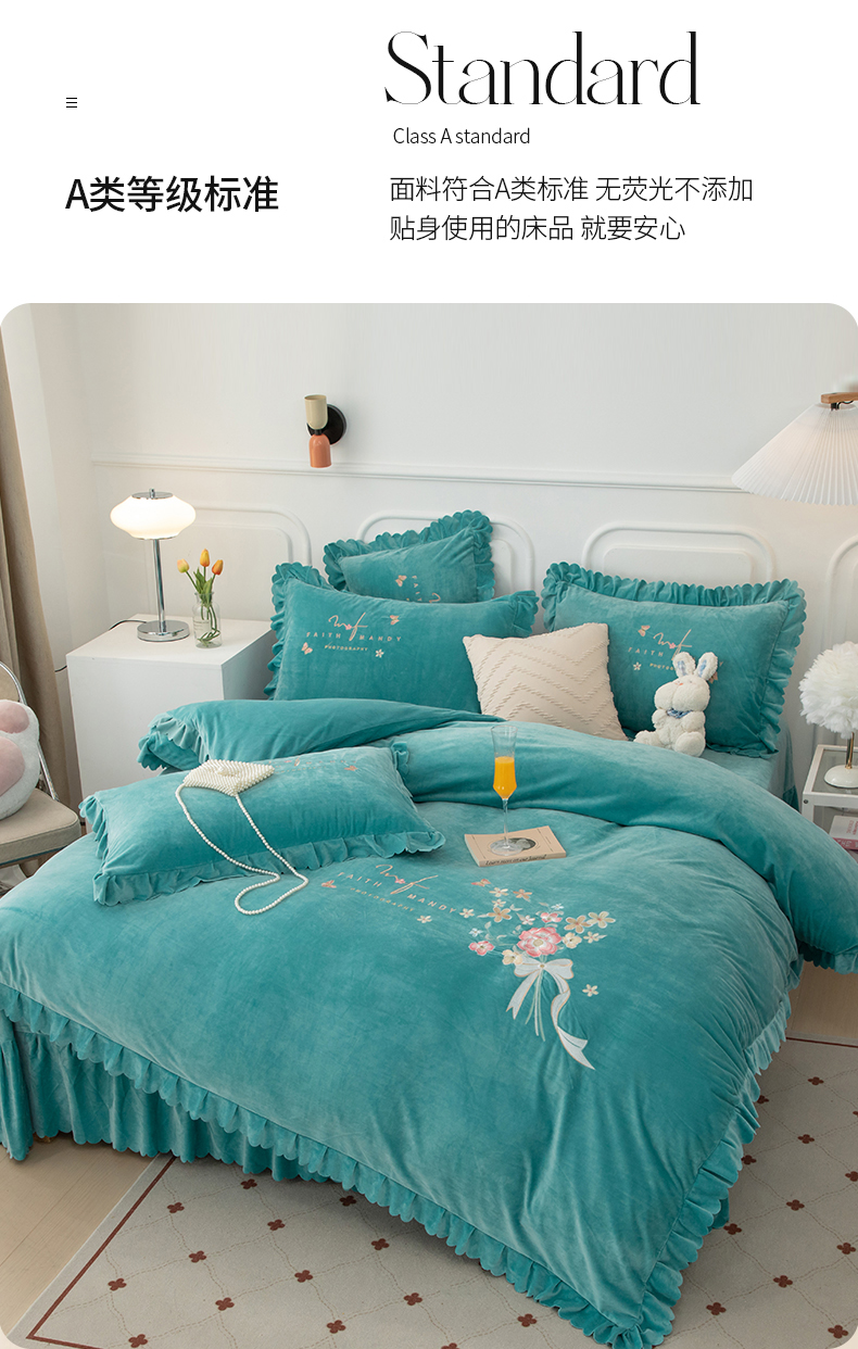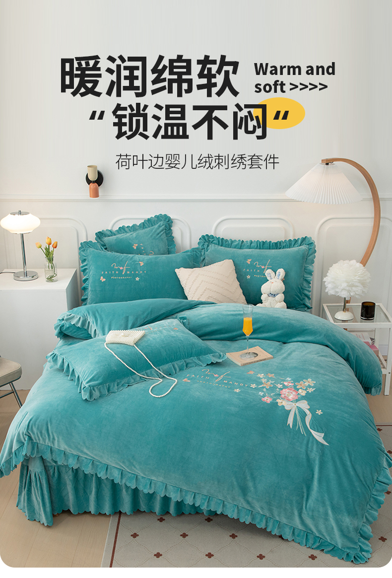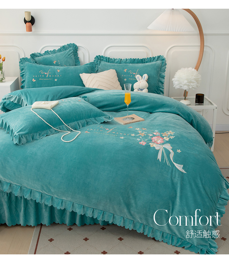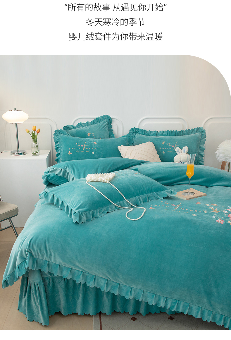 优姿家纺 2024新品8.5斤德芙绒韩版床裙绣花保暖四件套 今生有约湖兰