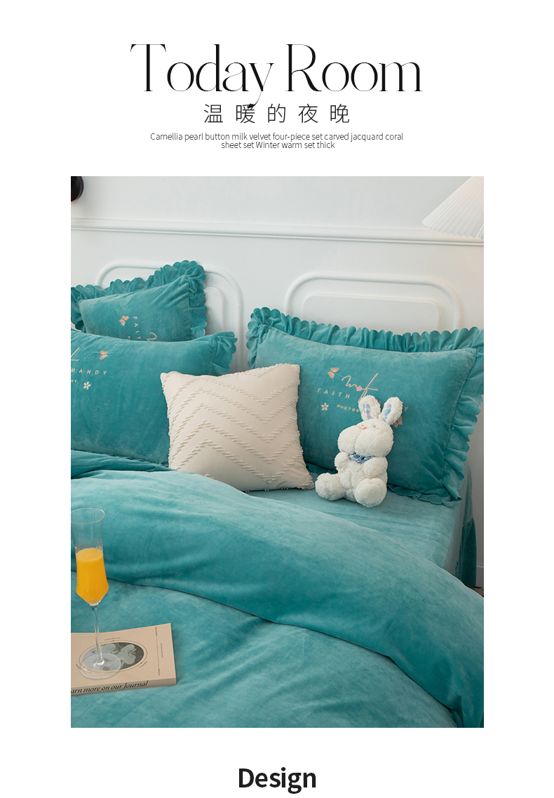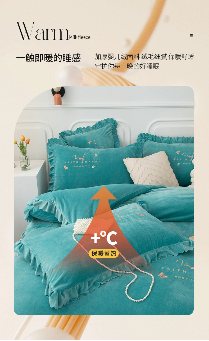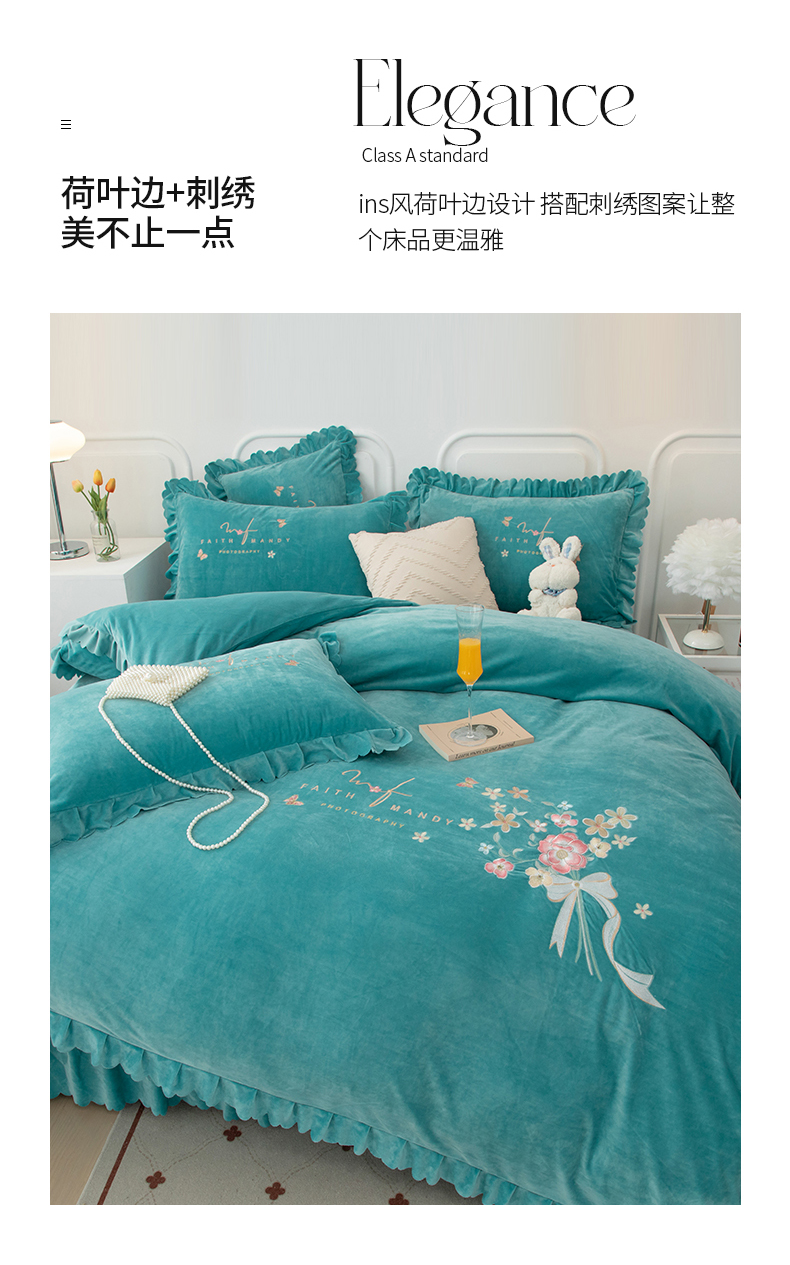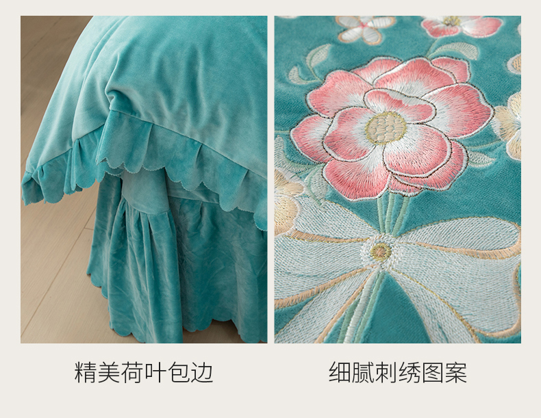 优姿家纺 2024新品8.5斤德芙绒韩版床裙绣花保暖四件套 今生有约湖兰
