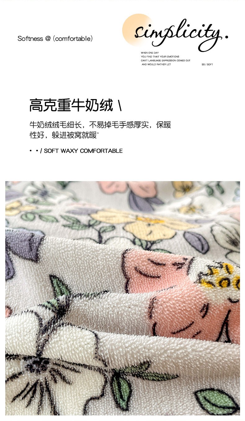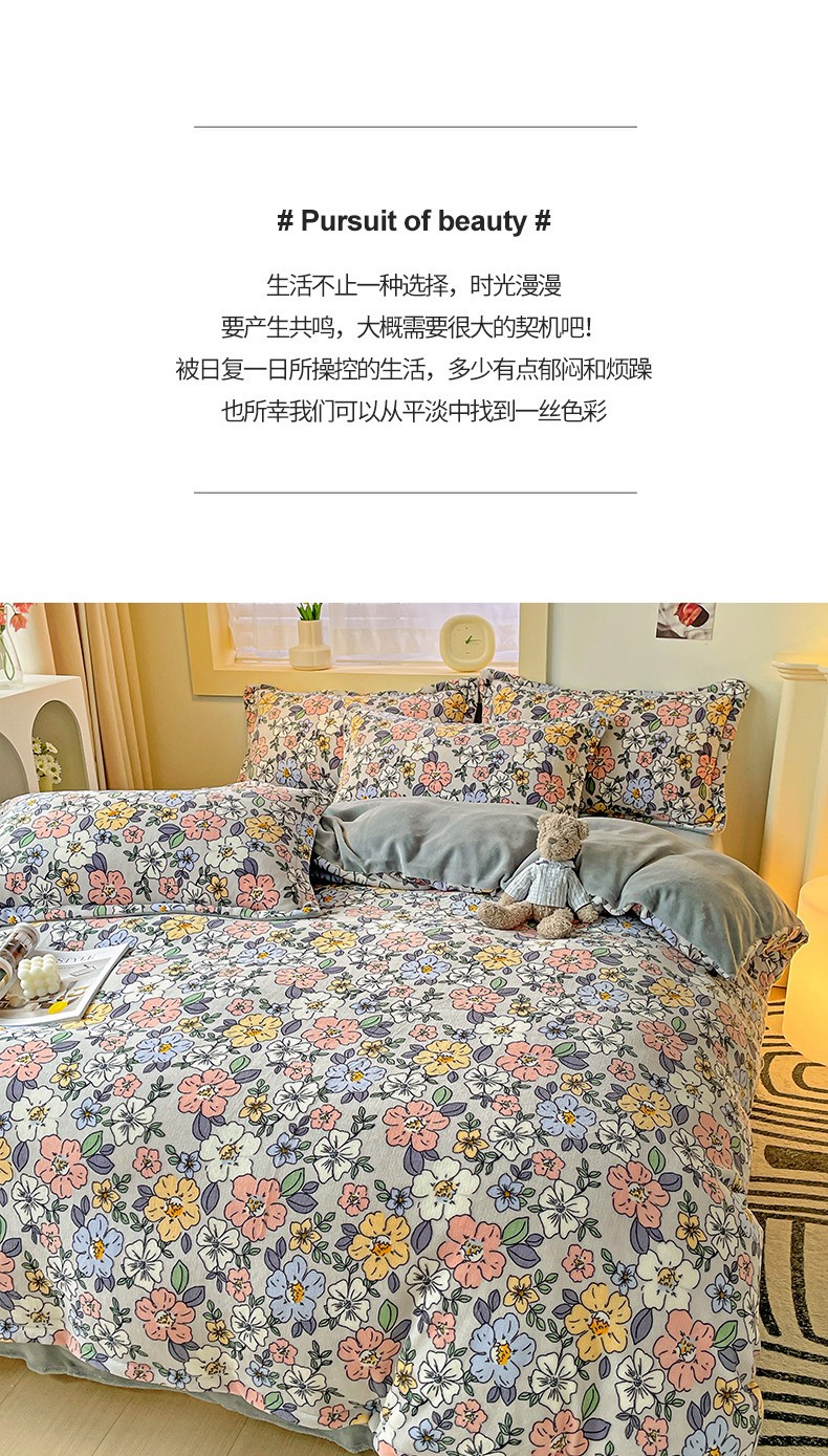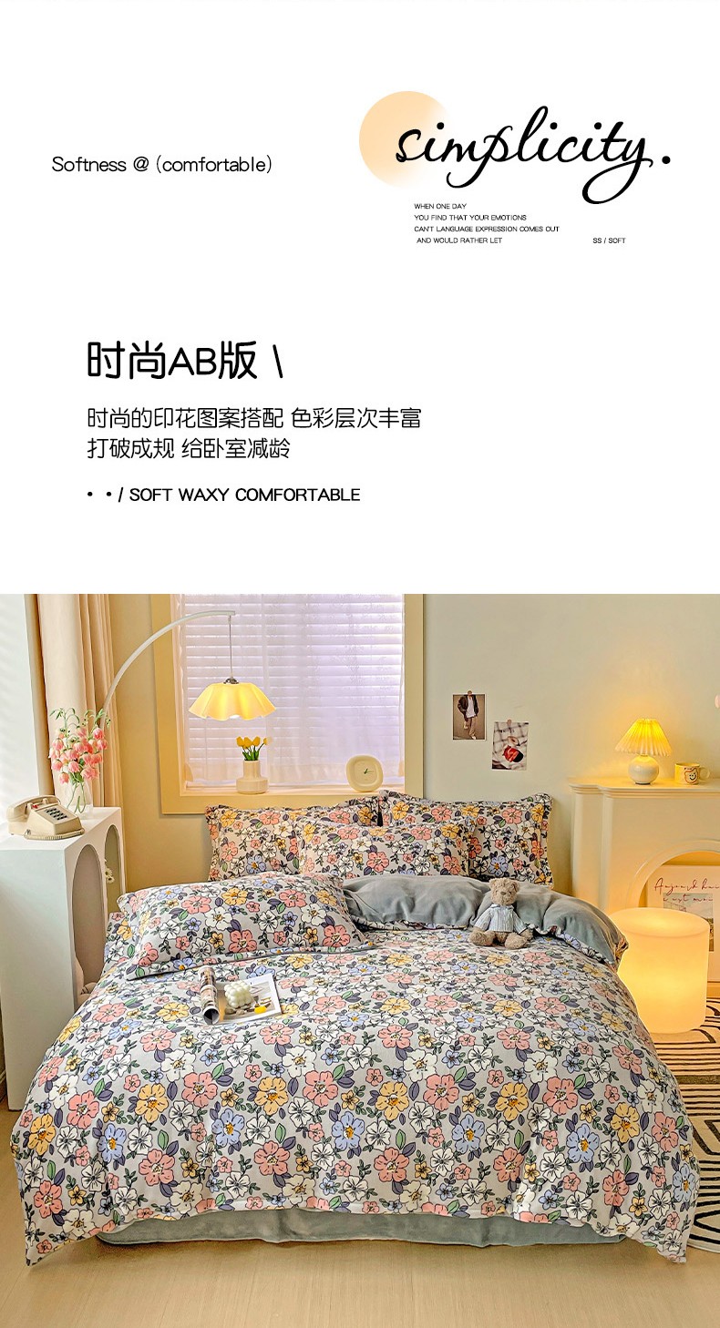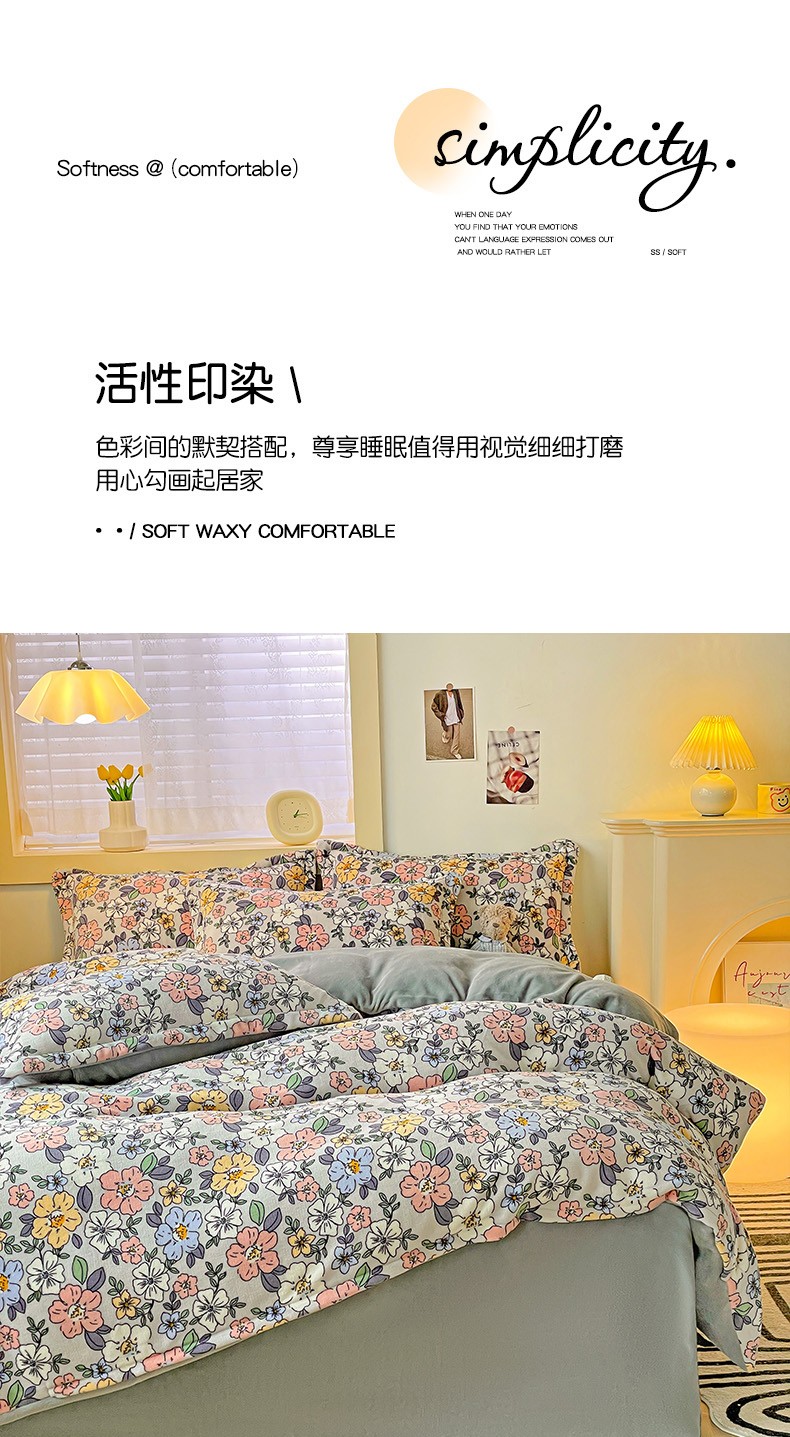 当前位置: 91家纺网 > 商品网购 > 床品套件 > 四件套 > 牛奶绒四件套 > 畅畅家纺 2023新款活性印花小清新AB版加厚高克重法莱绒牛奶绒四件套 雅菲
